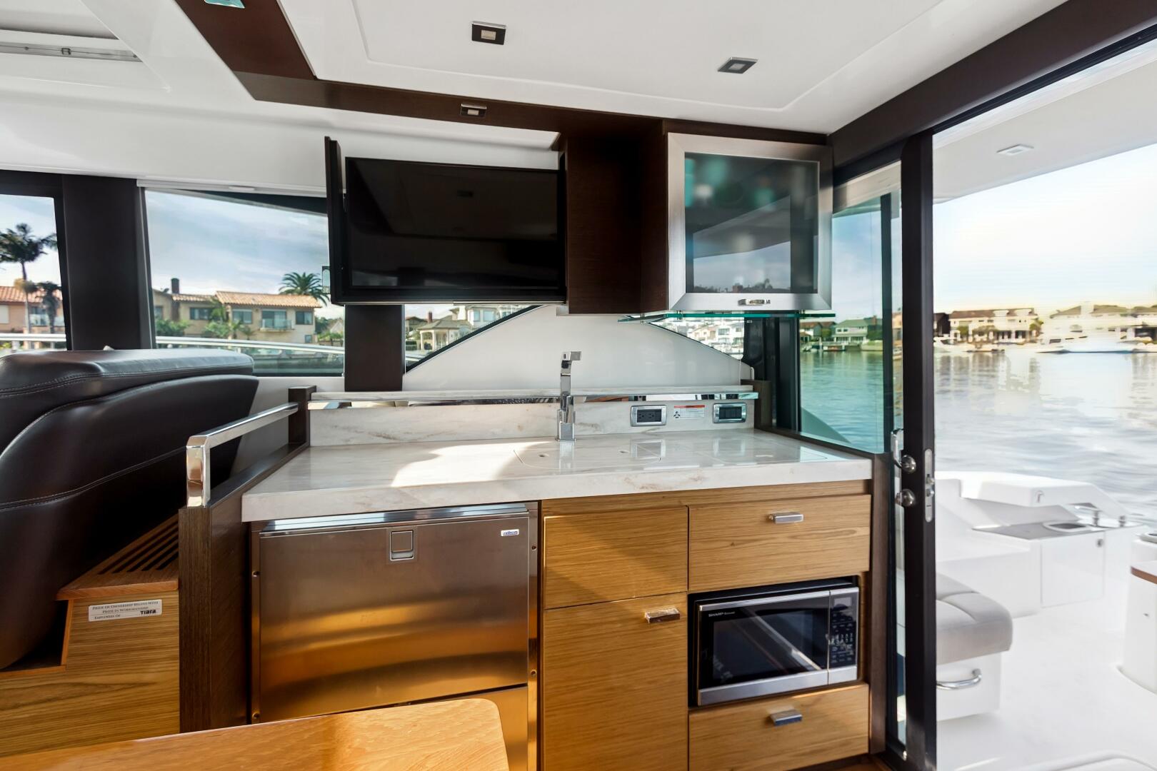 - Central galley with Corian countertops, two-burner electric cooktop, microwave/convection oven, and Isotherm drawer refrigerator/freezer.