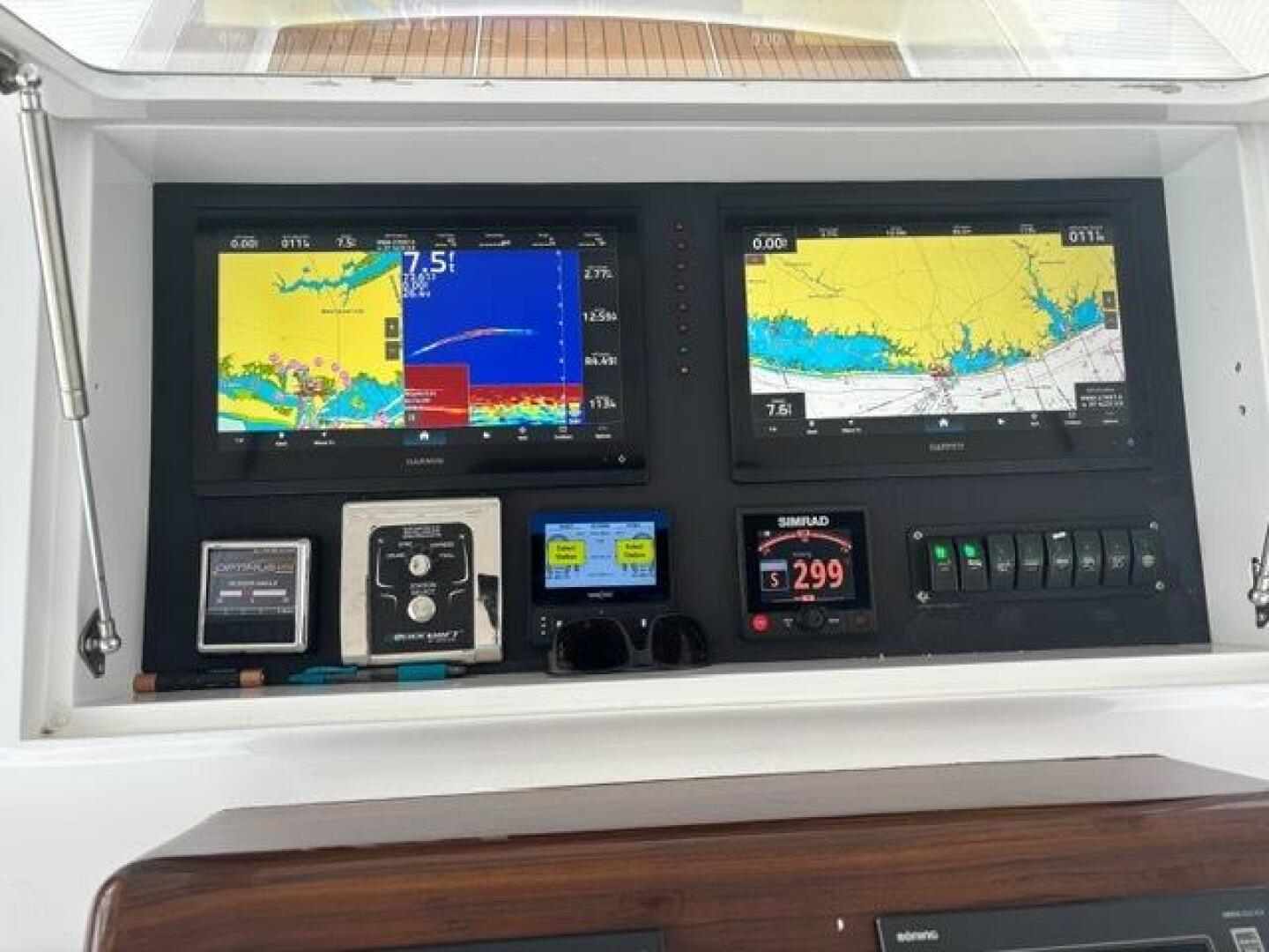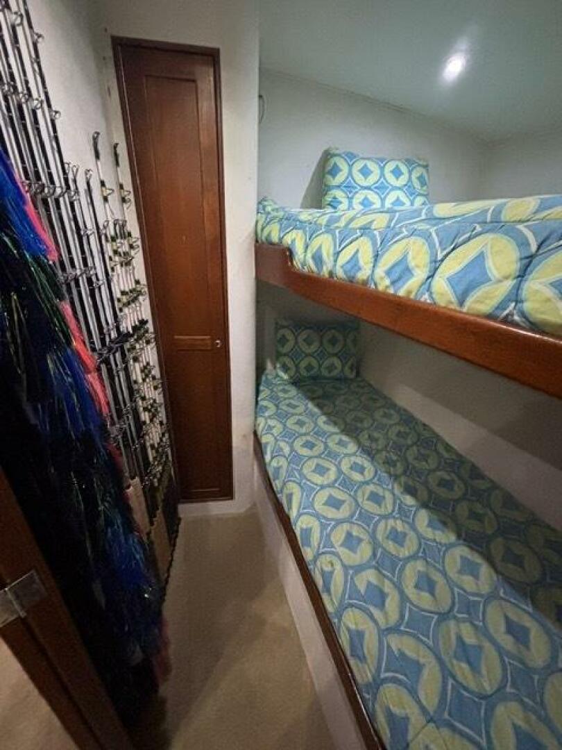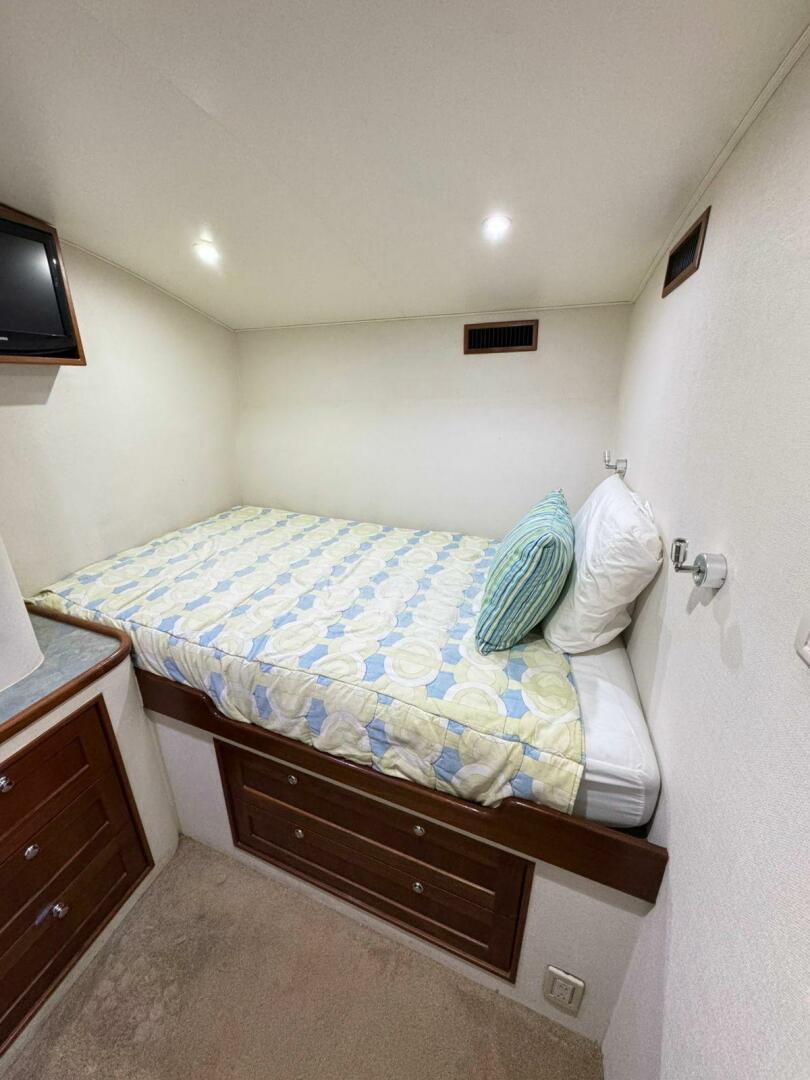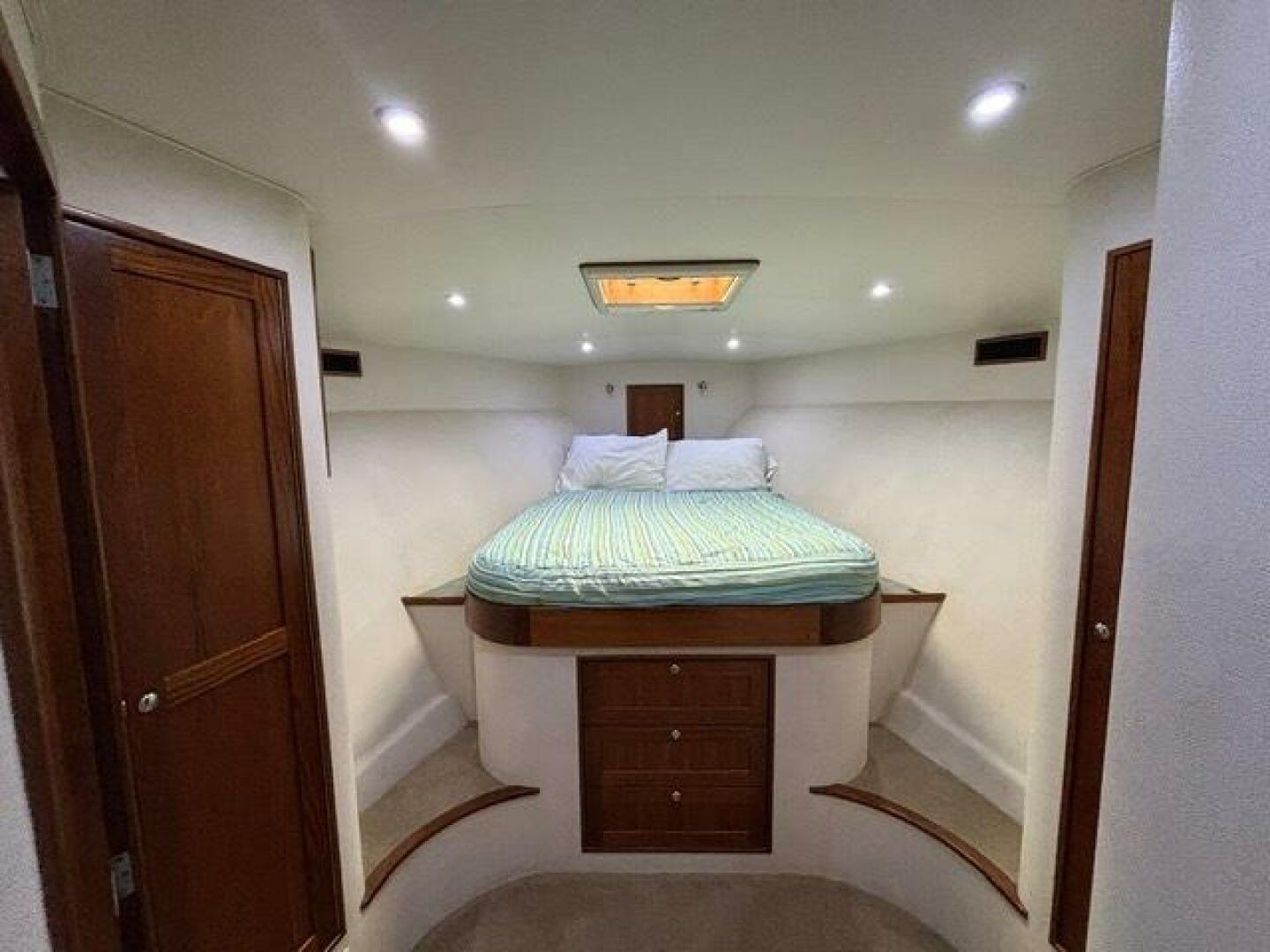 As you board the yacht, the first thing you notice are the beautiful lines, the shape, tumblehome and the attention to detail that Blackwell boats are known for. The teak cockpit deck and rolled cover boards lead to a wide mezzanine step deck, laid out for efficient storage of bait, drinks, ice and fishing equipment as well as easy access to the engine room. The automatic teak salon door is offset to starboard and as you enter the salon you immediately sense that this boat was built with comfort and practicality in mind. With a large L-shaped custom covered couch to port and an 8' linear couch to starboard, there is ample room to lounge about, watch TV or listen to the sound system while underway. To port forward is the galley, well appointed with all of the necessary storage, fixtures and appliances for day trips or travel. Teak trim, valances and cabinetry, custom laminate countertops with sea rails and window treatments round out a comfortable, ergonomic design. Down the teak veneered companionway to starboard is a roomy day head with teak and holly sole and shower. Forward of that to starboard is the crew's quarters with stacked bunks, storage drawers, hanging lockers and TV. The Master V-berth boasts a large stepped bed, it's own head with teak and holly sole and shower, storage drawers, hanging lockers and TV. Back to port, the guest stateroom offers a double bed set up with storage drawers, cabinets, hanging locker and TV. All rooms have lockable teak doors, teak trim, carpet, recessed lighting and soft tone textured wallpaper.
