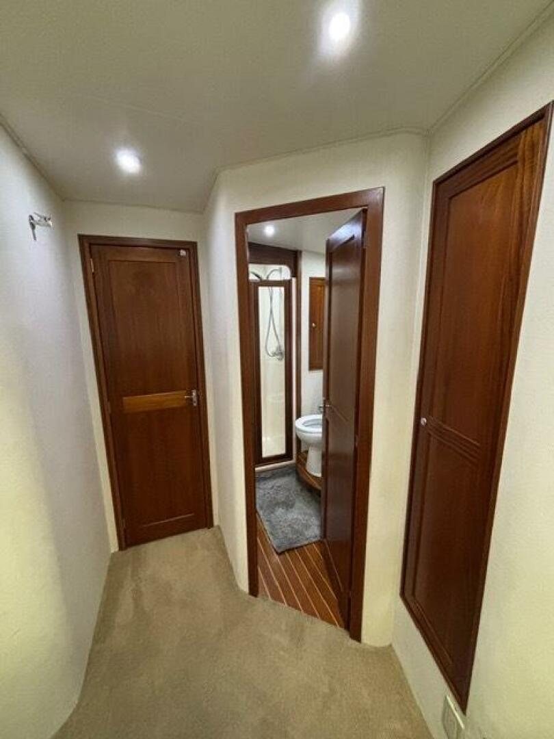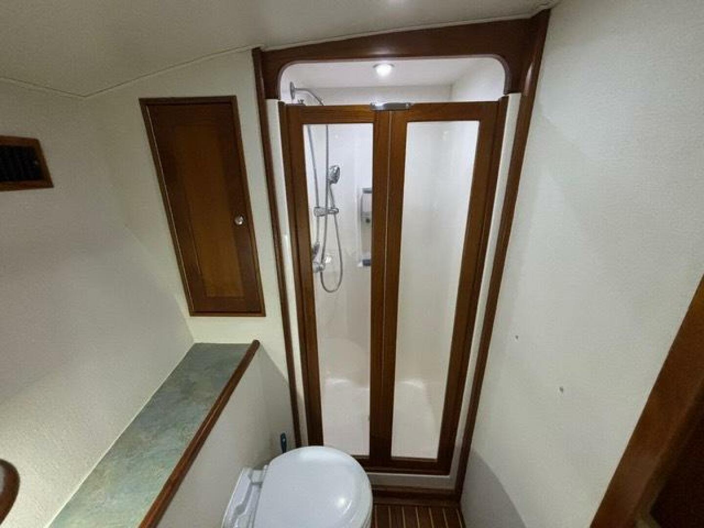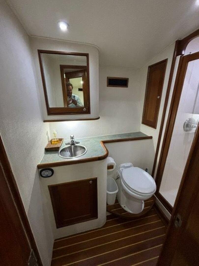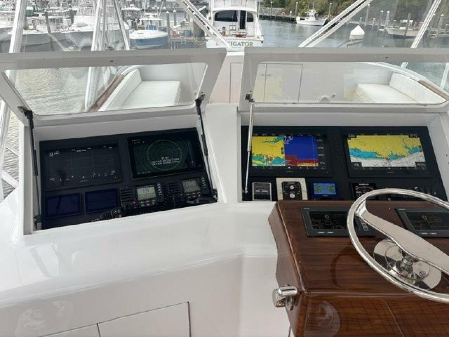 As you board the yacht, the first thing you notice are the beautiful lines, the shape, tumblehome and the attention to detail that Blackwell boats are known for. The teak cockpit deck and rolled cover boards lead to a wide mezzanine step deck, laid out for efficient storage of bait, drinks, ice and fishing equipment as well as easy access to the engine room. The automatic teak salon door is offset to starboard and as you enter the salon you immediately sense that this boat was built with comfort and practicality in mind. With a large L-shaped custom covered couch to port and an 8' linear couch to starboard, there is ample room to lounge about, watch TV or listen to the sound system while underway. To port forward is the galley, well appointed with all of the necessary storage, fixtures and appliances for day trips or travel. Teak trim, valances and cabinetry, custom laminate countertops with sea rails and window treatments round out a comfortable, ergonomic design. Down the teak veneered companionway to starboard is a roomy day head with teak and holly sole and shower. Forward of that to starboard is the crew's quarters with stacked bunks, storage drawers, hanging lockers and TV. The Master V-berth boasts a large stepped bed, it's own head with teak and holly sole and shower, storage drawers, hanging lockers and TV. Back to port, the guest stateroom offers a double bed set up with storage drawers, cabinets, hanging locker and TV. All rooms have lockable teak doors, teak trim, carpet, recessed lighting and soft tone textured wallpaper.