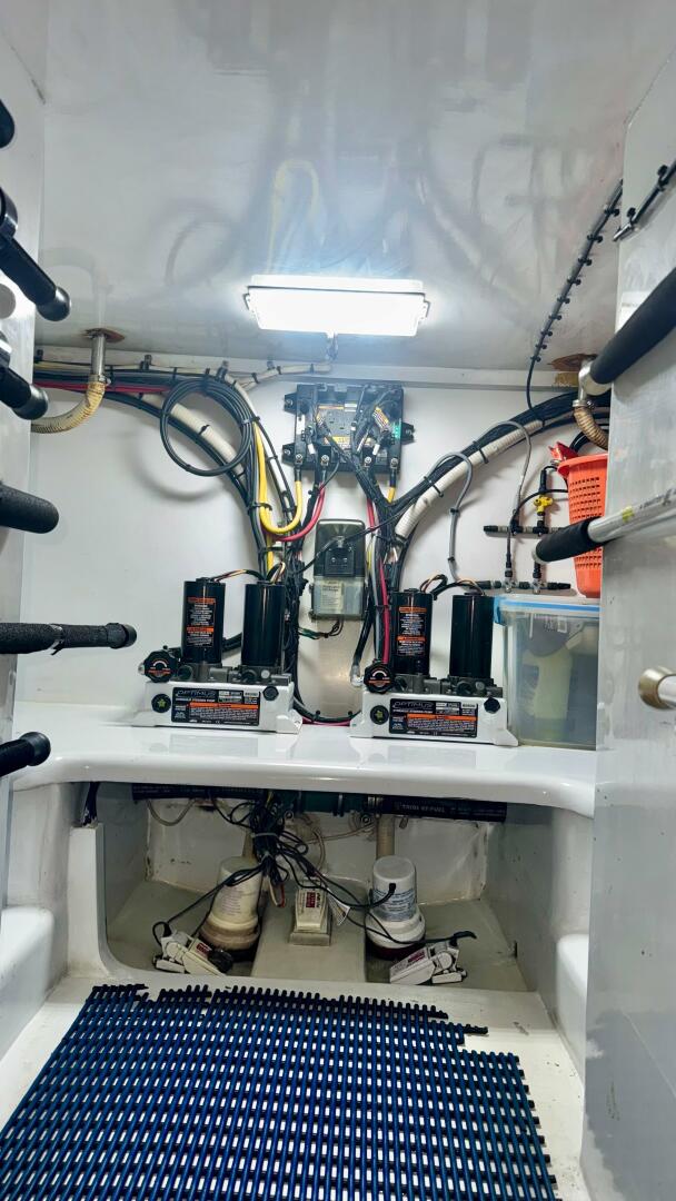 Mezzanine Boxes, cushioned with internal SS liner. Ice dump bin, Custom bait freezer, bait box with FW, extra deep storage/drink/ice box under ladder