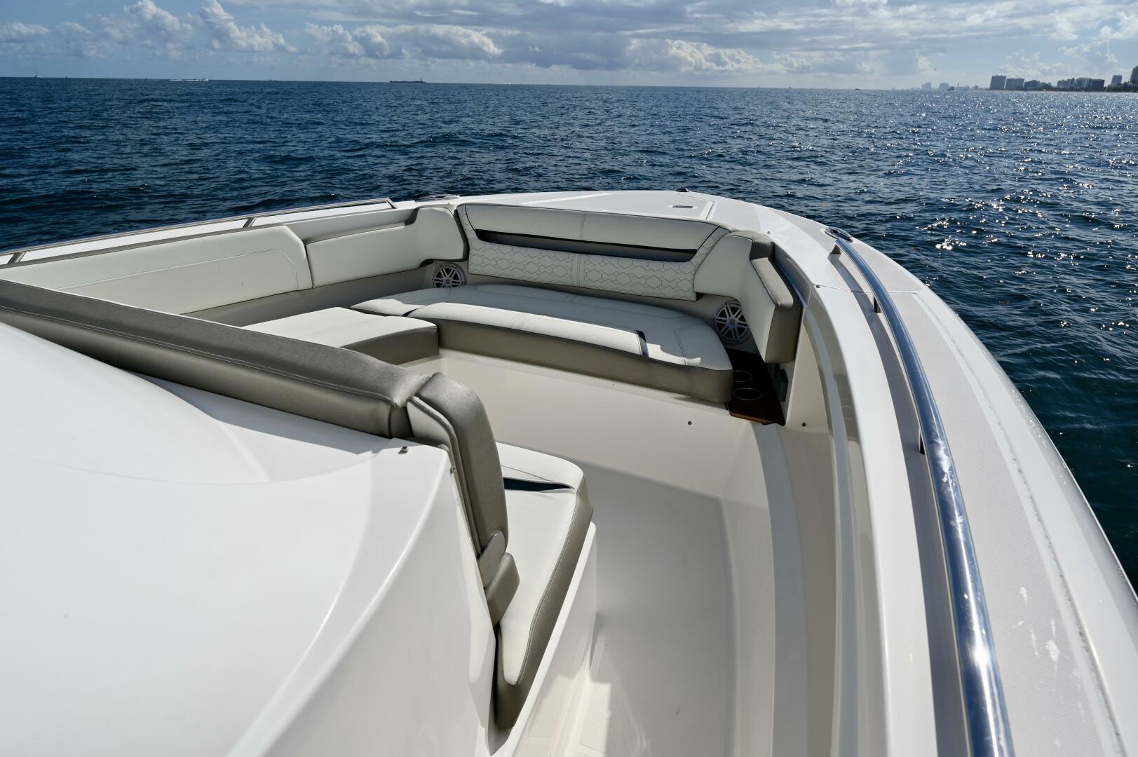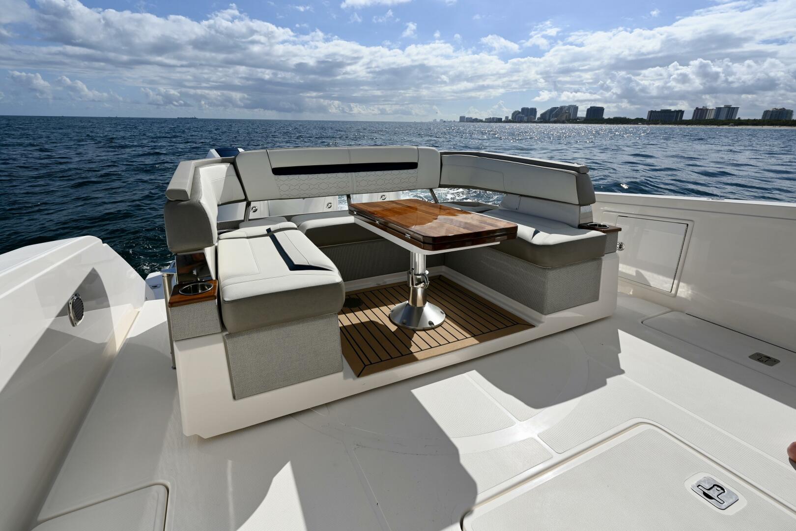 Designed with entertaining and versatility in mind, the cockpit features rotating aft lounge seating, generous social space, and a well-appointed wet bar with grill, refrigeration, and sink. Comfortable bow seating creates an additional lounge area forward, while the clean, modern helm offers excellent visibility, intuitive controls, and seating for three with air-conditioned comfort. Below deck, refined accommodations with quality finishes, smart storage, and inviting spaces make overnight stays and extended weekends equally enjoyable.
