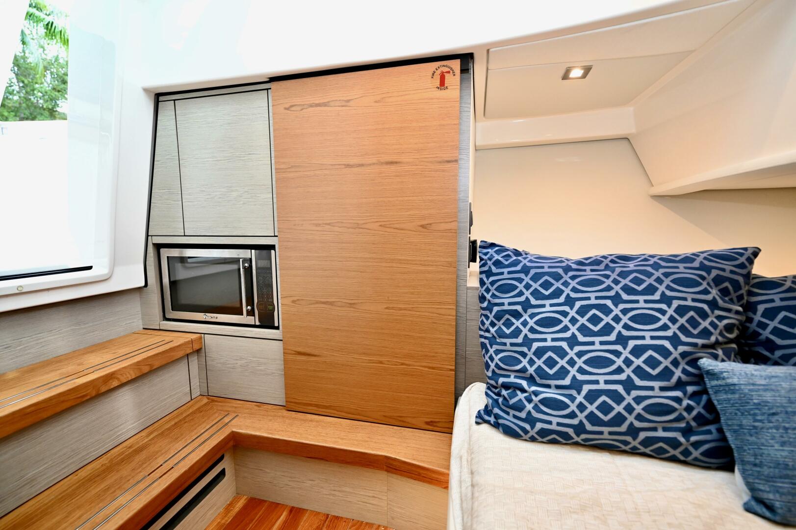 Access to the cabin is located to the port side of the helm via a plexiglass sliding door, with three steps leading down into the cabin. As you step below, the electrical panel is conveniently positioned on the port side for easy access and monitoring.