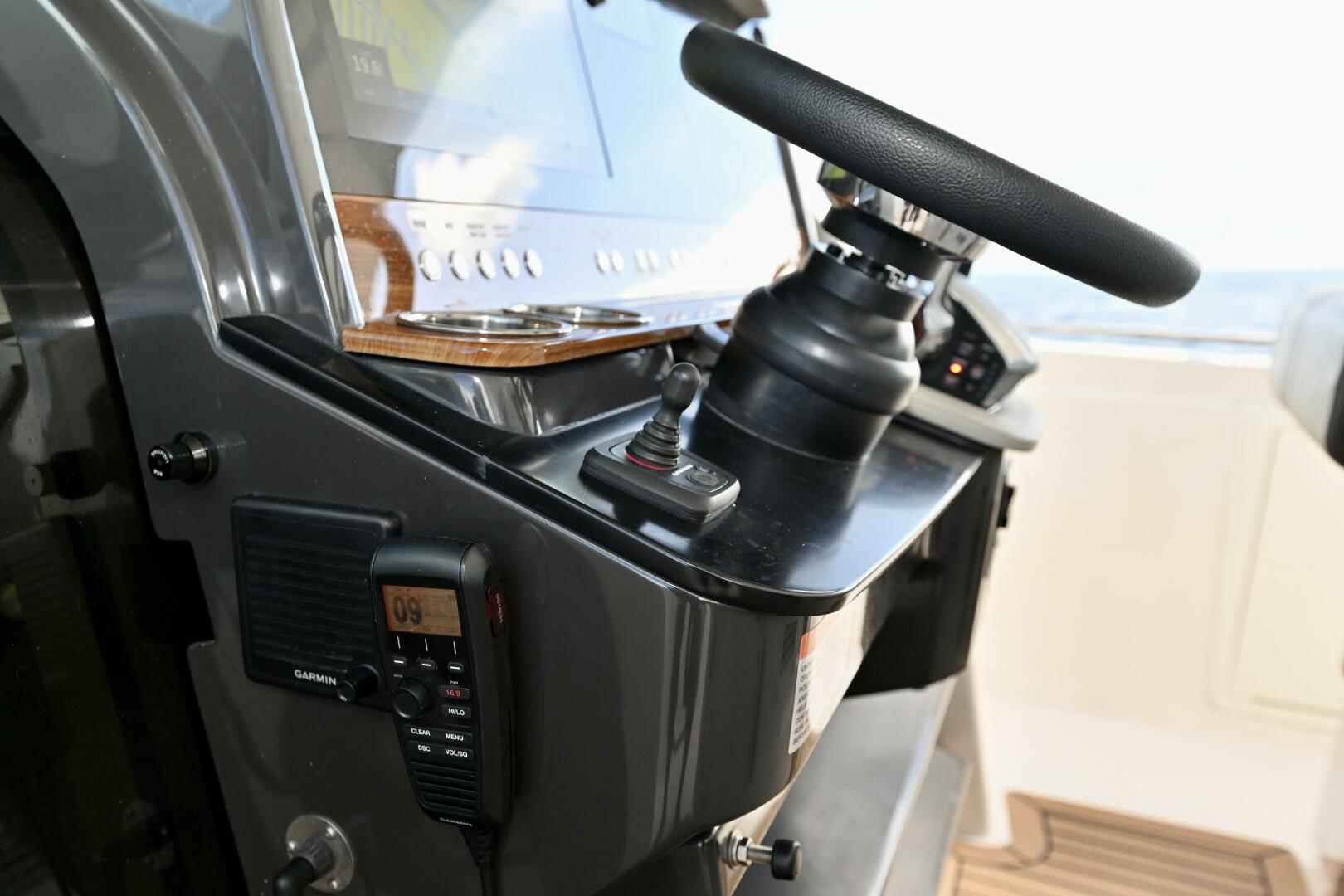 The helm features a clean, centerline layout with excellent visibility and intuitive control placement. Seating for three with supportive bolsters ensures comfort underway, while integrated air-conditioning vents keep the area cool on hot days.
