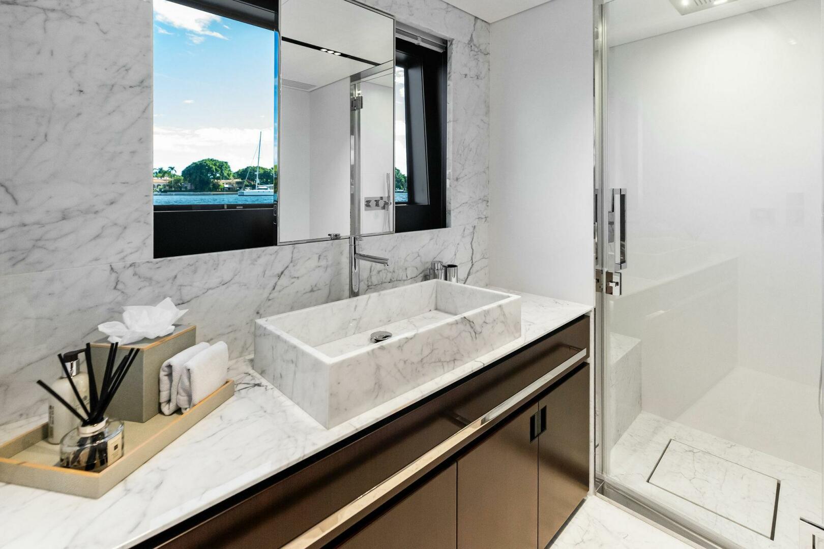 OWNER’S SUITE: A substantial full-beam owner’s suite, with a private lounge and a study area. Extensive glazed surfaces highlight the abundance of natural light offering magnificent panoramic views.