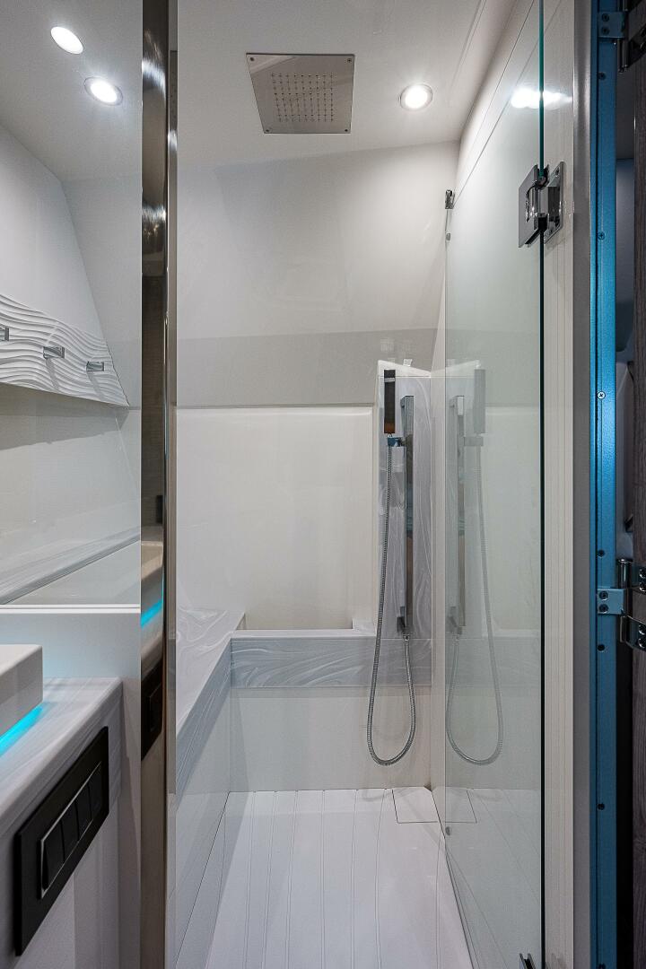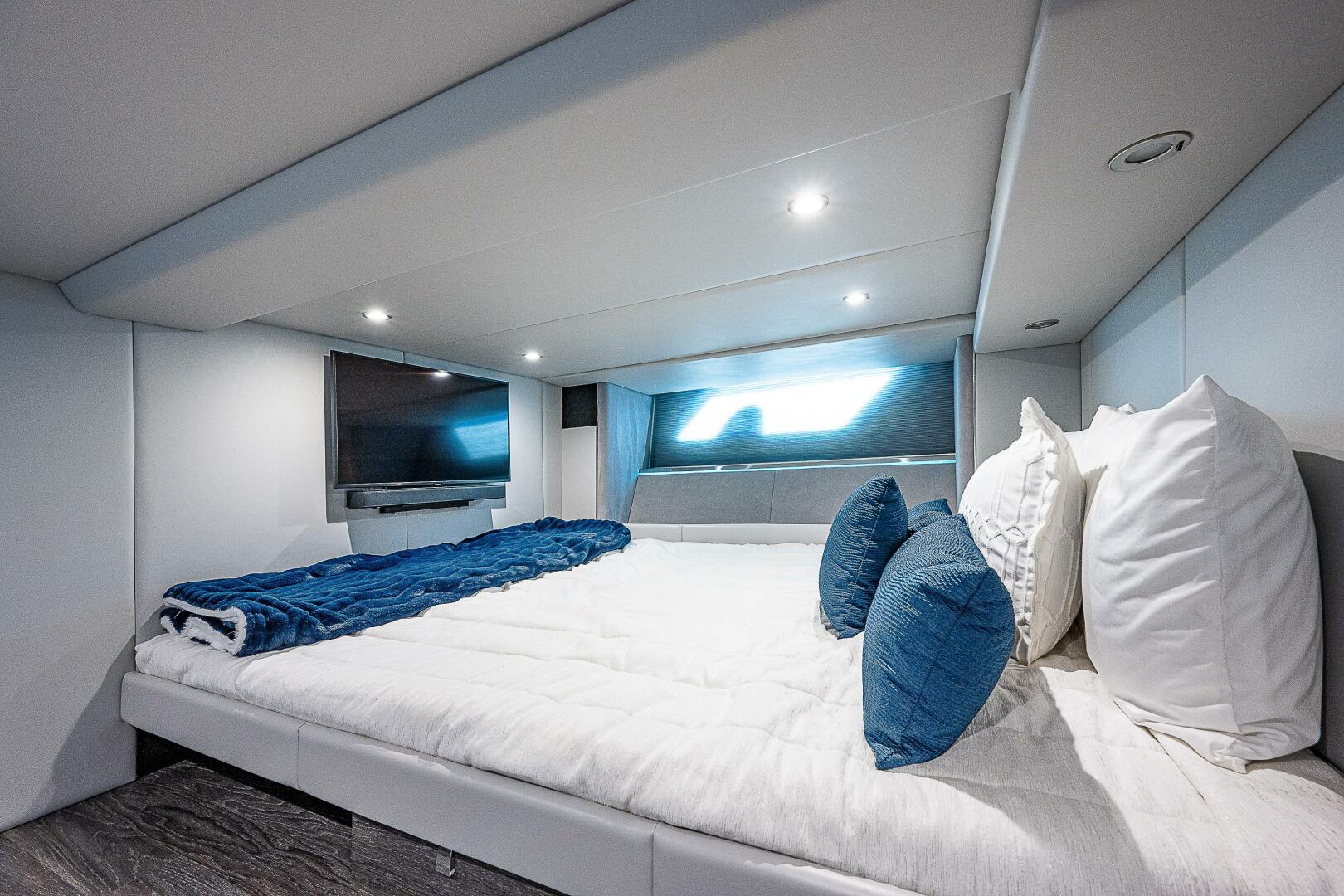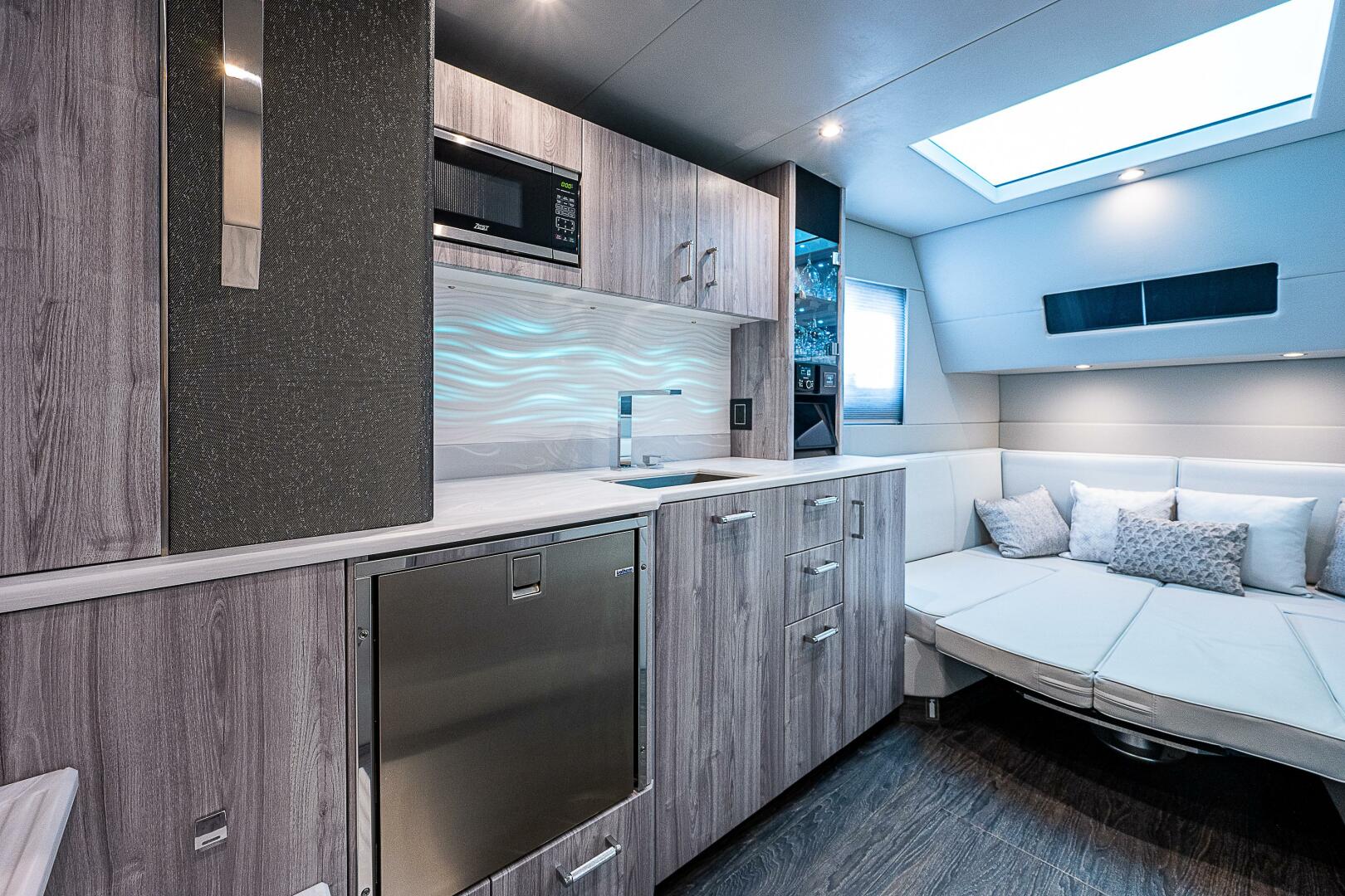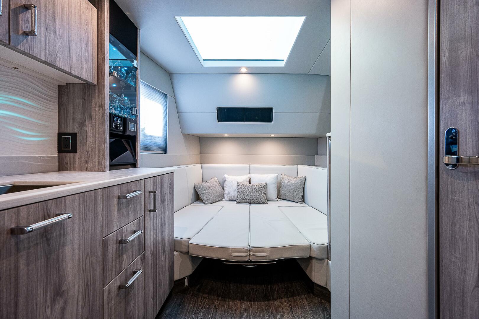 The 500 SSC amenities below offer a respite from the outside world with a true cabin experience. A complete galley at the cabin entry stairs, the large convertible U-lounge forward, a head with Corian surfacing, vanity sink and spacious shower create a residential feel. Slip aft to the separate stateroom with queen-size berth, sofa and complete entertainment suite.