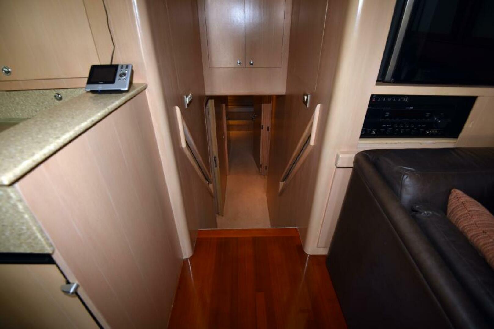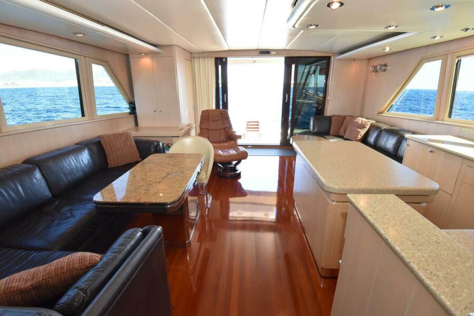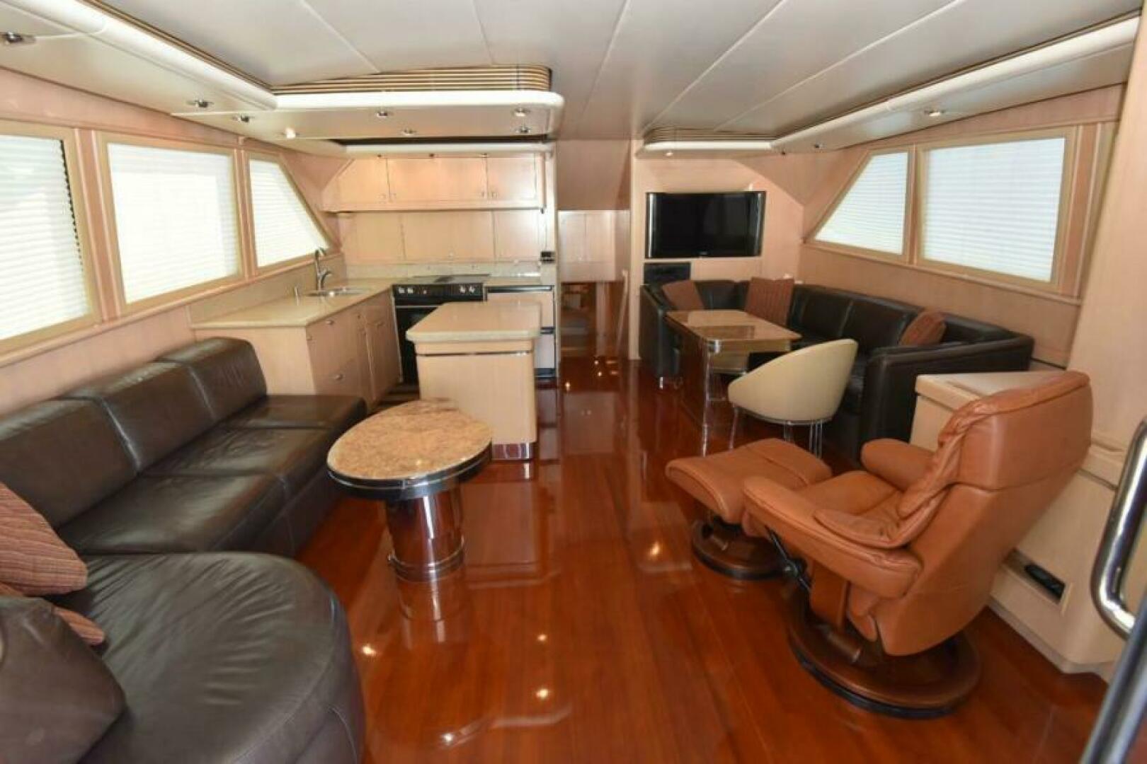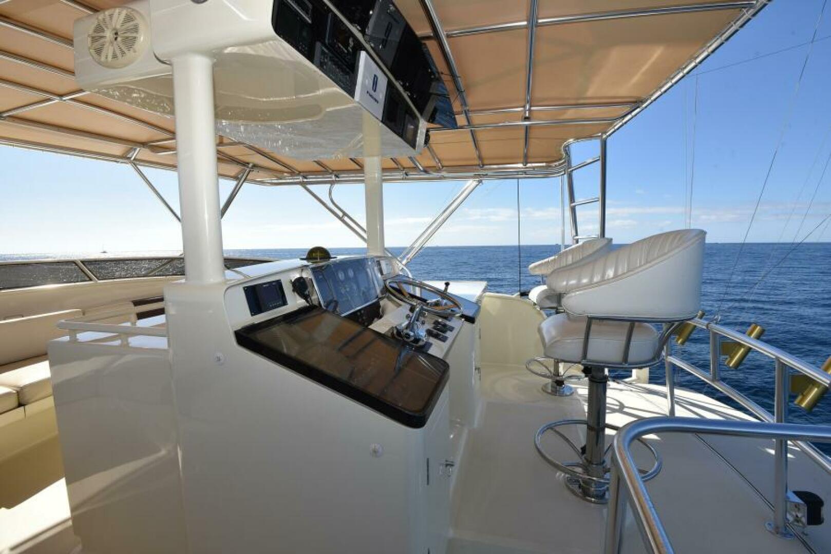 "TALISMAN" has been completely refurbished, in and out. The interior is stunning, upon entering the salon through automatic doors which creates a 6' wide passageway and combines the cockpit and salon into one huge indoor/outdoor unit, the first thing you'll notice are the polished teak flooring throughout. The interior is huge, with 6'8" headroom and with full advantage taken of the 21' beam. New countertops & cabinetry in the galley. Custom dinette with table and seating for (7-8), Galley Island for extra counter space. There is a Dayhead in the salon with access from both salon and cockpit. Sleeps 6 in 3 stateroom, 4 head layout. Large Master forward with King berth, VIP stateroom to starboard with double berth and bunk room to port, each with ensuite head and shower. The Master stateroom forward has a centerline King berth, His & Hers hanging lockers, custom teak flooring around berth, head with shower with enclosure and head. The VIP is well appointed with double berth, hanging locker & drawer storage, wall covering, ensuite head with shower. The Guest stateroom to port has upper & lower berths with upper being a Pullman, ensuite head and shower, desk and reading lights. Up to the huge open bridge which has seating for 12 people and extremely comfortable with great visibility!