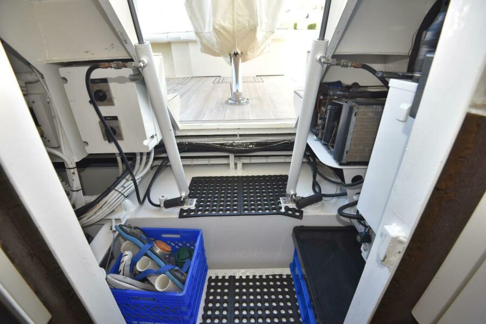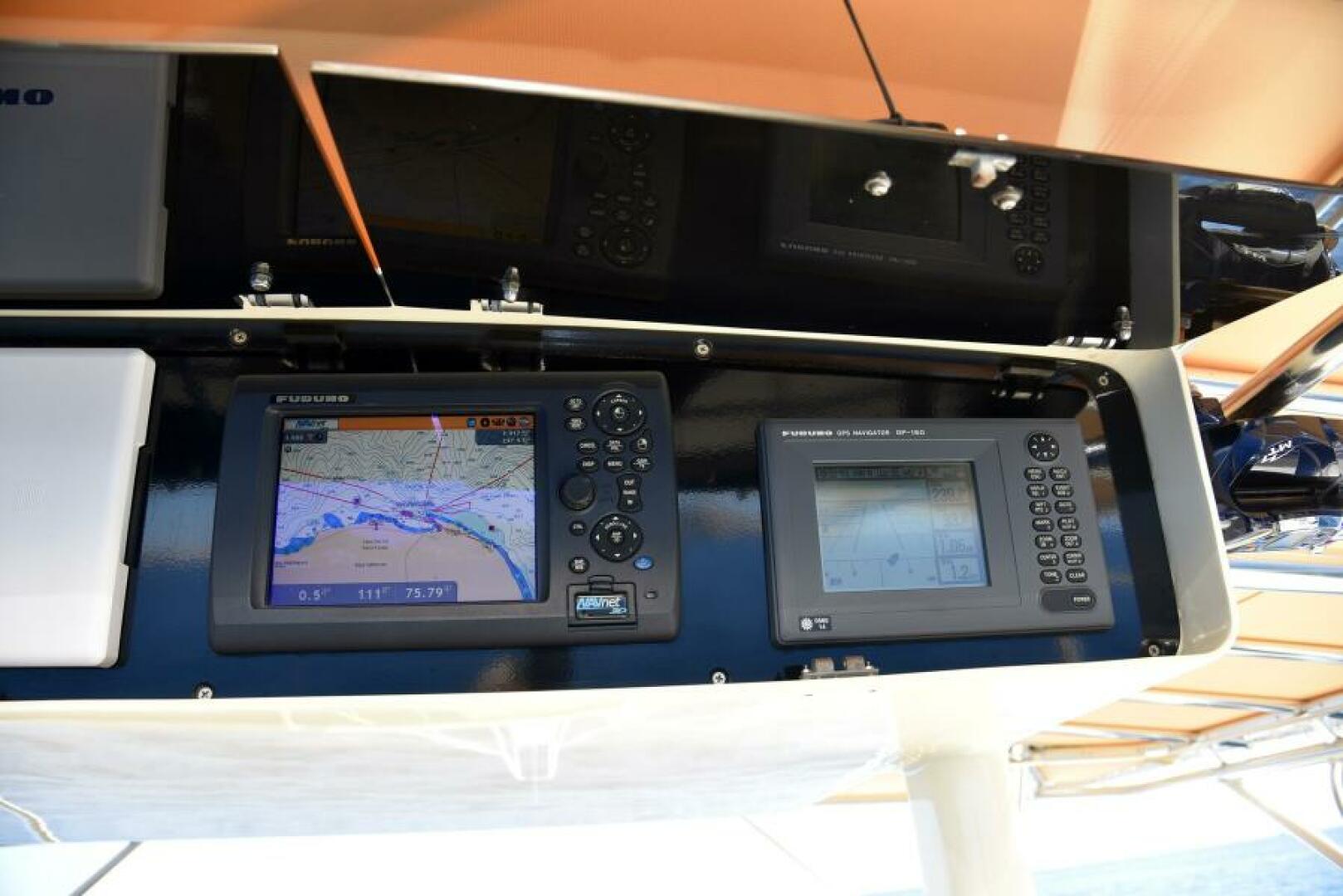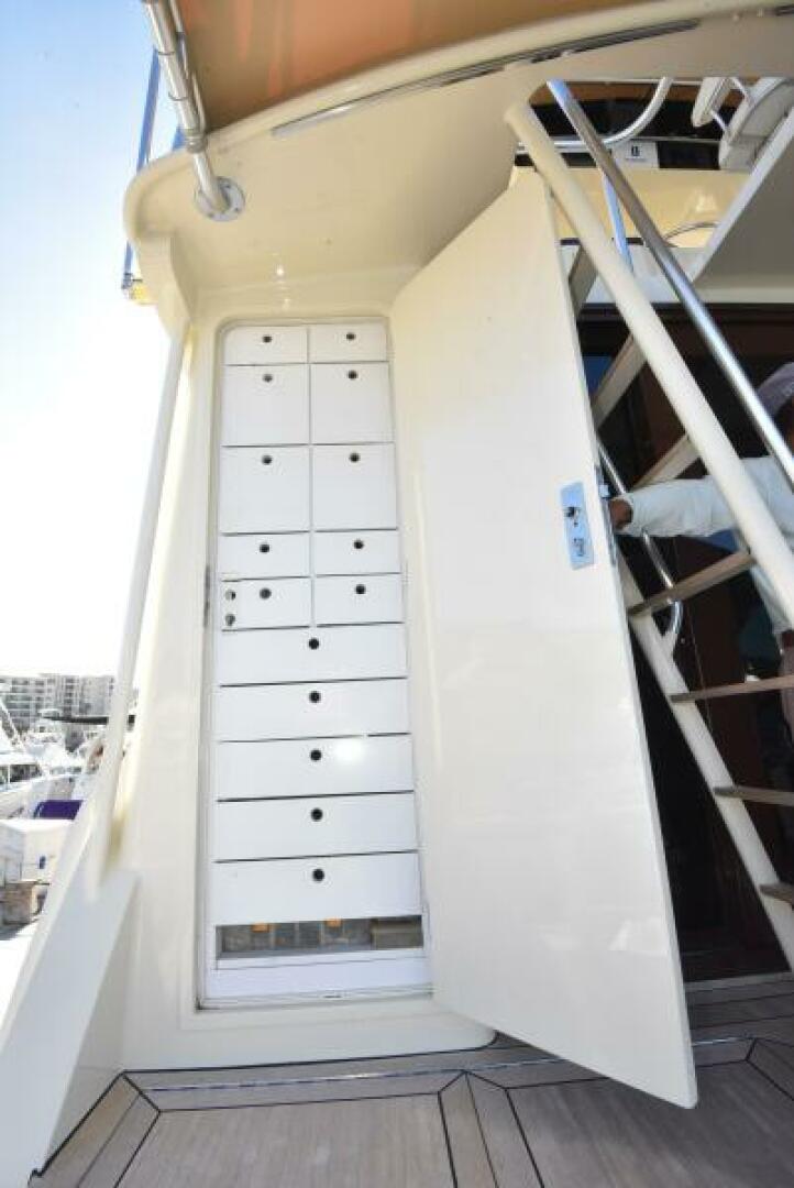 The large cockpit is a combat zone built to do battle with the toughest fighters in the sea. Fresh water/Saltwater wash down, bait-prep area, tackle locker, engine controls, 2 freezers, icemaker and a handy day head. Extensive rod and gear storage under coamings, and huge vertical portside. Cockpit steps hydraulically lift for access to engine room.
