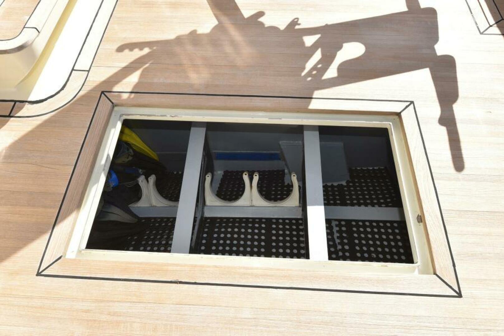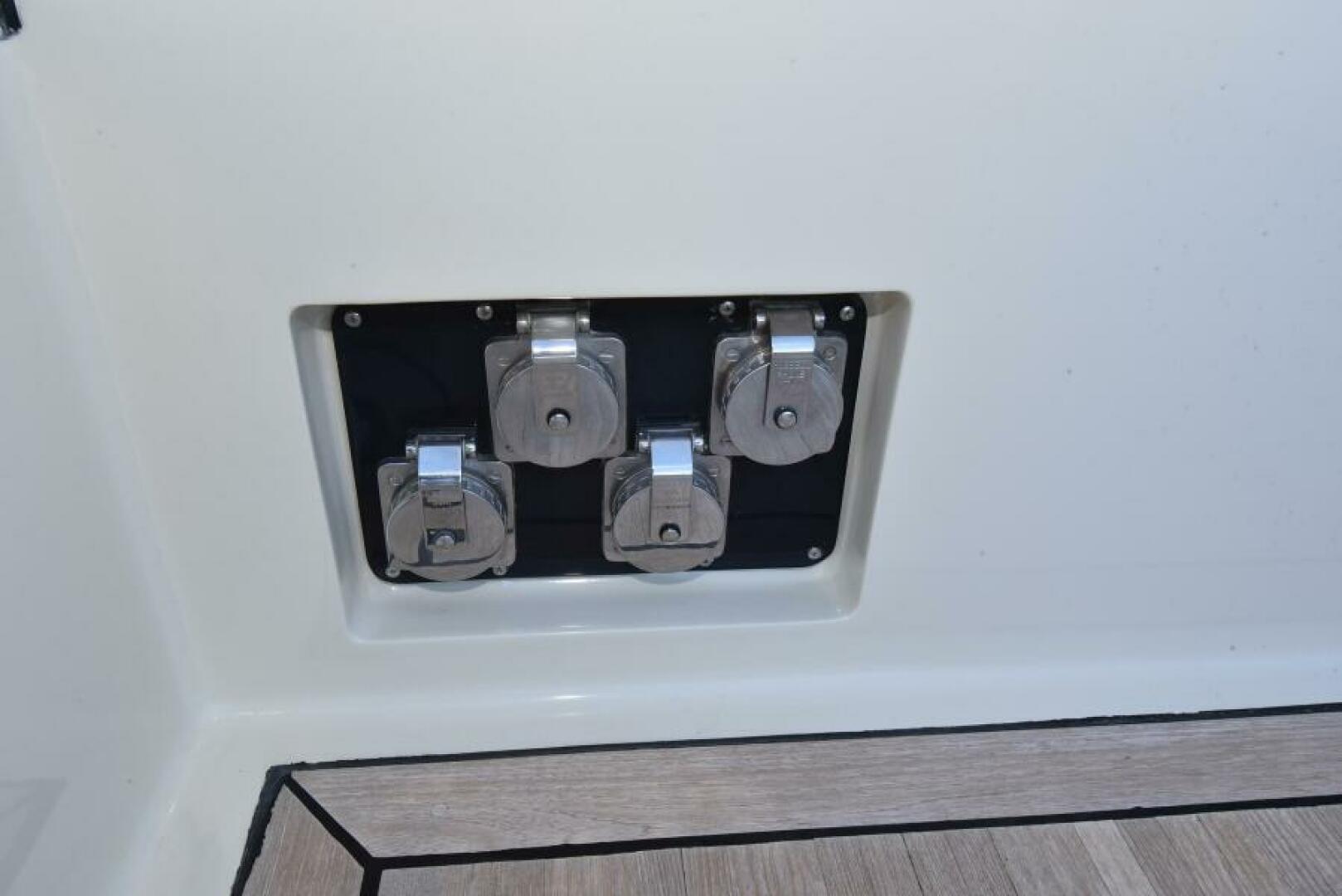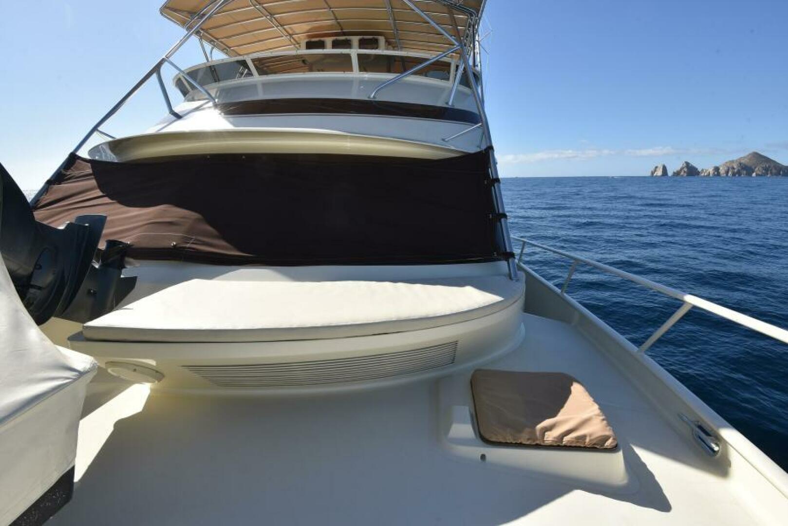 The large cockpit is a combat zone built to do battle with the toughest fighters in the sea. Fresh water/Saltwater wash down, bait-prep area, tackle locker, engine controls, 2 freezers, icemaker and a handy day head. Extensive rod and gear storage under coamings, and huge vertical portside. Cockpit steps hydraulically lift for access to engine room.