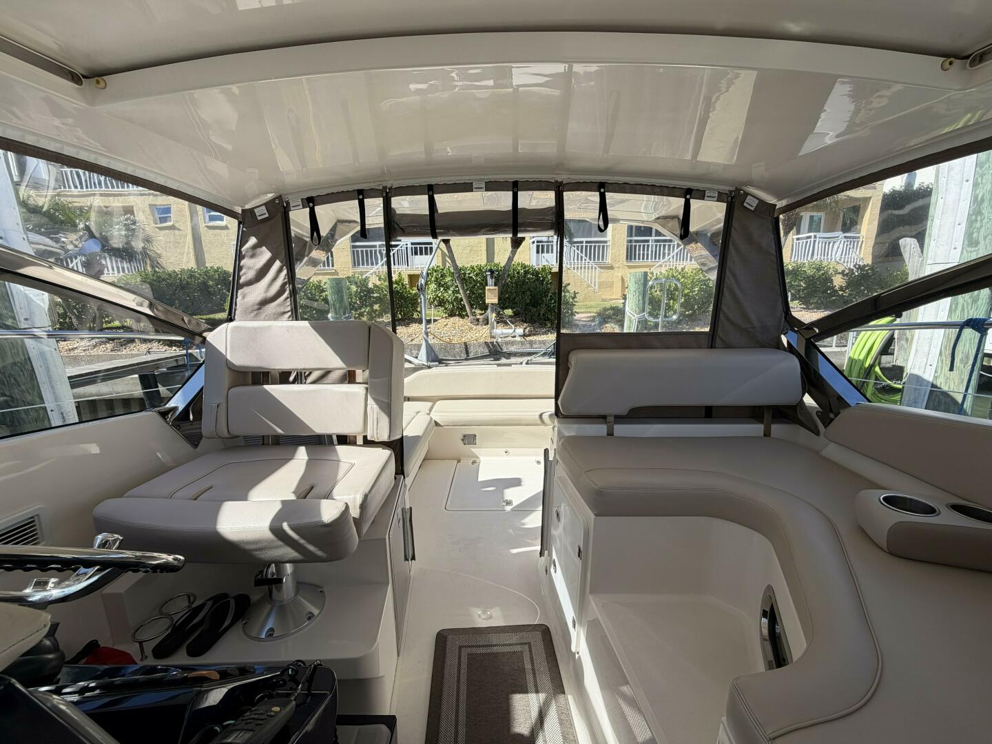 The sleek, modern profile includes an enclosed, climate-controlled helm with outstanding visibility, large opening windows, and a sliding sunroof—allowing you to enjoy fresh air on calm days while remaining fully protected when conditions change. Seamless access between the helm and cockpit makes this layout ideal for cruising, entertaining, or extended time on the water.