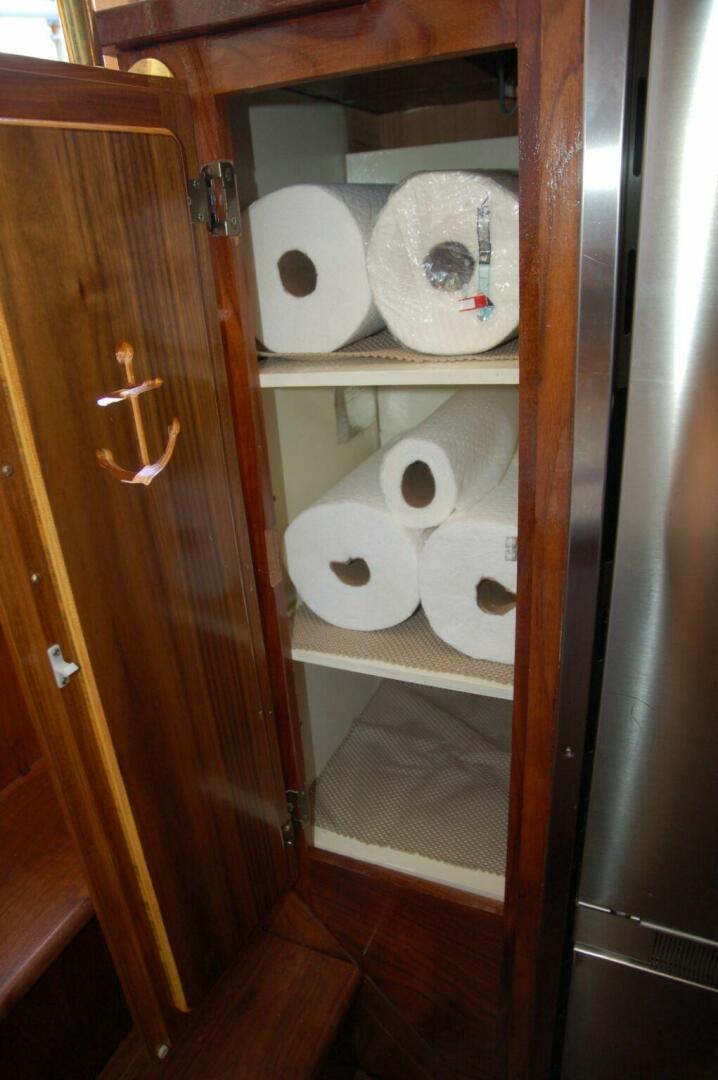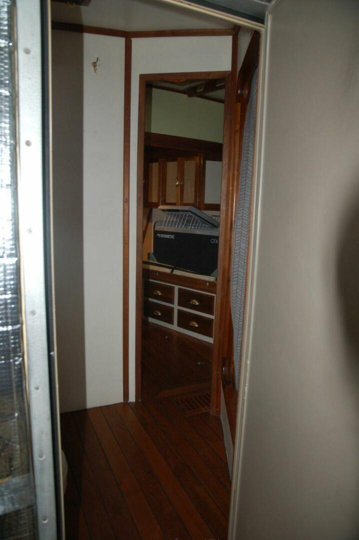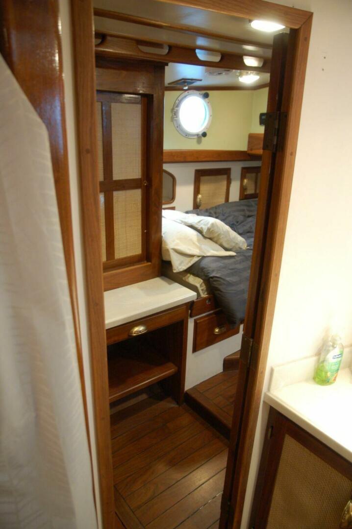 The forward stateroom is down five steps from the pilothouse. A long cabinet with hanging locker and shelves is to starboard and aft. The “V” berths measures 6’ 6” long by 24” wide. An infill could be fitted for those wanting a wide double berth in this space. A portable chest freezer is currently stored on the starboard berth but could be removed or relocated. Cabinets are above the berths and drawers and bins are below. A double door cabinet is forward. A washer/dryer was previously located in this space and could easily be reinstalled. Aft to port is a cabinet with shelves above a counter with drawer and cabinet with three sliding drawers.