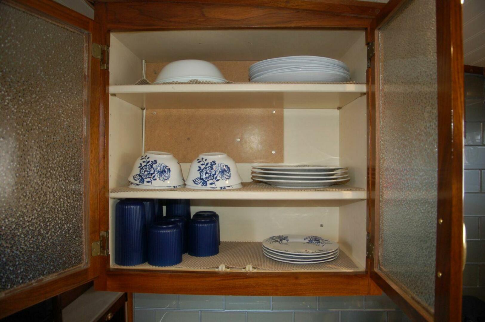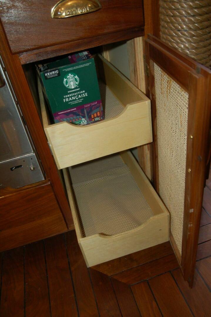 - New small cabinet door in galley with new shelves