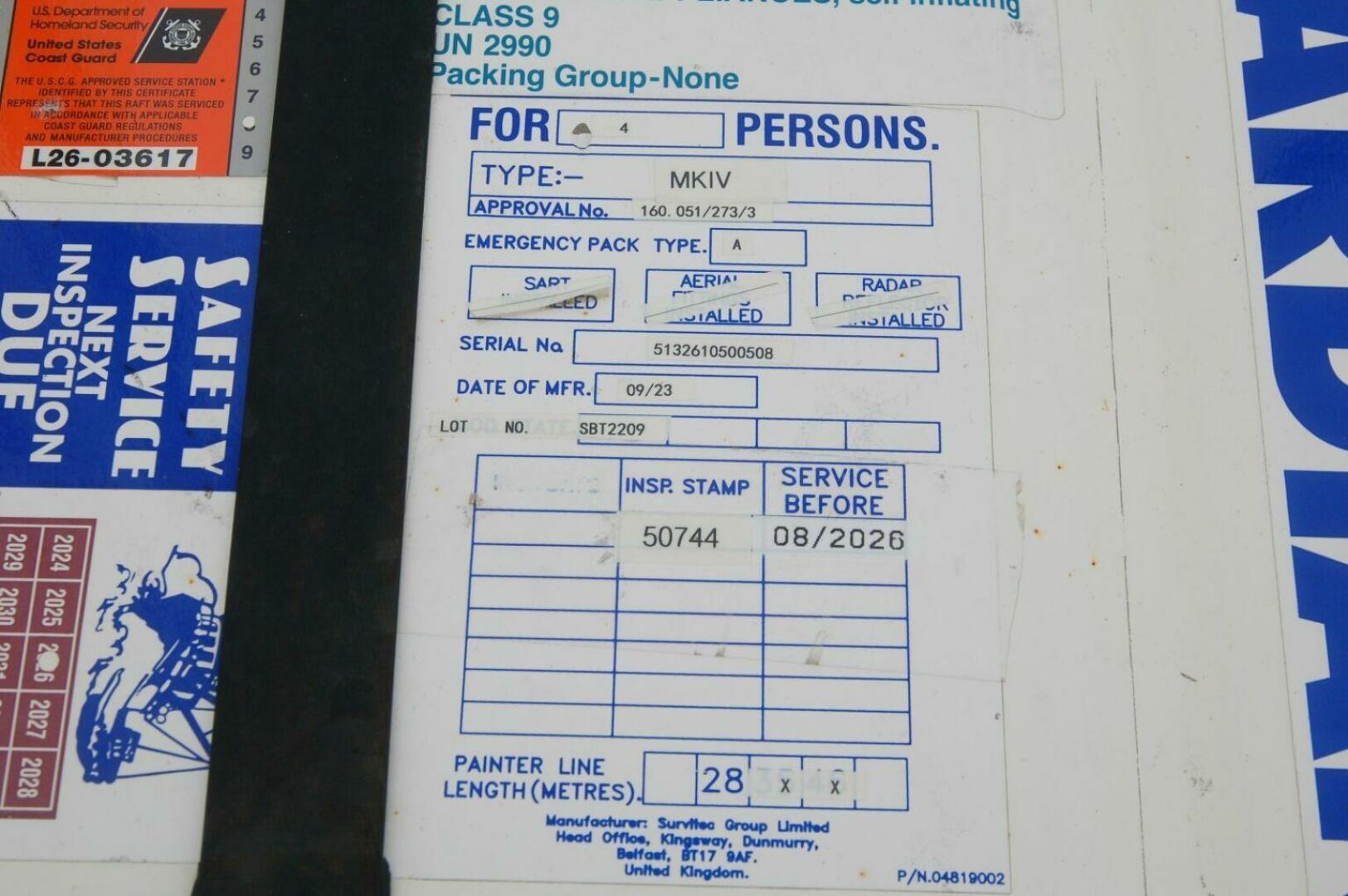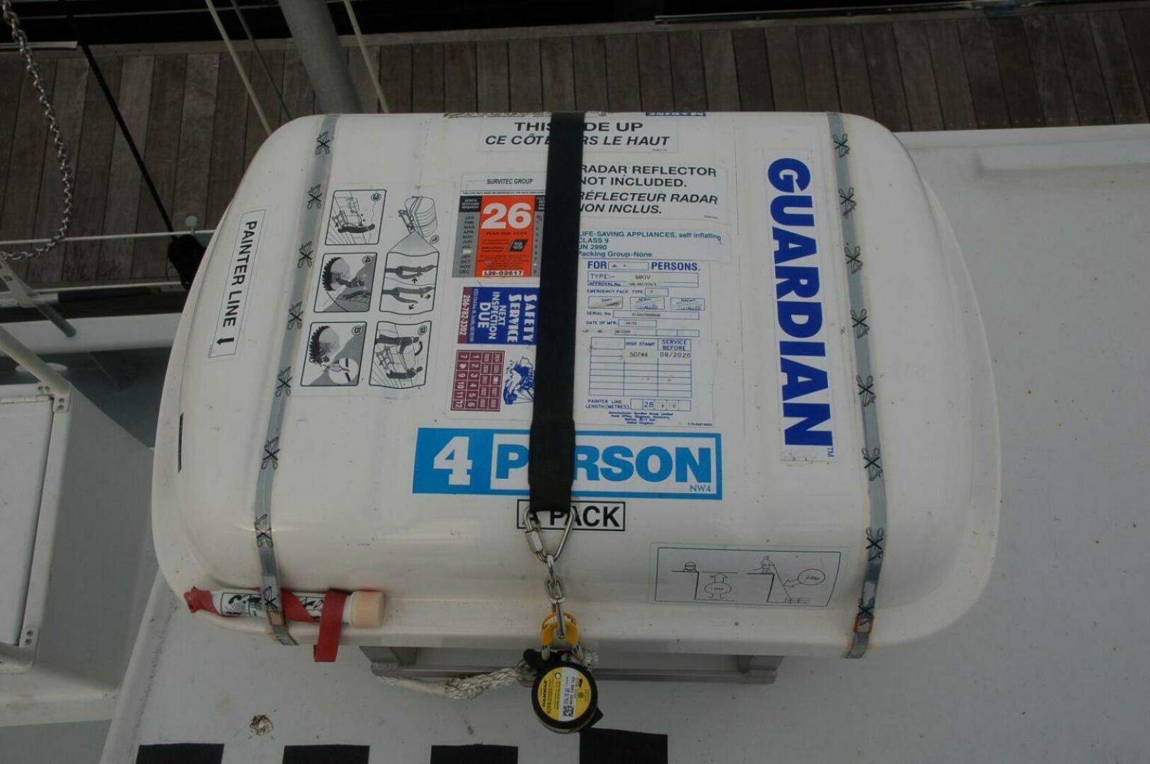 - Guardian 4 person liferaft in aluminum cradle atop pilothouse (mfg 9/23, next service 8/26)