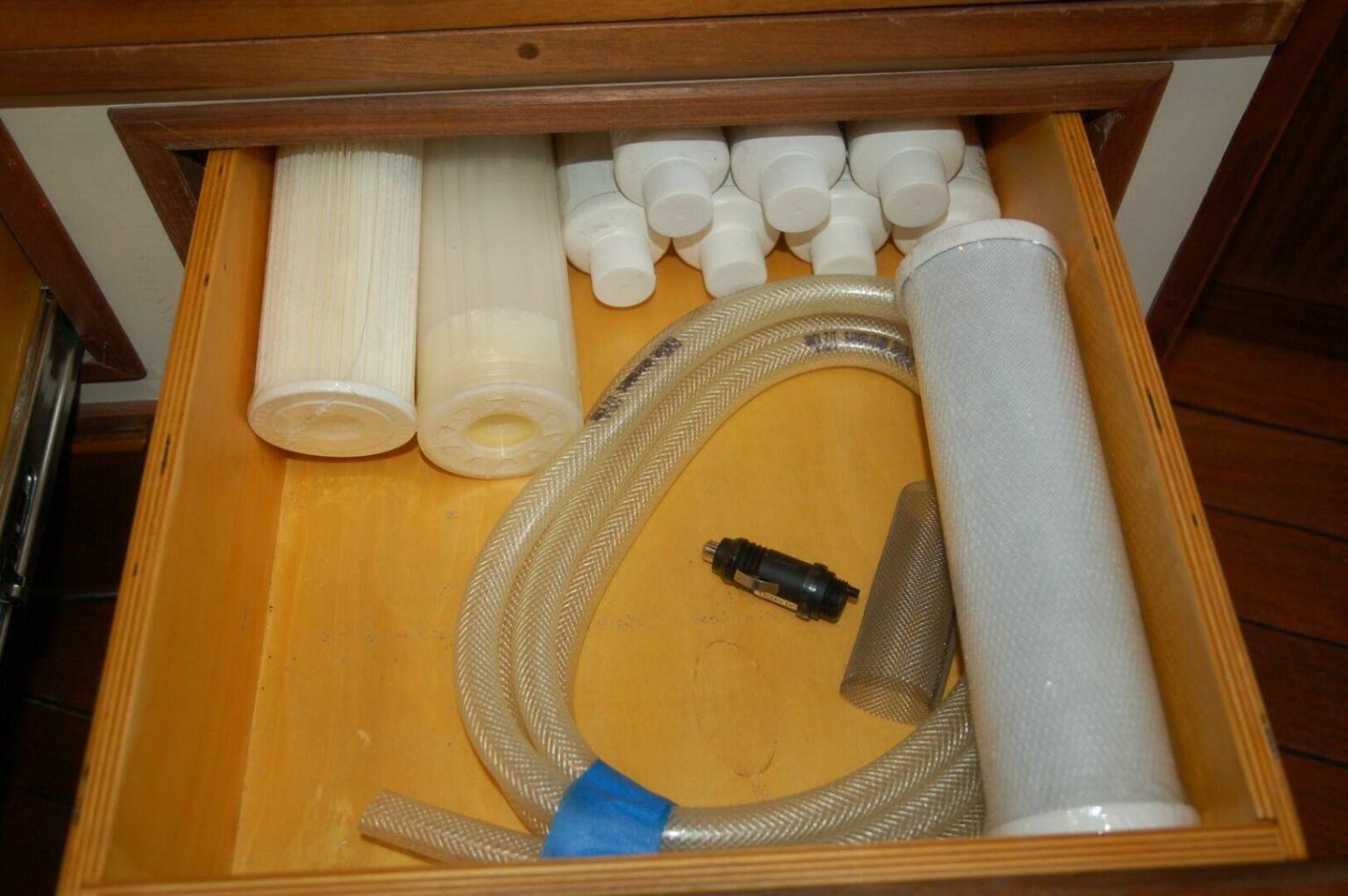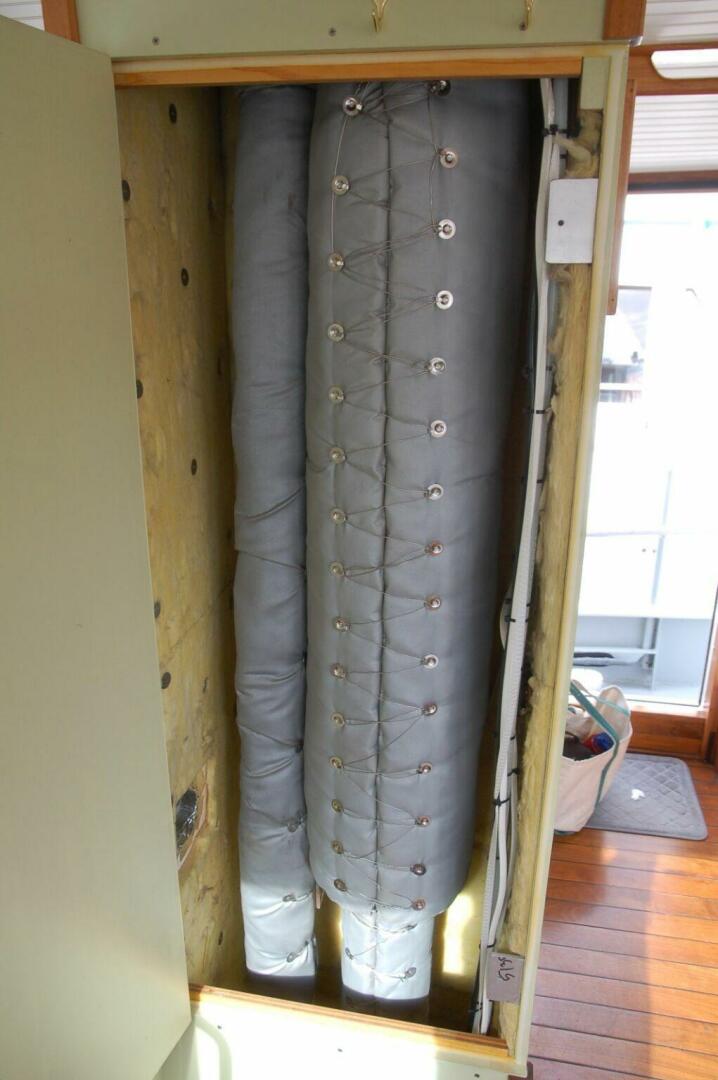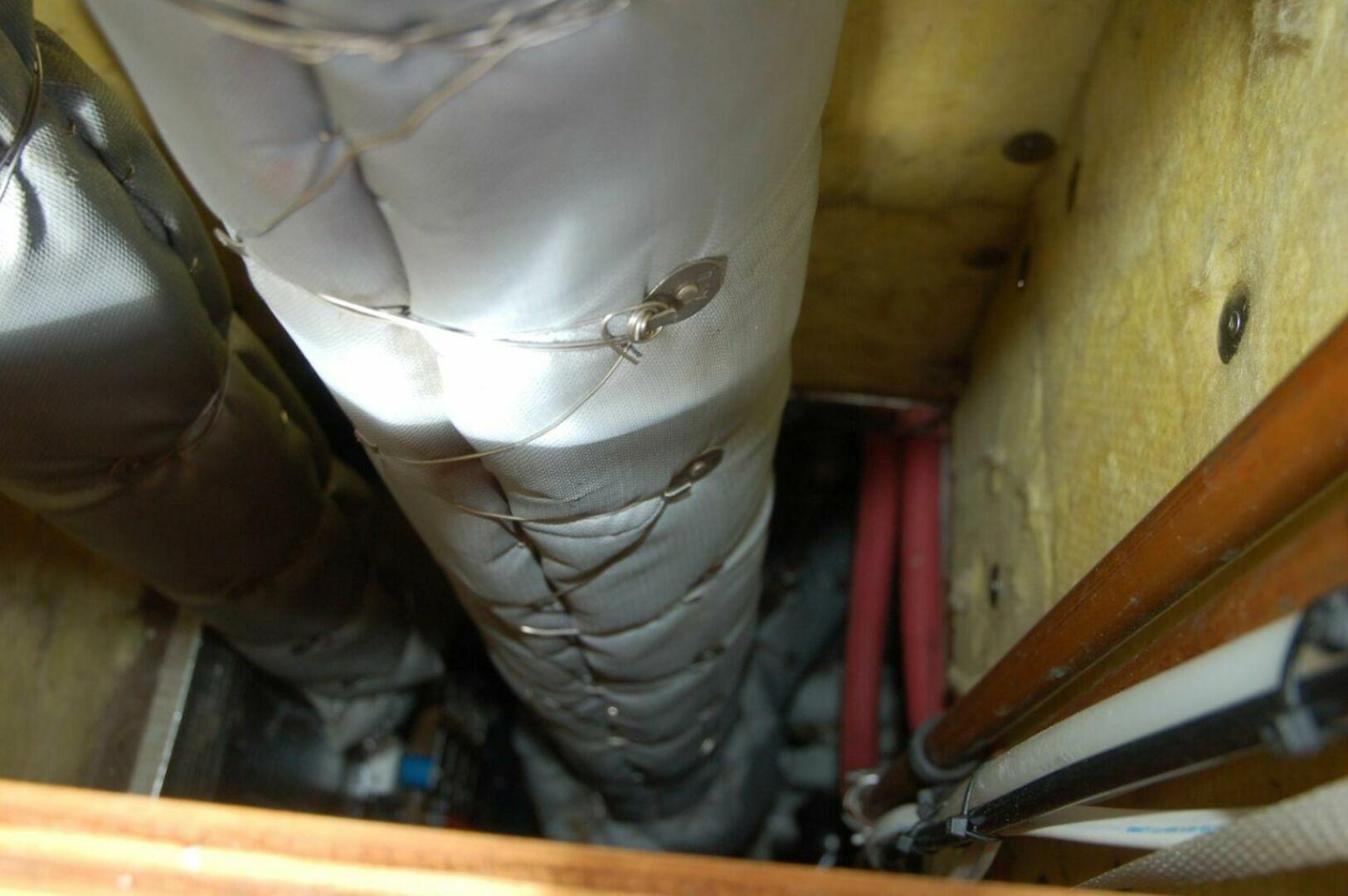 A Northern Lights 10kw genset is to starboard of the main engine and housed in a sound enclosure. An extra layer of acoustic insulation was recently added to this enclosure. The genset uses a sea water pump for cooling with exhaust injection and a water separator on the exhaust to minimize noise. The Echotec watermaker is outboard of the genset mounted up high on the hull size. The Webasto furnace, start and service batteries are forward and aft of the genset.