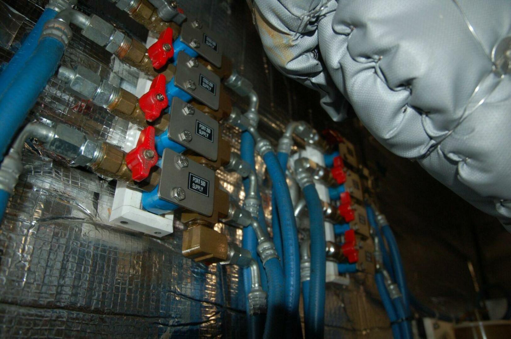 All machinery was selected for maximum dependability and ease of maintenance. Bronze Groco though hull valves are flange-mounted on steel pipes with insulating rubber gaskets. Wherever possible, pumps and other equipment is soft-mounted to minimize noise.