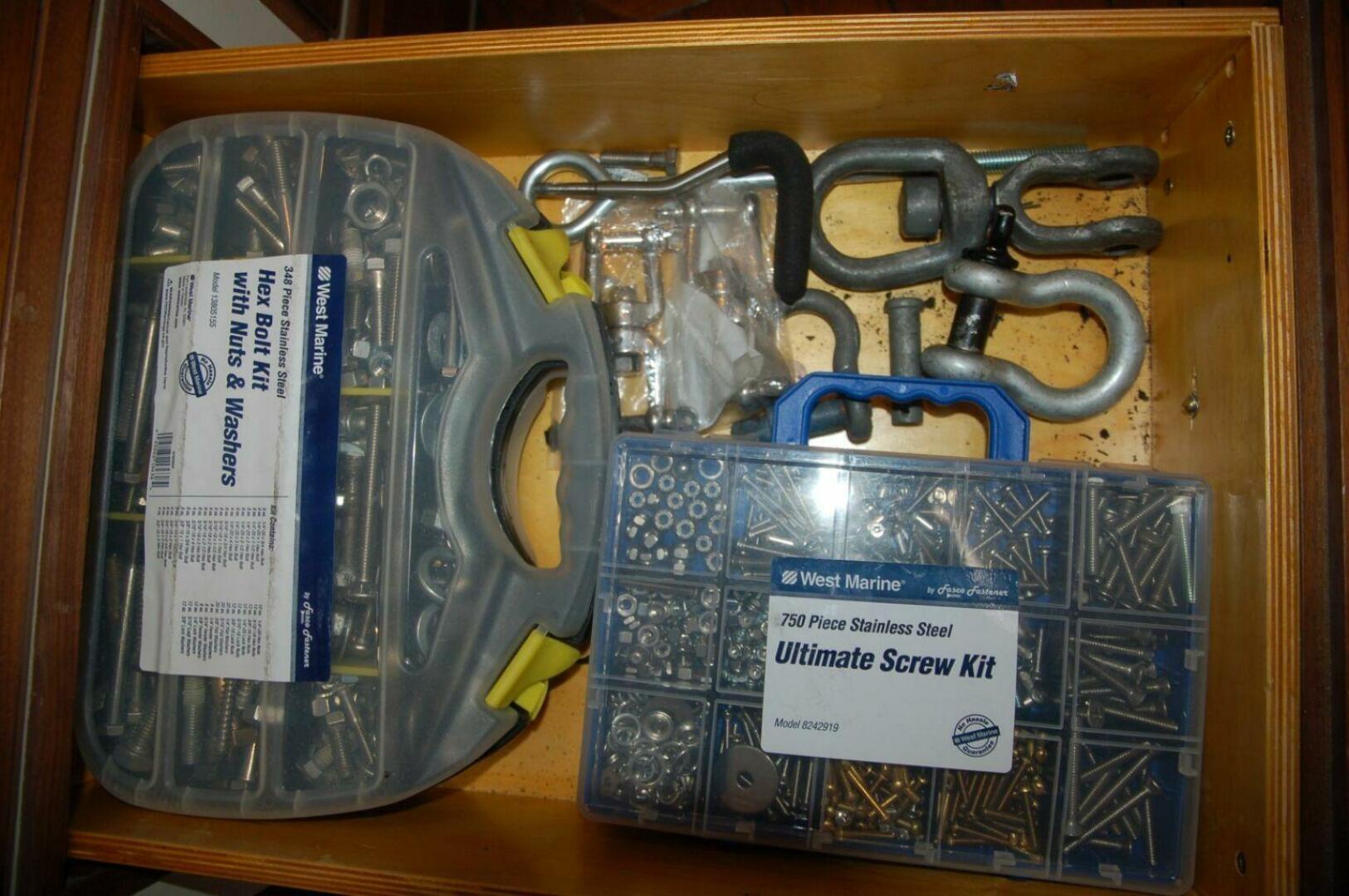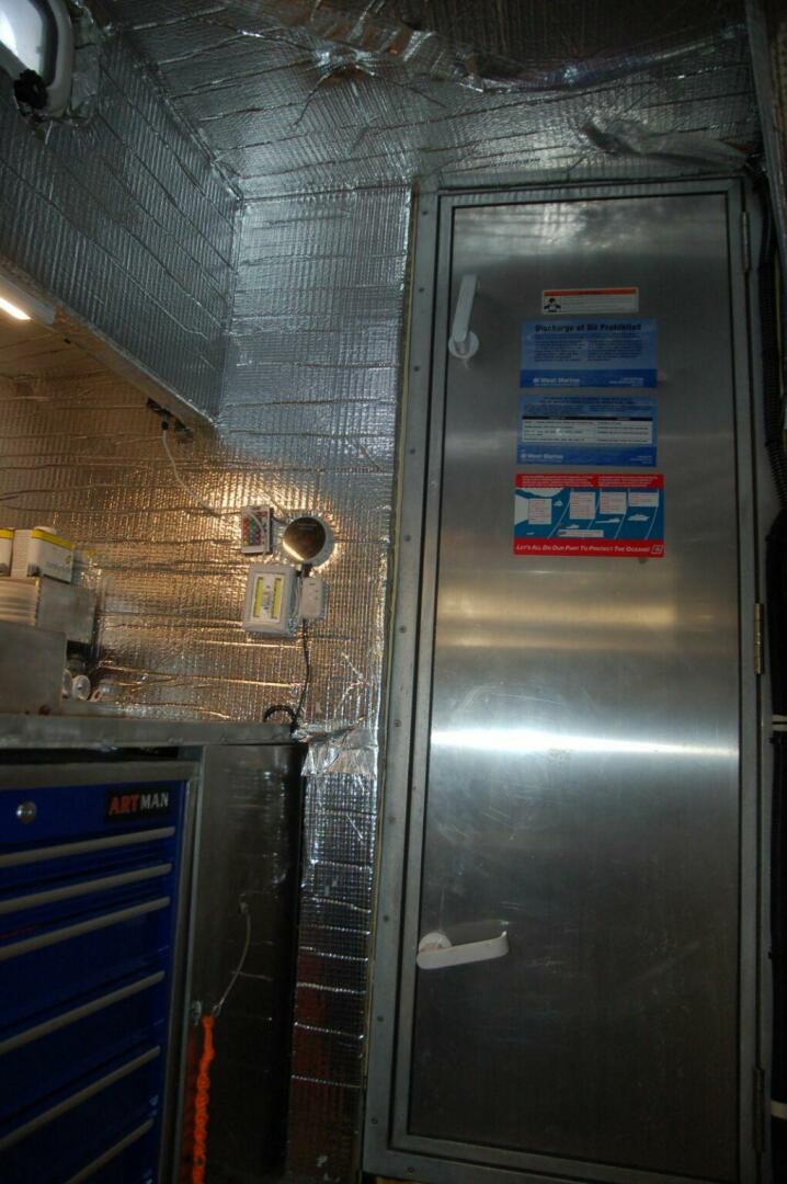 IRON WILL has a full beam, stand up engine room below the raised pilothouse. Entry is through a watertight 20” x 62” door in the forward head. Metal non-skid grating is on either side of the main engine and two steps down from the entry door. The engineroom is well lit with LED strip and dome lights. Foil-faced acoustic insulation covers the hull sides, overhead, and bulkheads. A custom metal worktable with 1” high fiddles is mounted on an Artman seven drawer tool cabinet. Storage shelves are outboard and above the work bench. Headroom measures 6’ 6” at the bench.