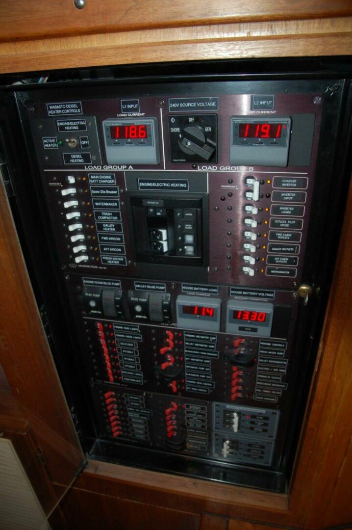 - Custom wood rocker switch cabinet next to helm seat