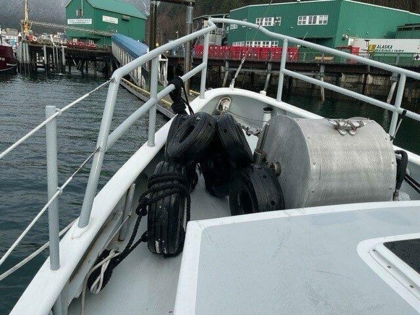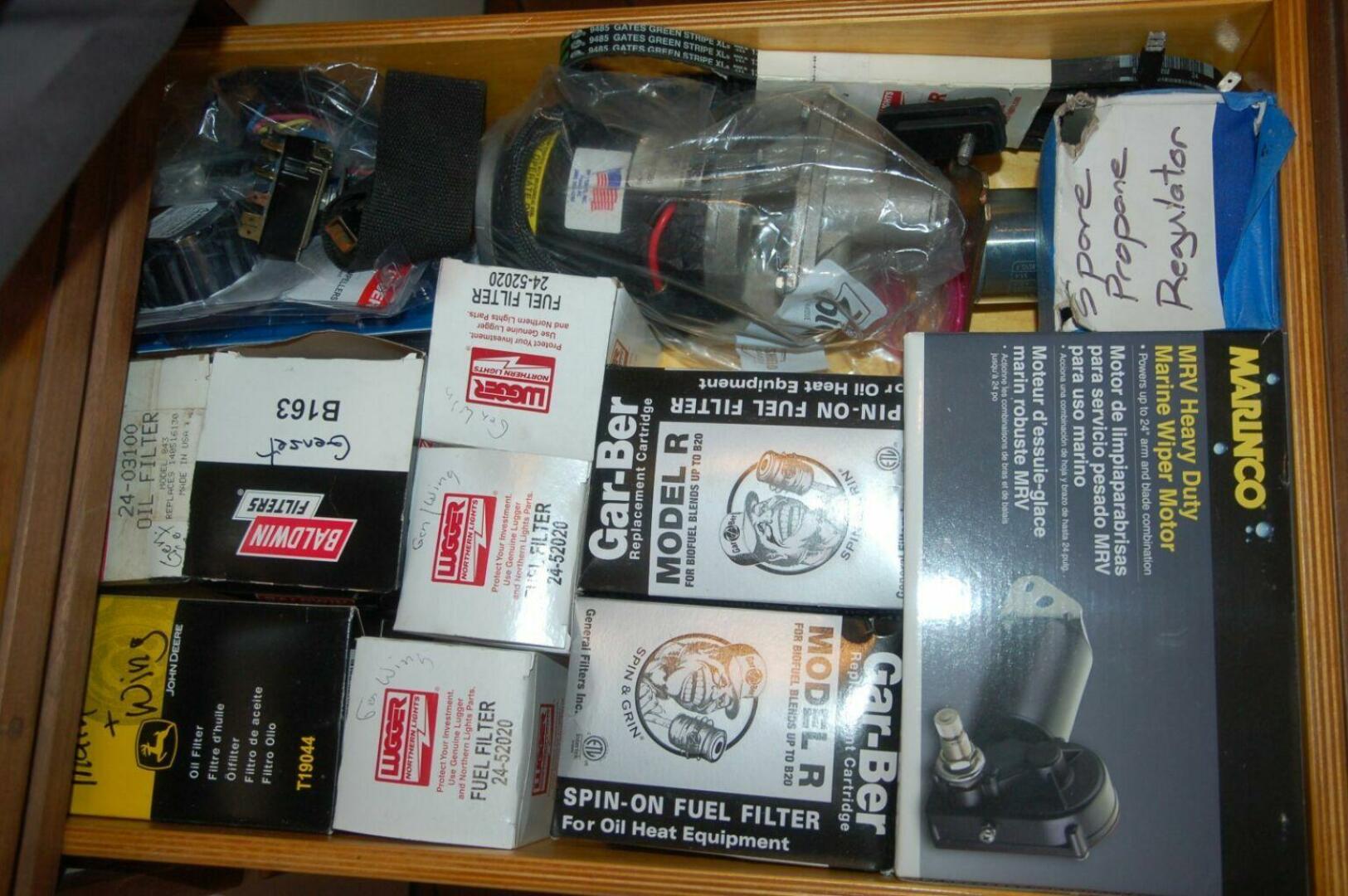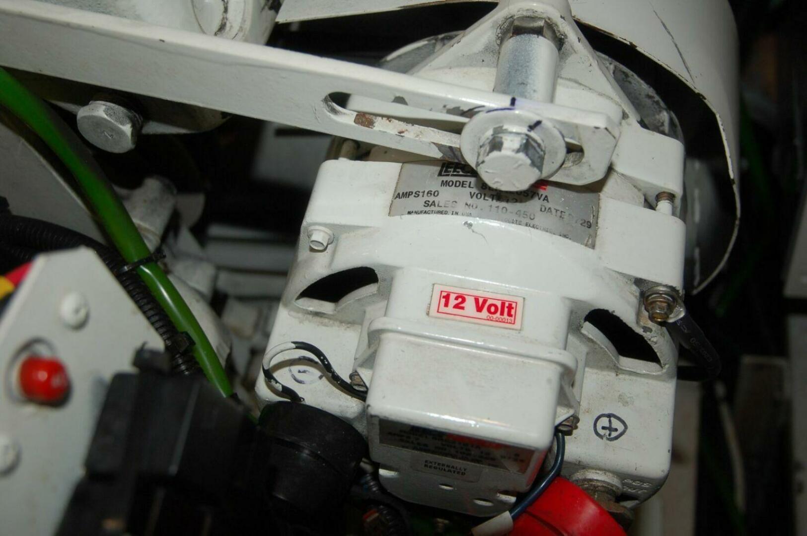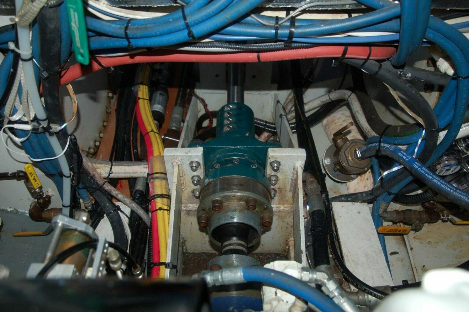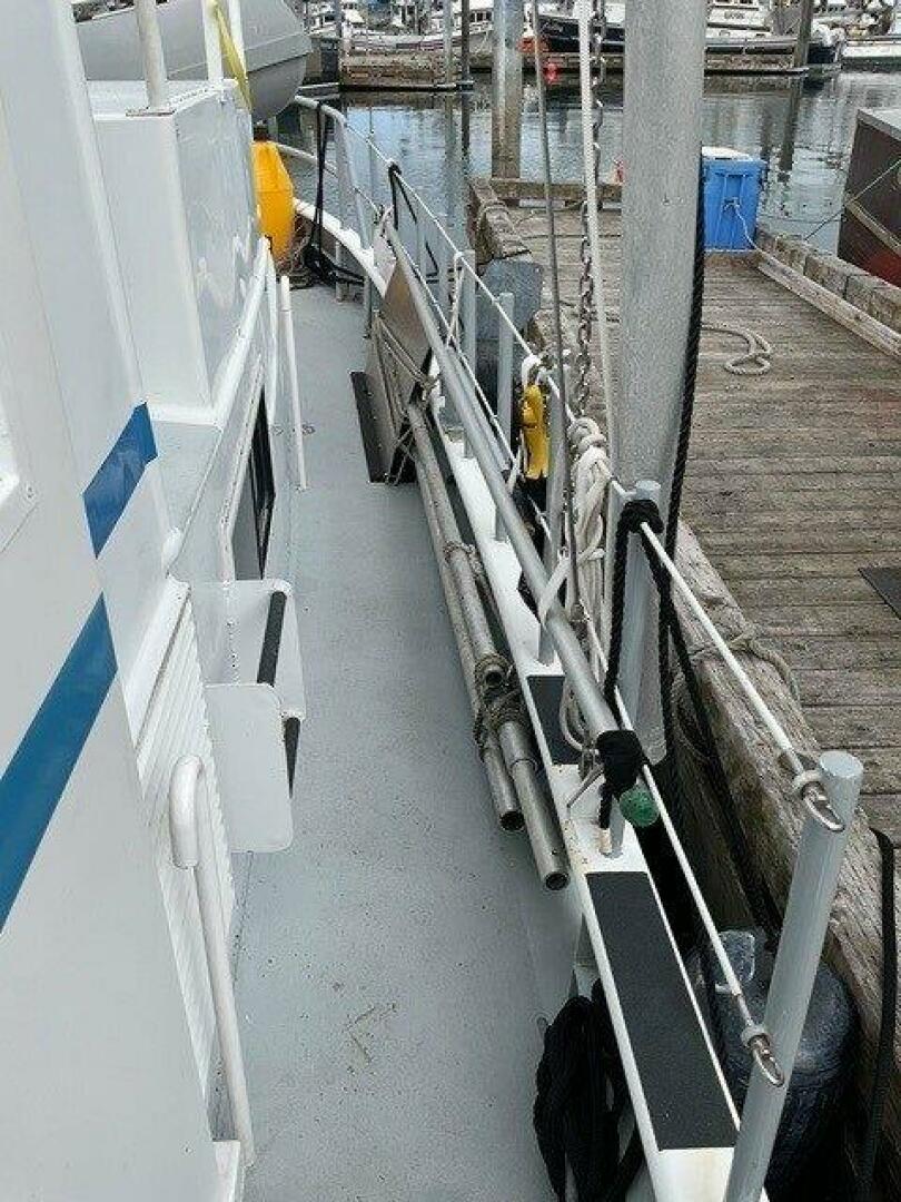 The Lugger main engine is low and well forward in the boat providing a near horizontal shaft angle with the propellor fully protected behind the full keel, just forward of the top and bottom supported rudder. A welded aluminum ladder and platform over the engine provides access to the starboard side of the engine room. This extremely dependable, long-life engine utilizes a John Deere block, dry stack, and keel cooler for maximum dependability. A Lugger wing engine is to port and aft of the workbench. This 70hp engine is also dry stacked and keel cooled and used exclusively to power a large hydraulic pump. Cooling water for the hydraulic system is driven by an engine-mounted pump.