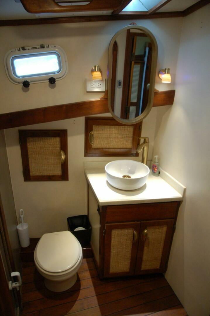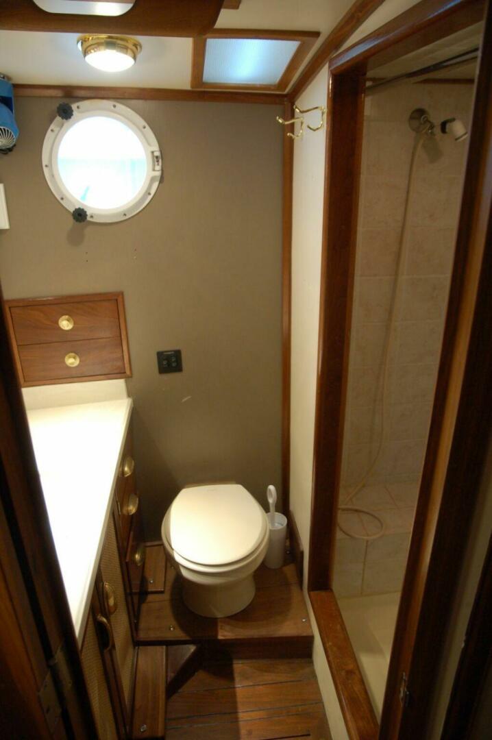 The forward head is aft and to port in the forward stateroom and entered through a locking privacy door. Forward and outboard is a 12” diameter round porcelain sink mounted atop a vanity. A single lever VIG faucet and matching drain are fitted at the sink. Storage cabinets are outboard. A framed mirror is above the sink. The Dometic electric flush head is aft. Inboard is a shower stall with curtain, hose nozzle with holder, and Skandvik mixer valves. The shower is molded from fiberglass.