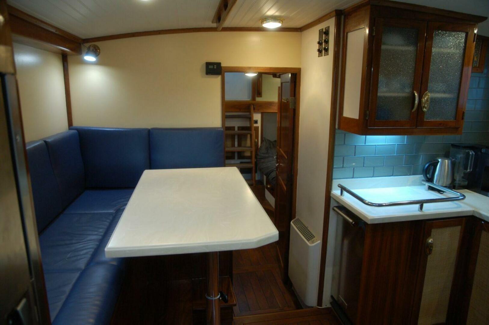 IRON WILL has a functional and elegant interior finished to a high level. Joinery is varnished walnut and used for paneled cabin doors, doors, cabinet trim, drawer fronts, and cabinet doors. Cabinet faces are rattan for ventilation. The sole is solid teak boards separated by black staving over marine plywood. Drawer and cabinet pulls are custom brass “IRON WILL” castings. Countertops are white Corian. Cabinet sides, bulkheads, and hull sides are white painted marine plywood. Coachroof insides painted light green for contrast. Overheads are white laminate panels. Red/white touch LED dome lights and reading lights are well placed. The hull is fully insulated with spray foam making this steel yacht warmer in cold weather and cooler in hot weather than any fiberglass yacht. Headroom is excellent at 6’ 6” or more throughout.
