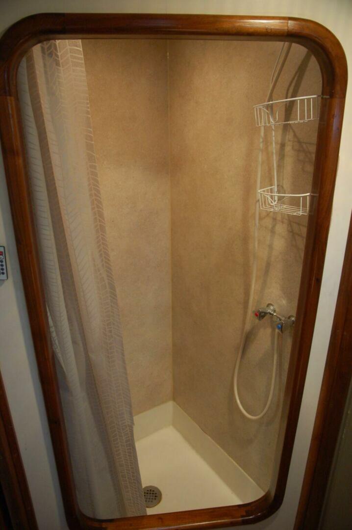 An ensuite aft head/shower is forward to port and entered through a locking privacy door. A vanity with Corian counter, underhung 18” x 11” x 5” white sink, cabinets and three drawers runs along the aft bulkhead. A large wood-framed beveled-edge mirror is above the sink. A wood bar with five tulip lights is above the mirror. Two drawer are outboard below the side deck. The electric flush head is outboard. Forward is the shower. A shower curtain, Skandvik faucet, hose nozzle and holder, and tiled seat are fitted. The shower walls are tiled and a fiberglass showerpan complete this shower.