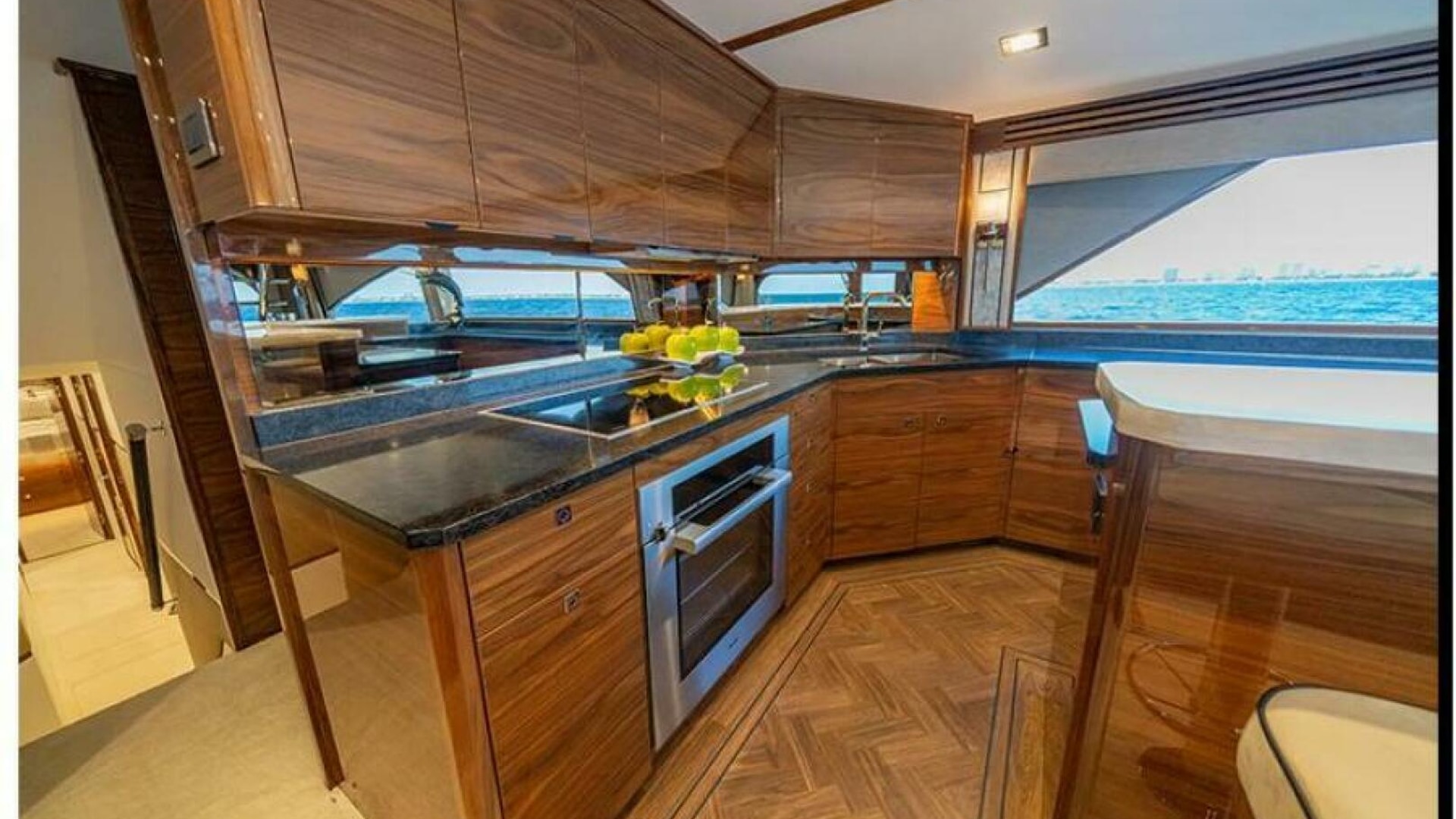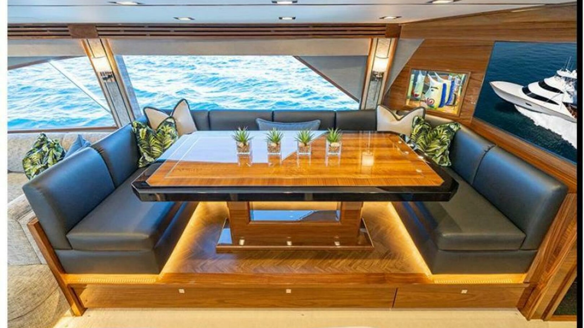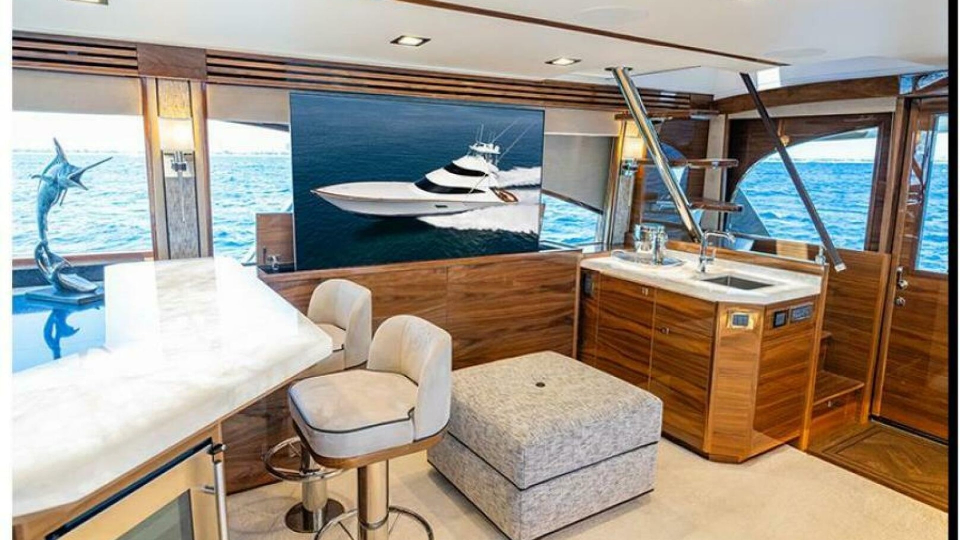 Viking owners and enthusiasts will be enamored with the accommodations of the new Viking 90. The combination of interior volume, a flowing open layout, and several design touches create a fresh soothing ambiance throughout the vast living spaces. Stepping into the salon, a new horizontal grain natural walnut interior greets you with warmth and style. Guests will appreciate the spacious lounge that begins at the salon door and wraps around the port side. A starboard-side entertainment center features a 65-inch pop-up HD TV. Forward, the large starboard wraparound galley is open to a raised U-shaped dinette to port (with rod storage below).