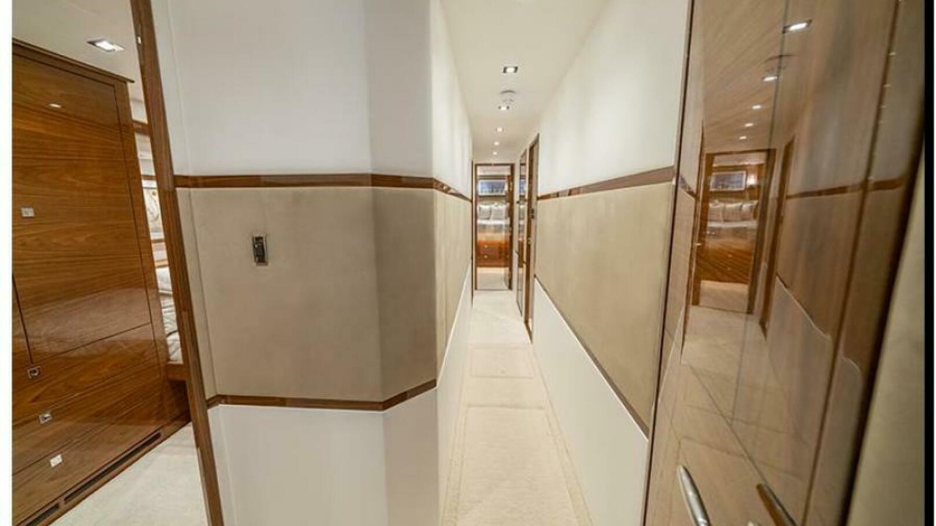 The Viking 90 offers five guest staterooms, each with its own private head and shower, crew quarters with immediate access to the engine room, a pantry with an additional crew berth, and a day head. Spanning the 23-foot, 2-inch beam, the owner’s suite boasts a king walkaround bed, a walk-in closet, a dressing table, a lounge area, a full-size credenza under a bulkhead-mounted 65-inch HD TV, and his-and-hers private facilities with separate access.