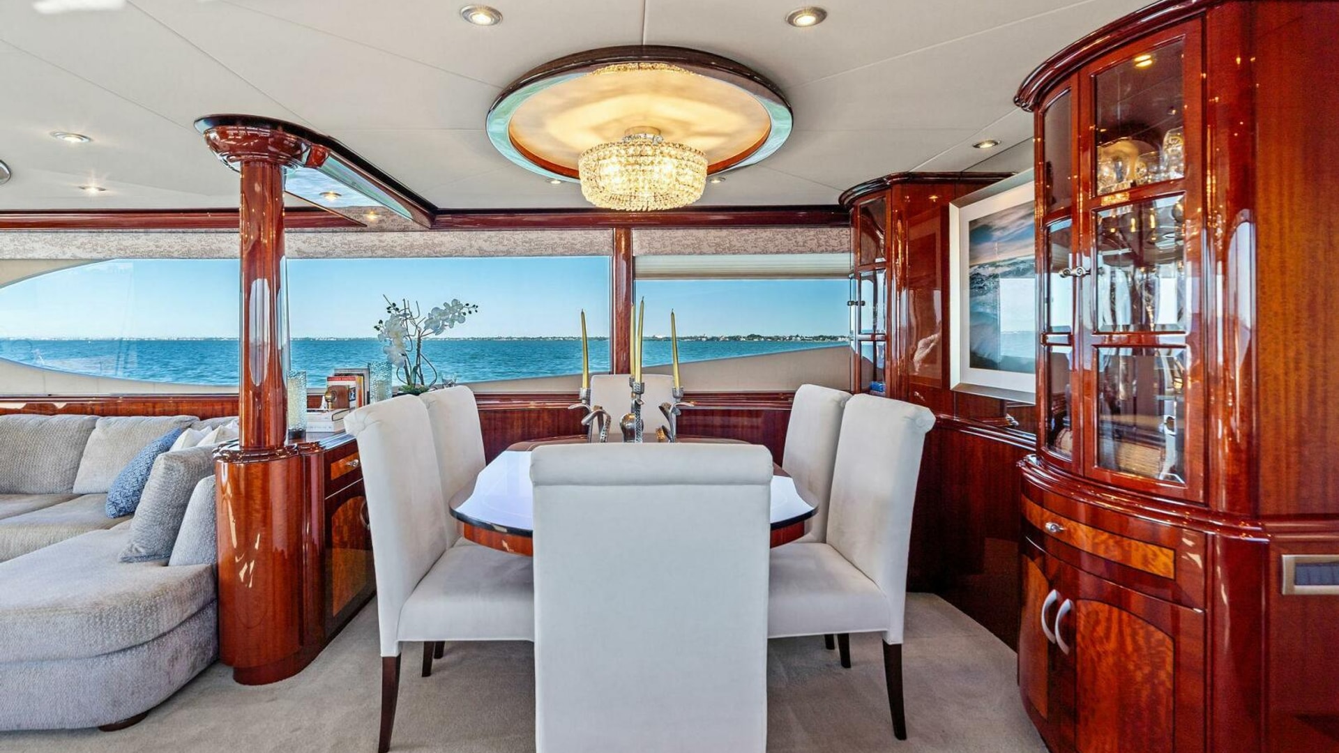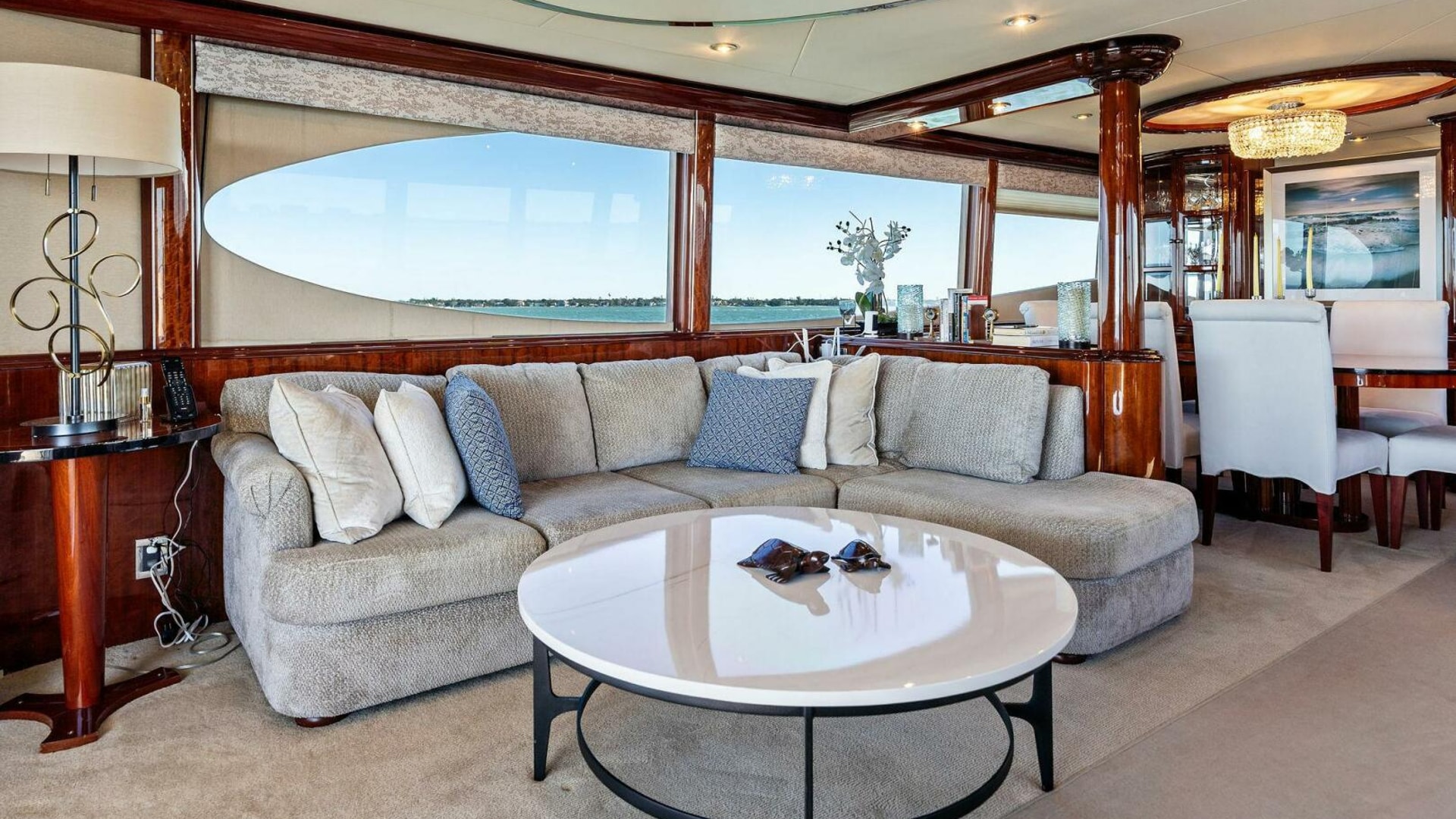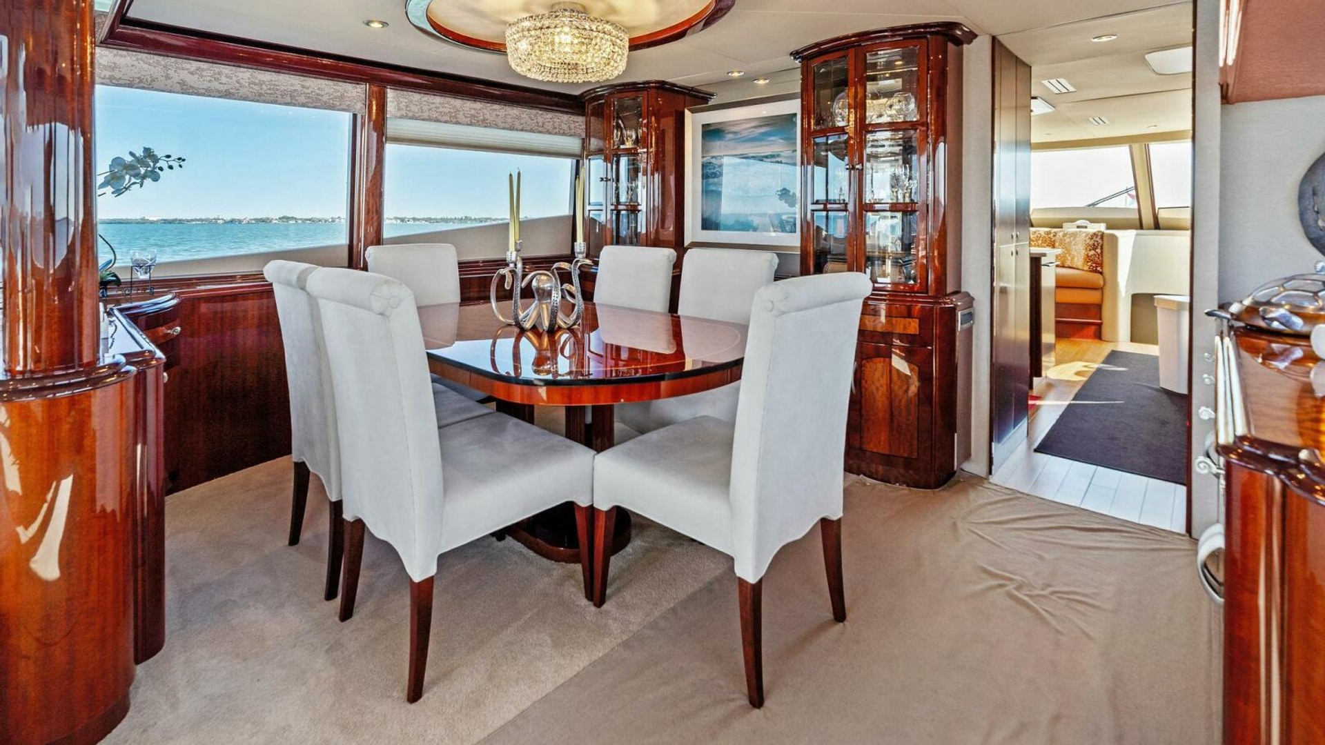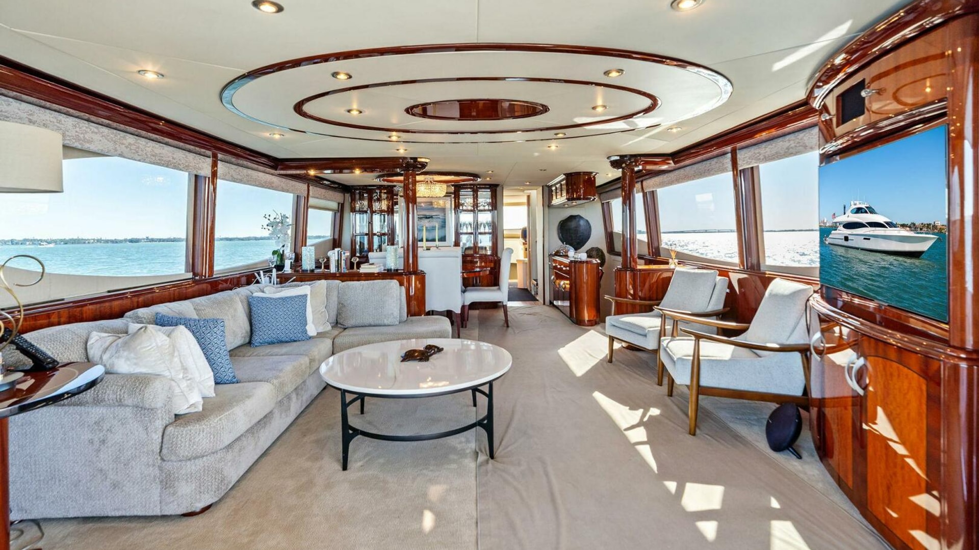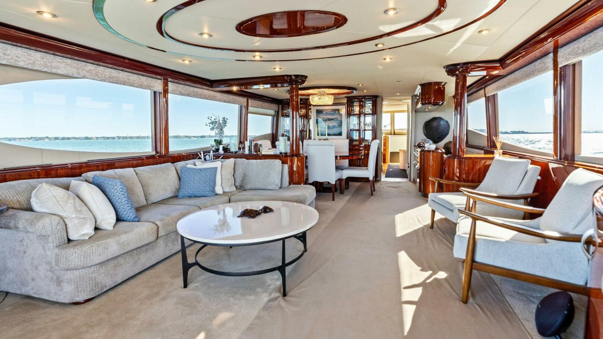 The interior is finished in high-gloss wood with abundant natural light from oversized windows throughout. The main salon features an expansive seating arrangement, formal dining for six, and elegant ceiling accents that elevate the space for entertaining.