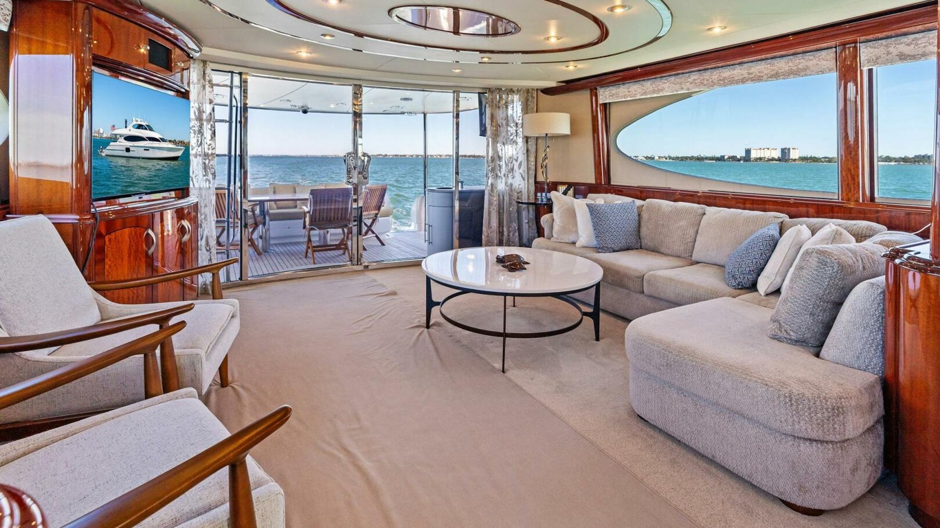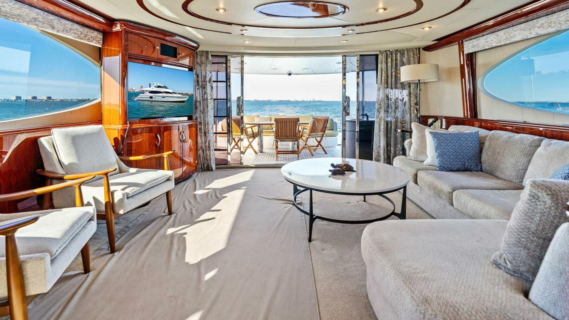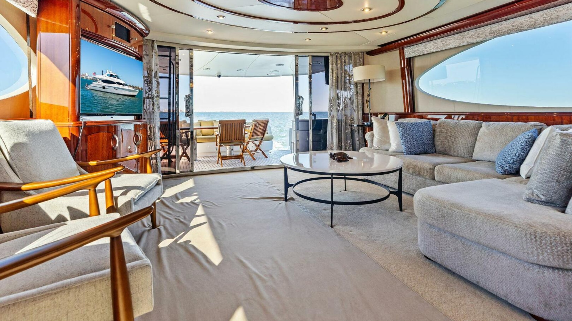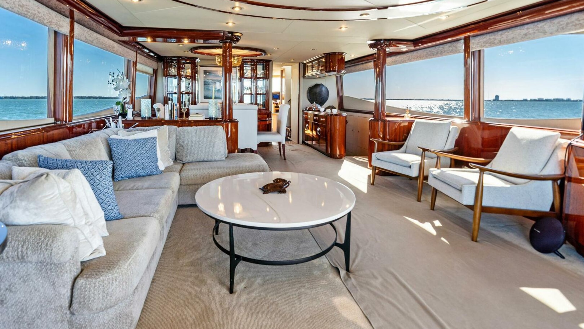 The interior is finished in high-gloss wood with abundant natural light from oversized windows throughout. The main salon features an expansive seating arrangement, formal dining for six, and elegant ceiling accents that elevate the space for entertaining.