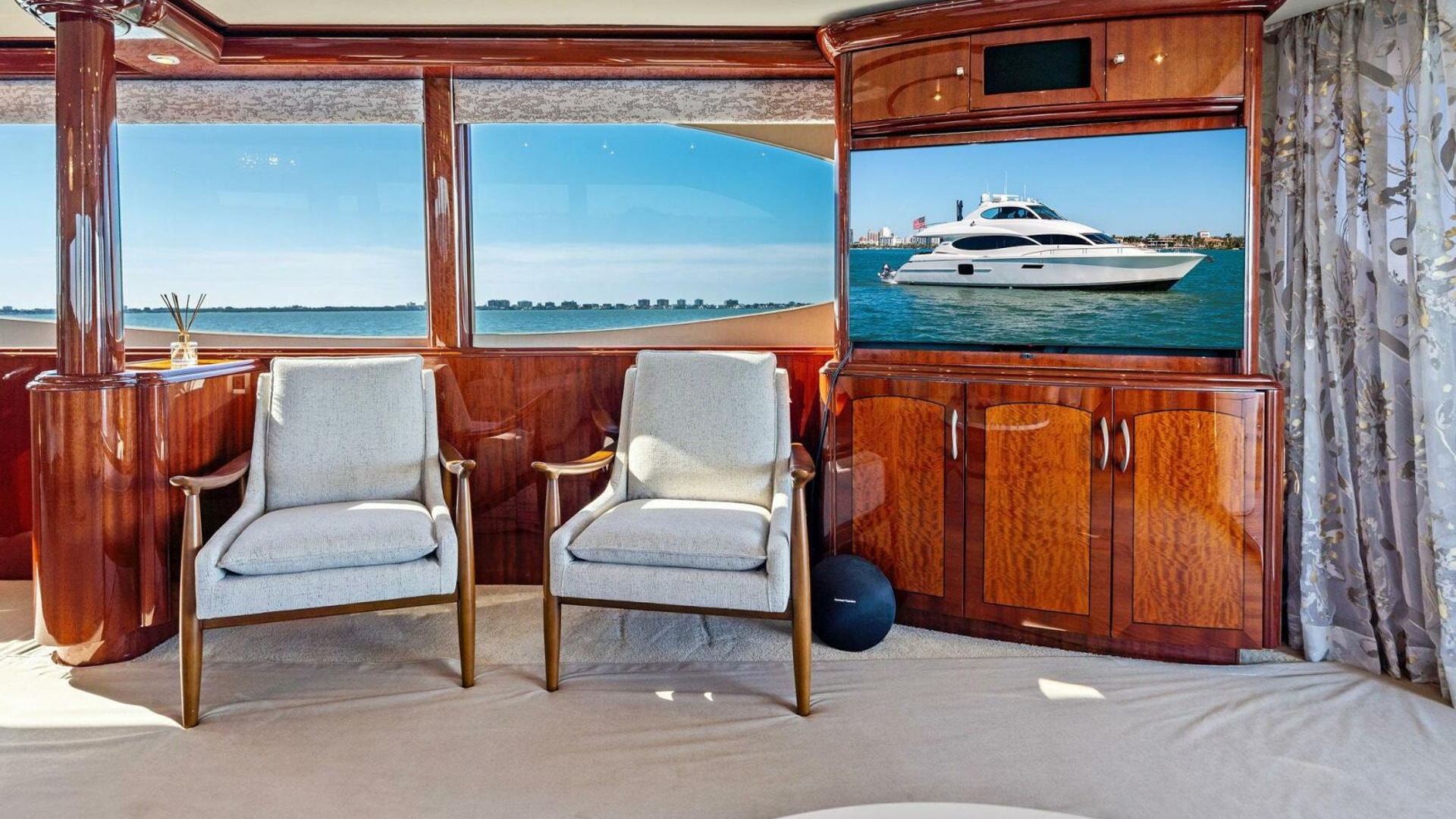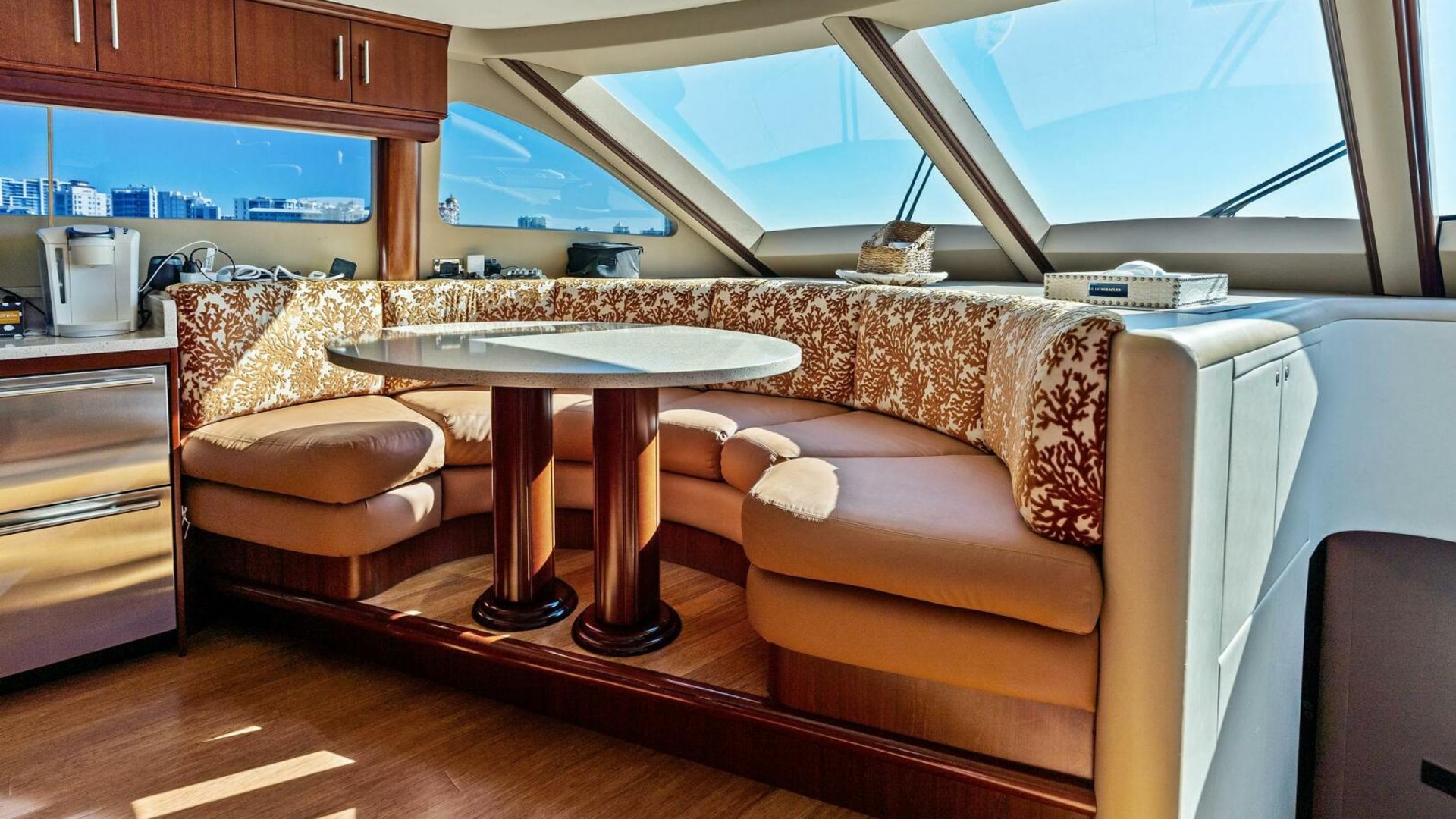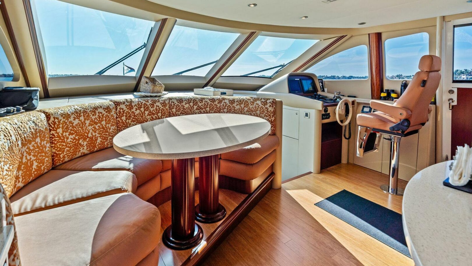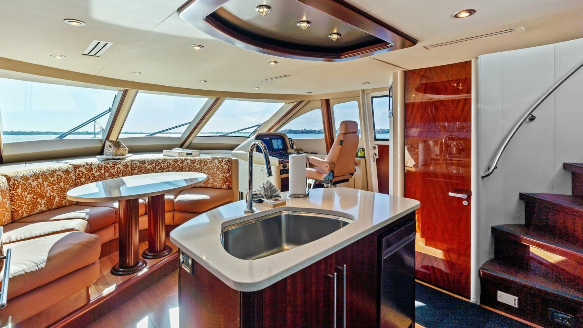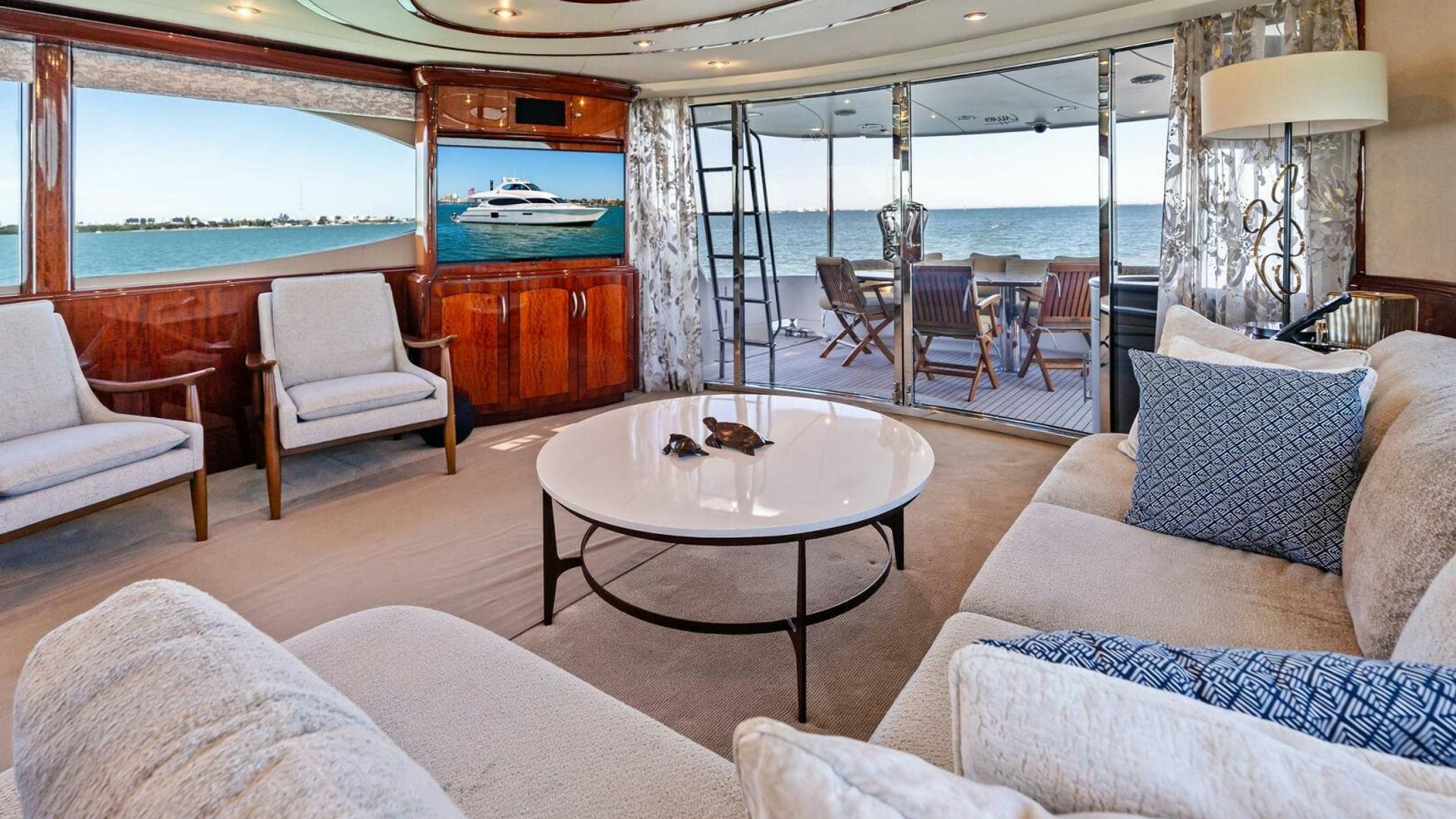 The interior is finished in high-gloss wood with abundant natural light from oversized windows throughout. The main salon features an expansive seating arrangement, formal dining for six, and elegant ceiling accents that elevate the space for entertaining.