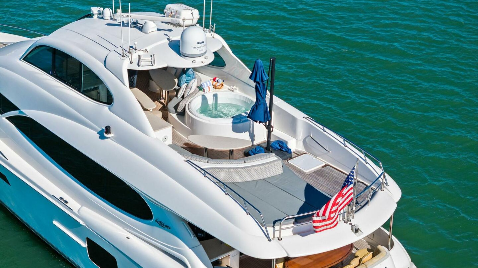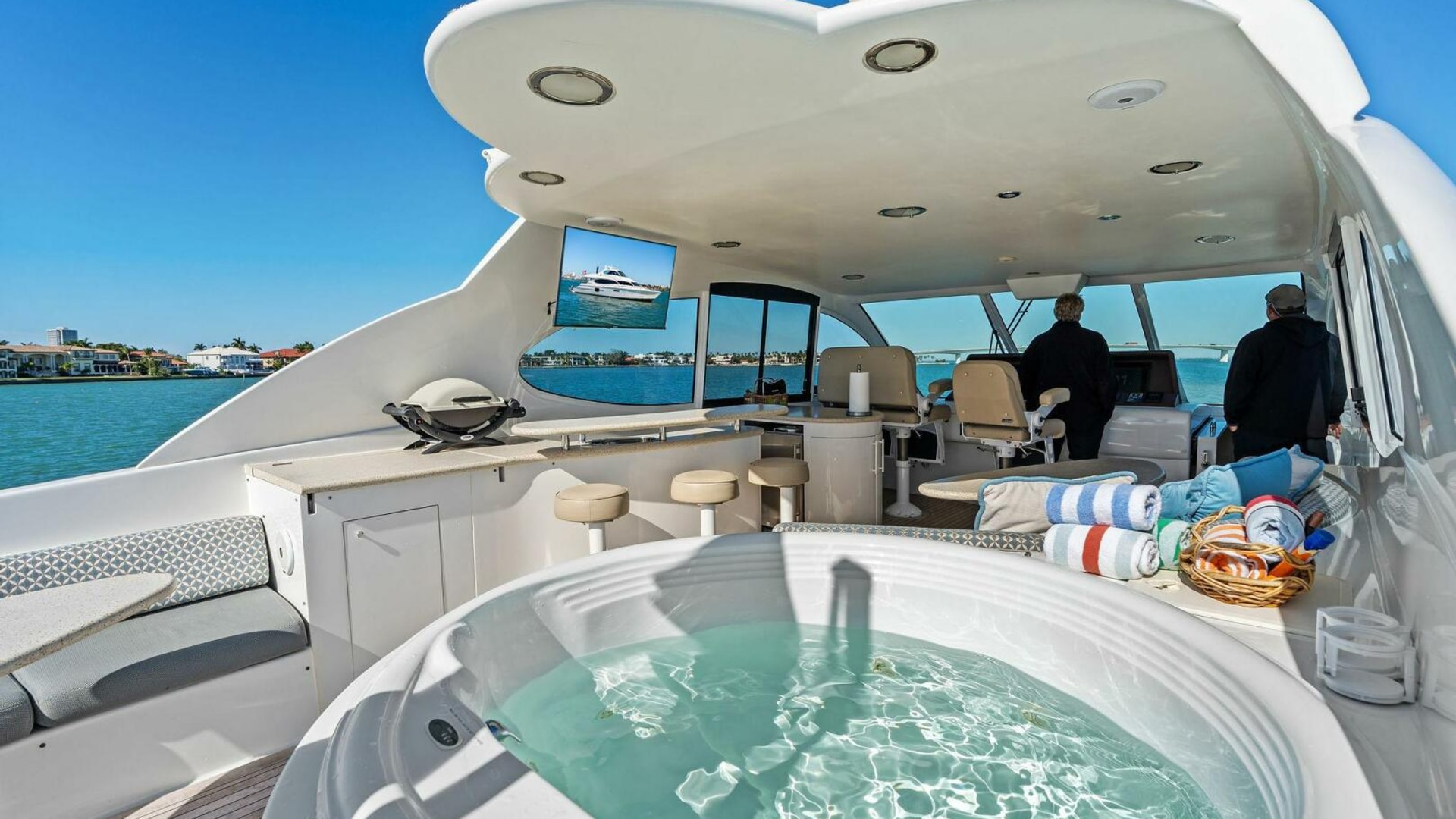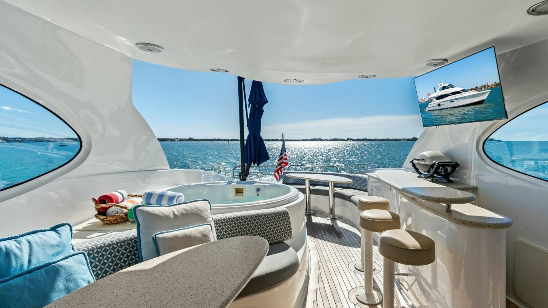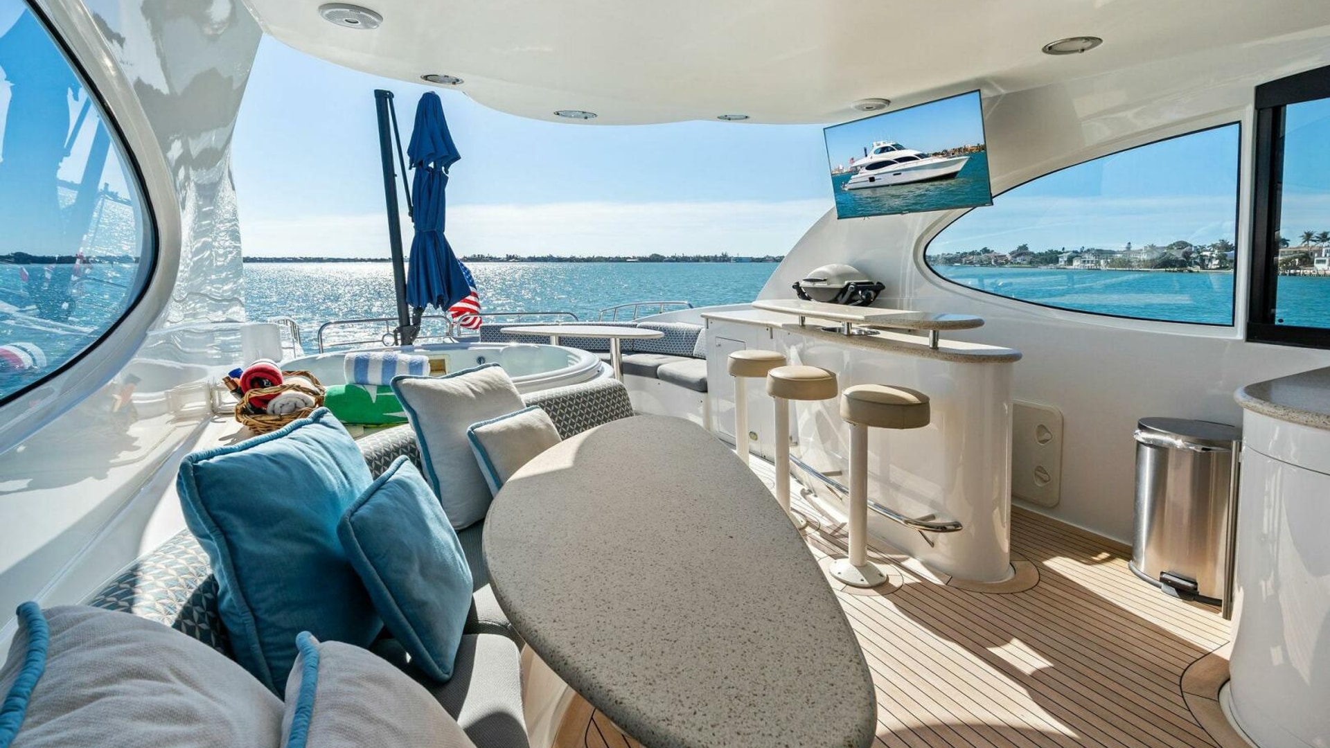 Exterior spaces are equally impressive. The teak cockpit offers dining, a full wet bar, TV, and easy access to the hydraulic swim platform and dual tender garages. The flybridge is an entertainer’s dream, featuring: