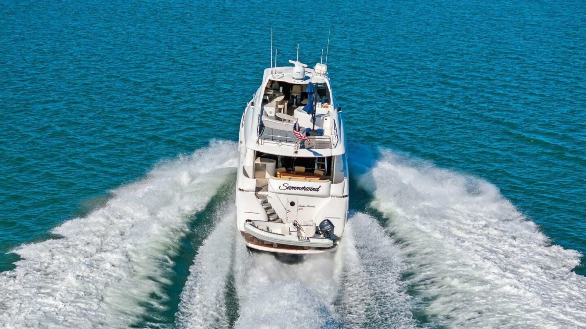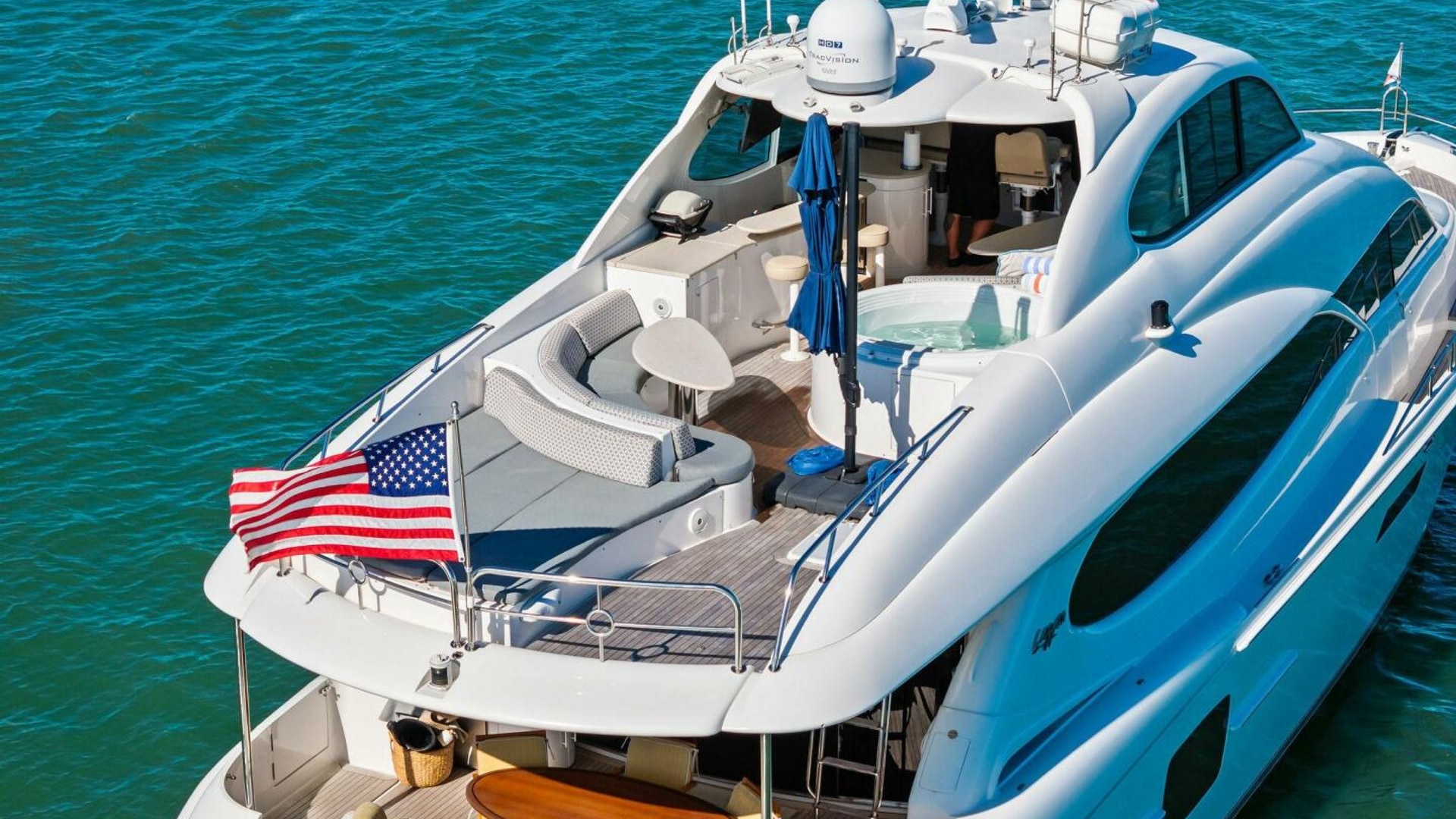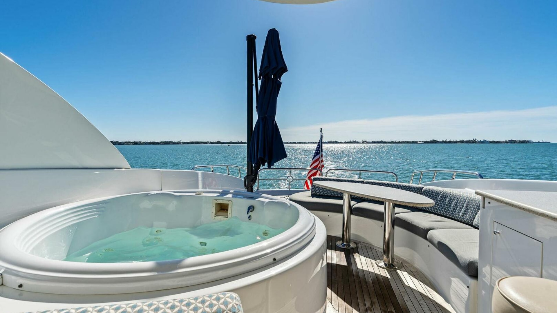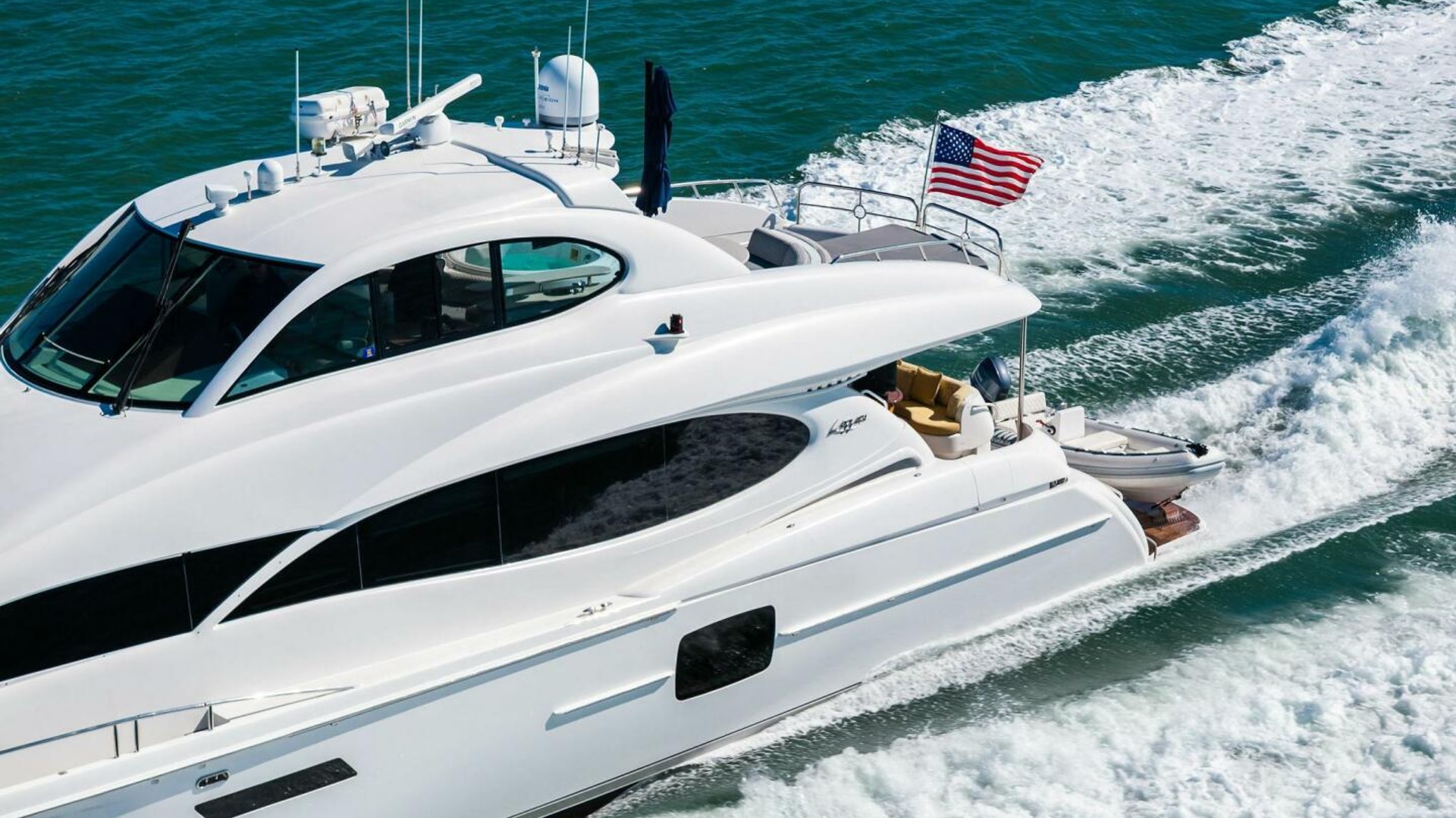 Exterior spaces are equally impressive. The teak cockpit offers dining, a full wet bar, TV, and easy access to the hydraulic swim platform and dual tender garages. The flybridge is an entertainer’s dream, featuring: