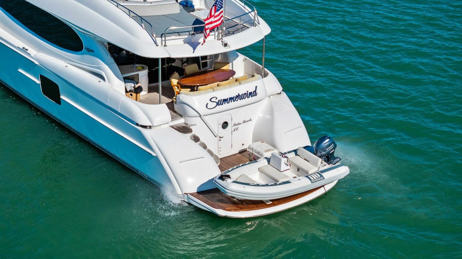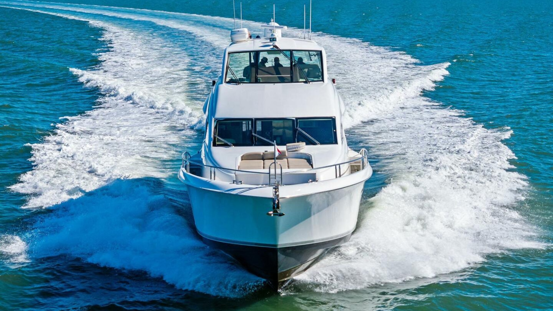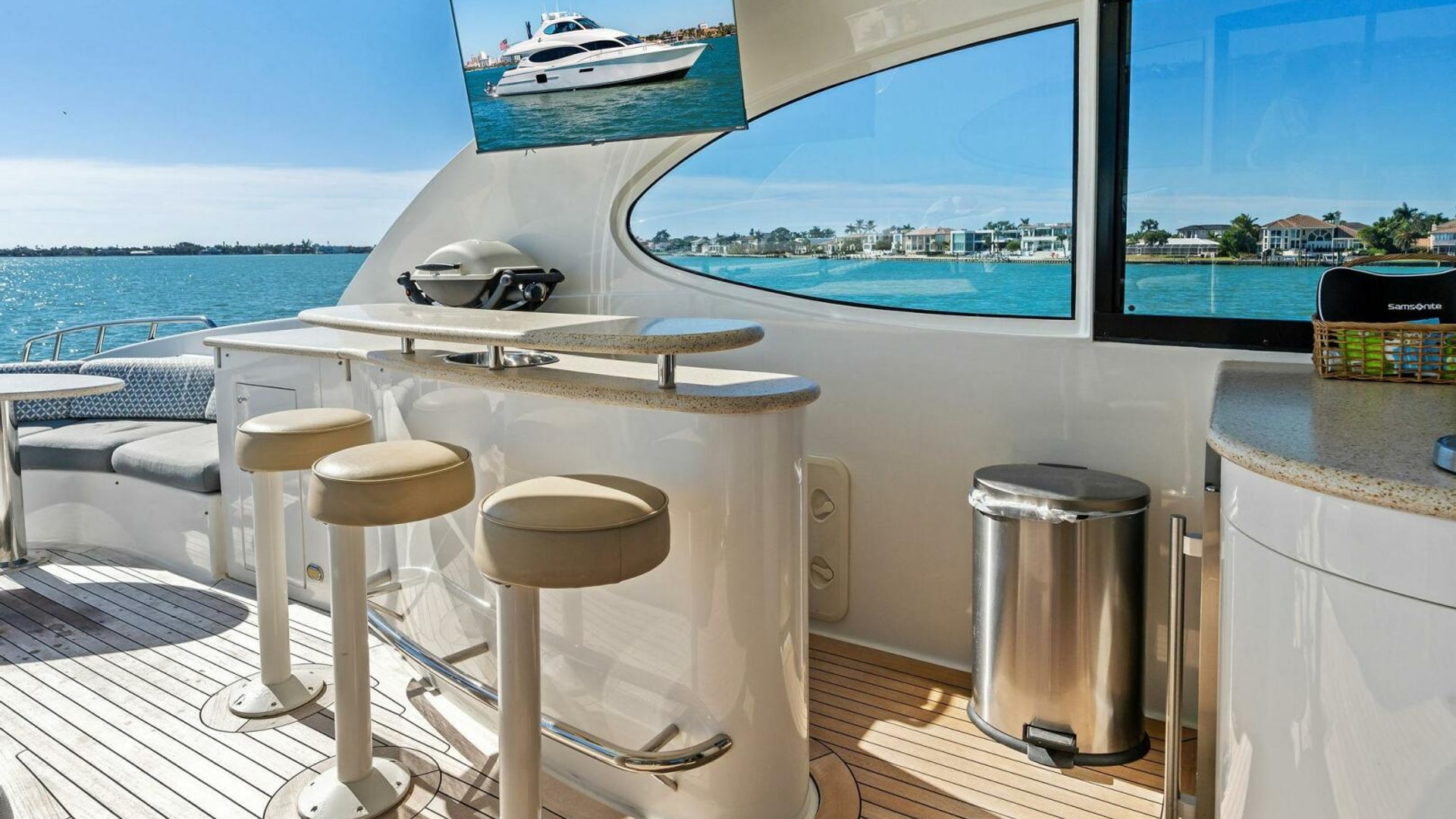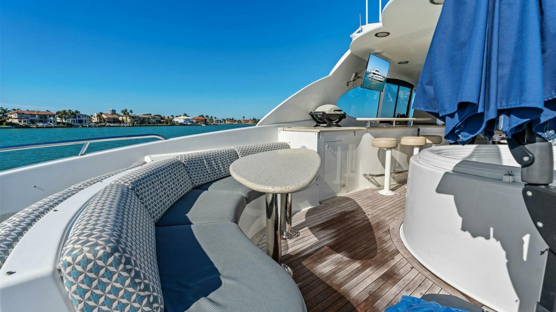 Exterior spaces are equally impressive. The teak cockpit offers dining, a full wet bar, TV, and easy access to the hydraulic swim platform and dual tender garages. The flybridge is an entertainer’s dream, featuring: