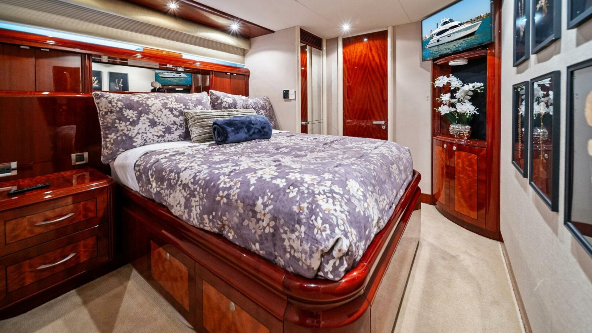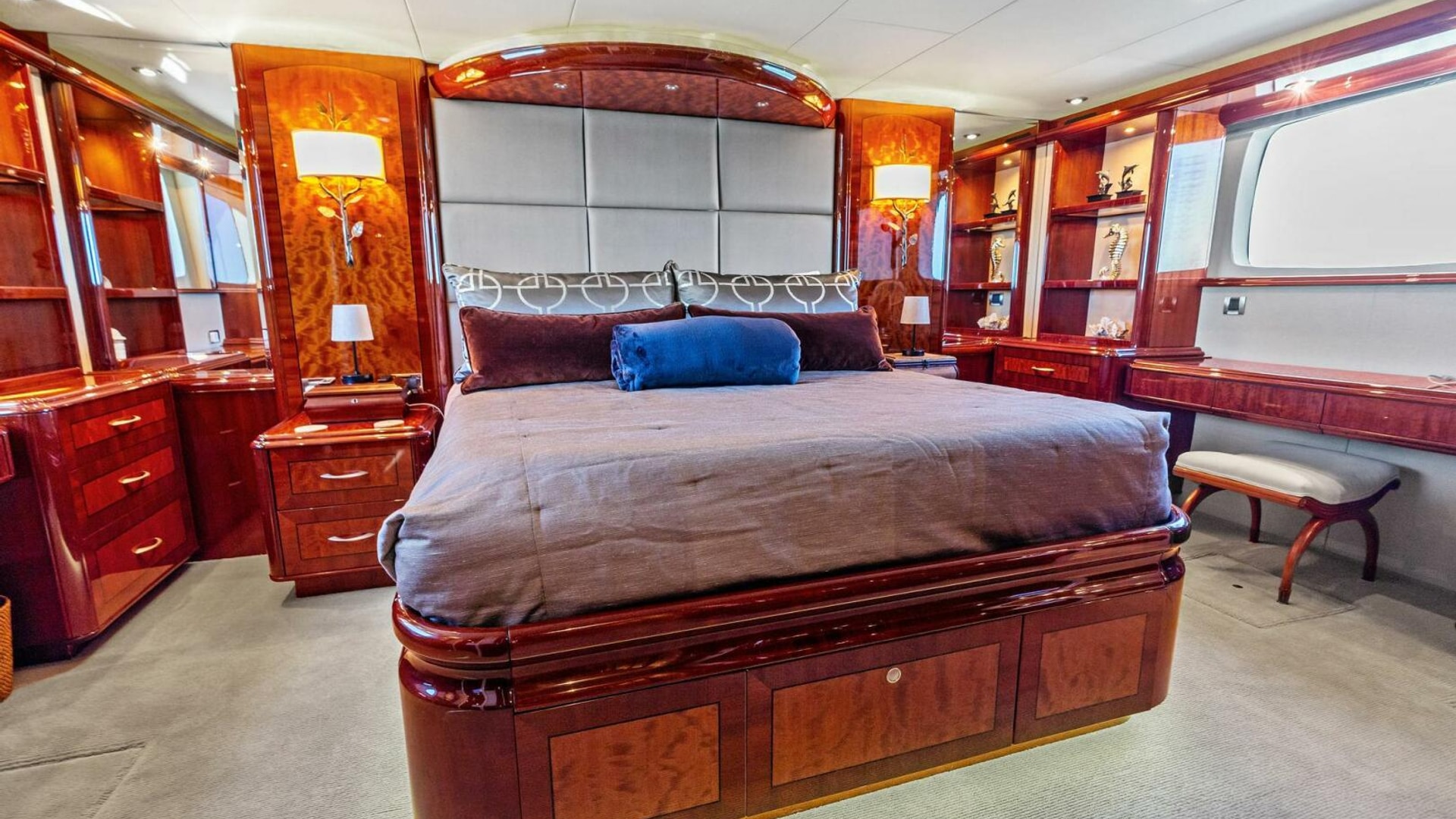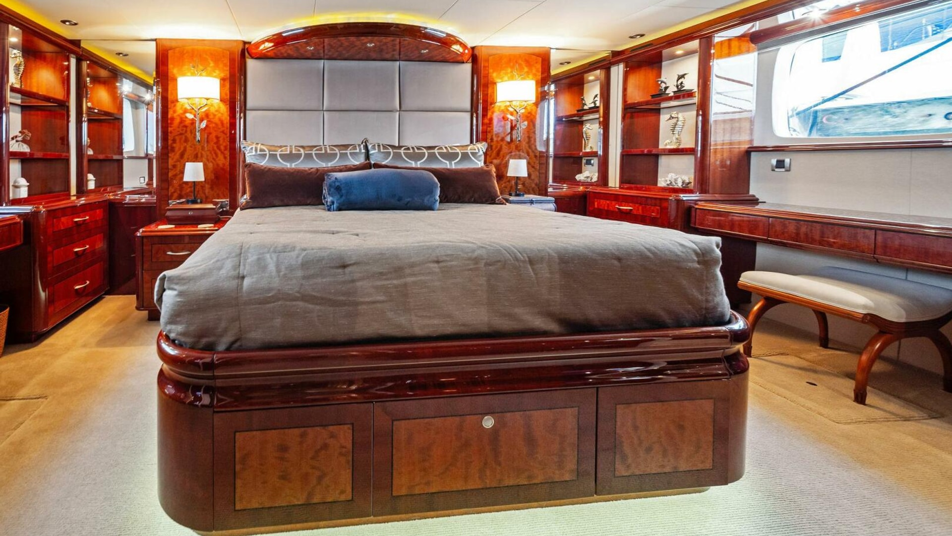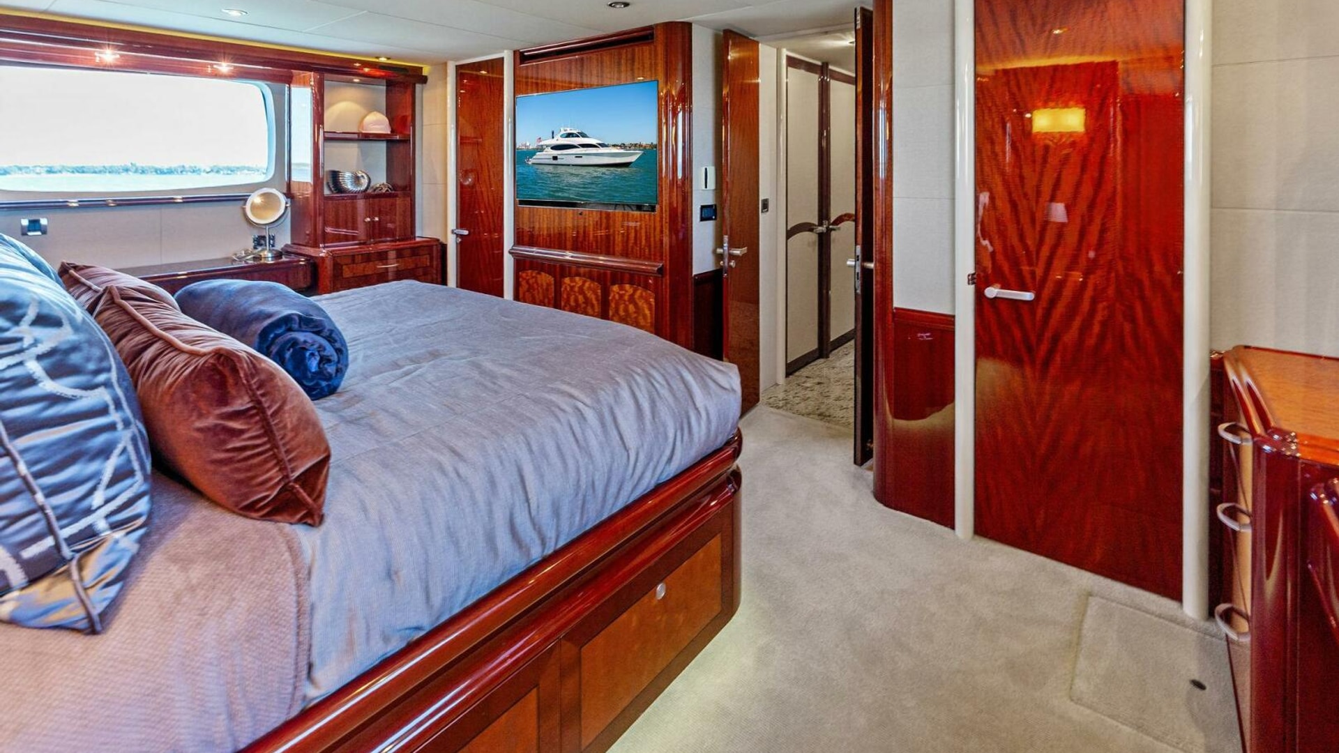 - Full-beam master stateroom with king berth, walk-in closet, dual vanities, and a spacious ensuite