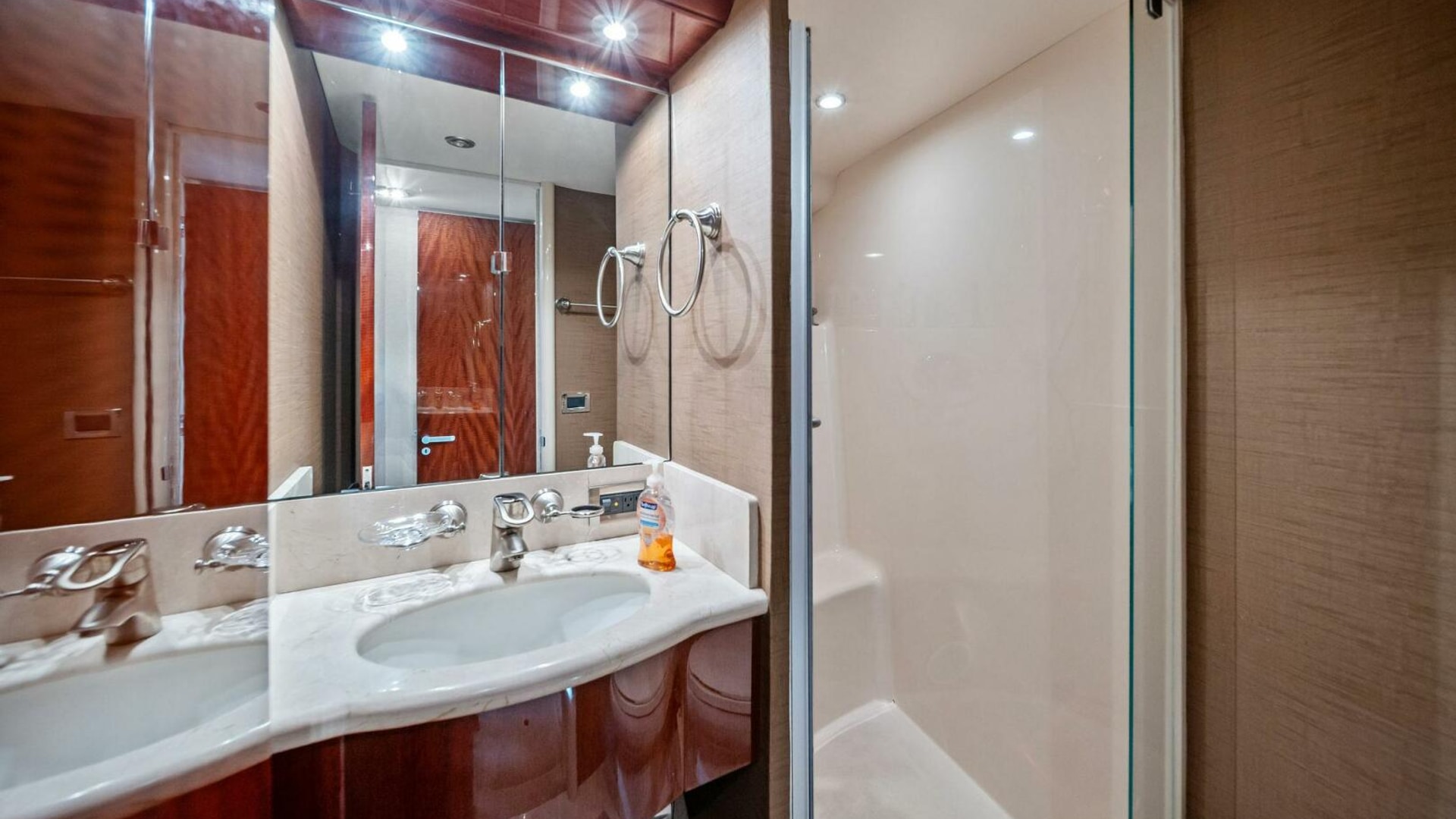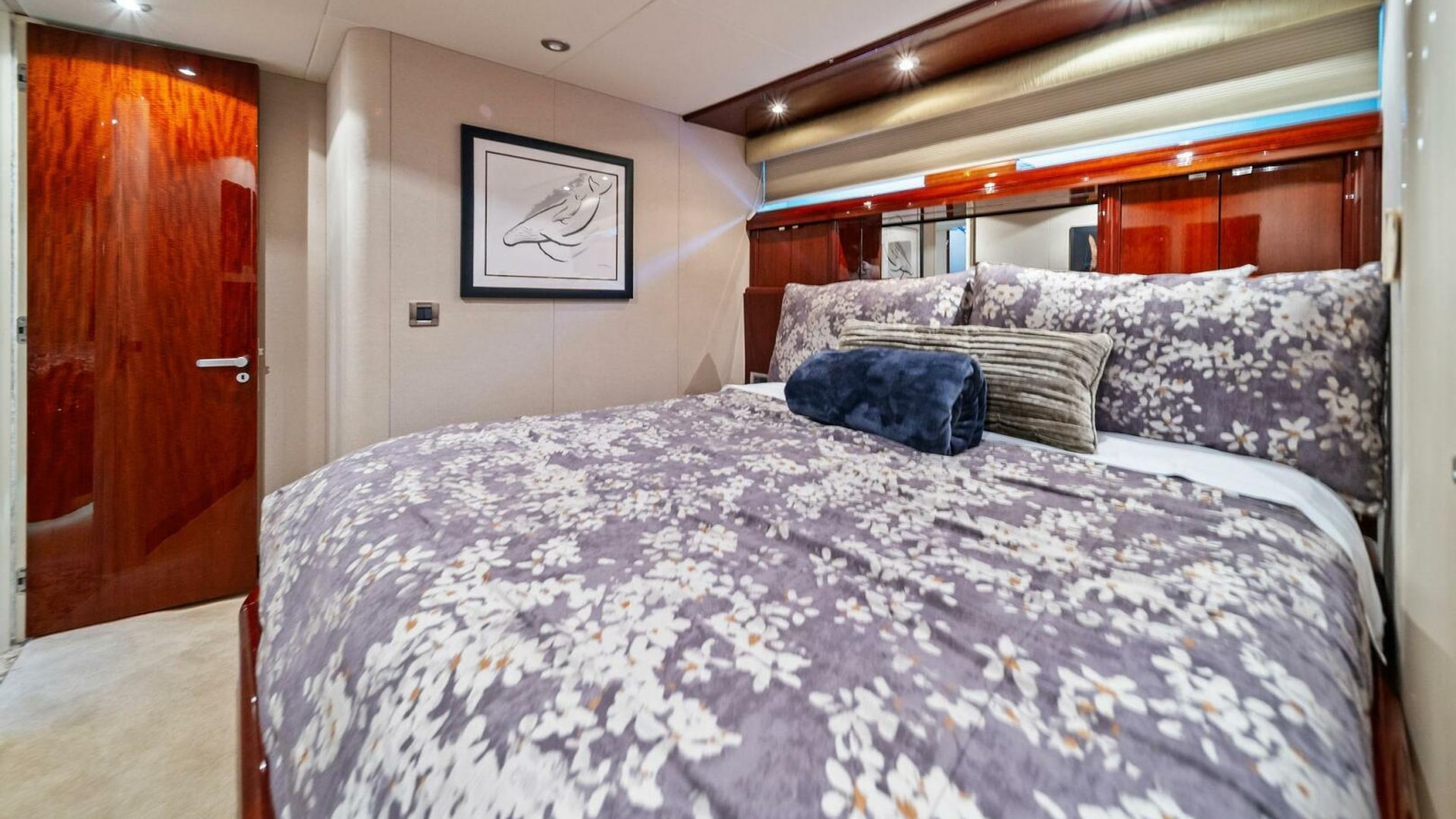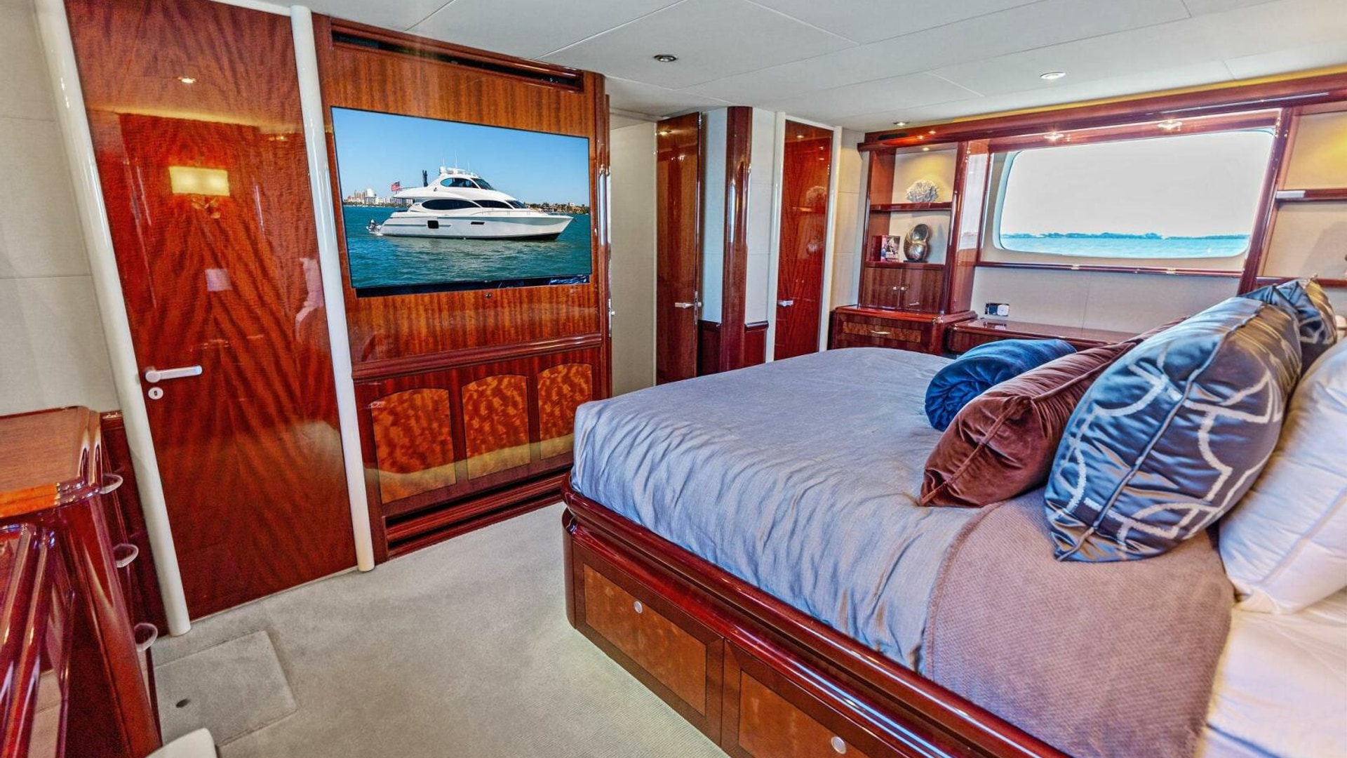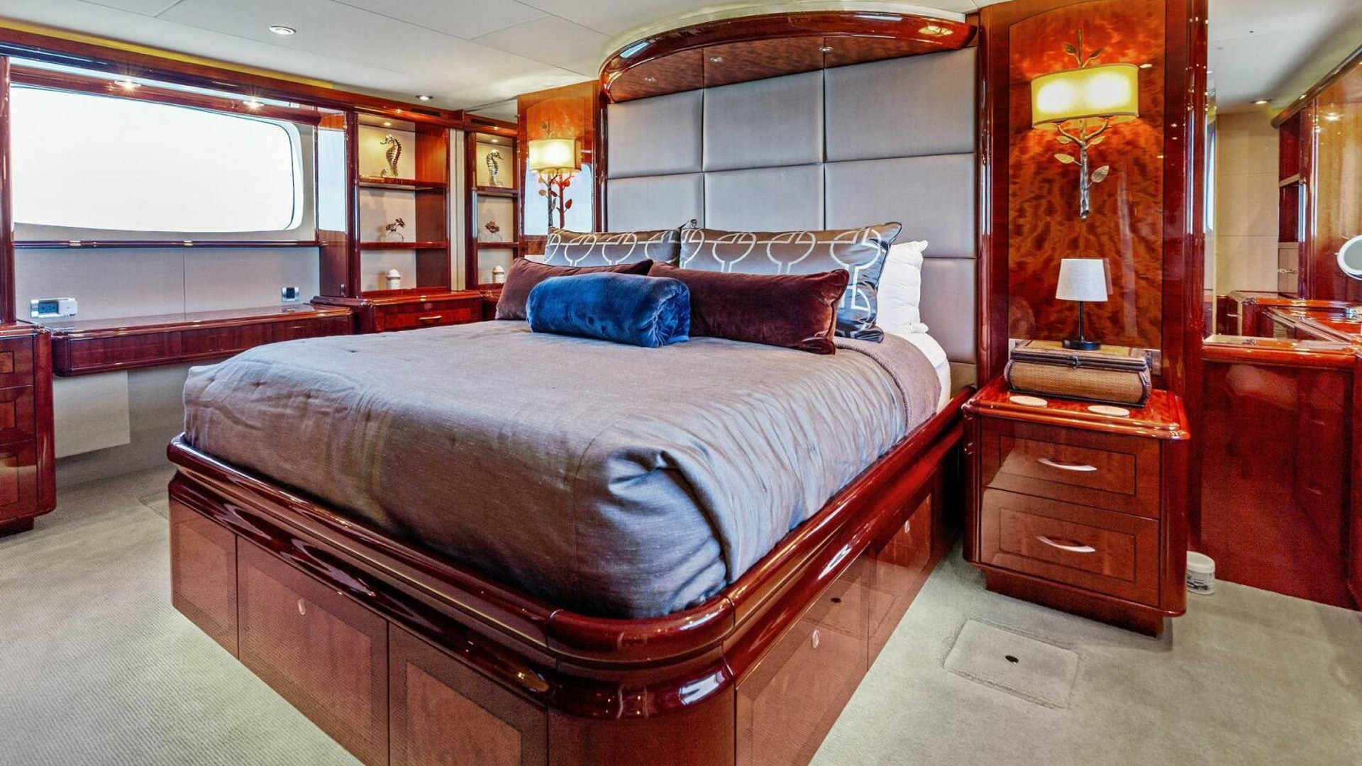 - Full-beam master stateroom with king berth, walk-in closet, dual vanities, and a spacious ensuite