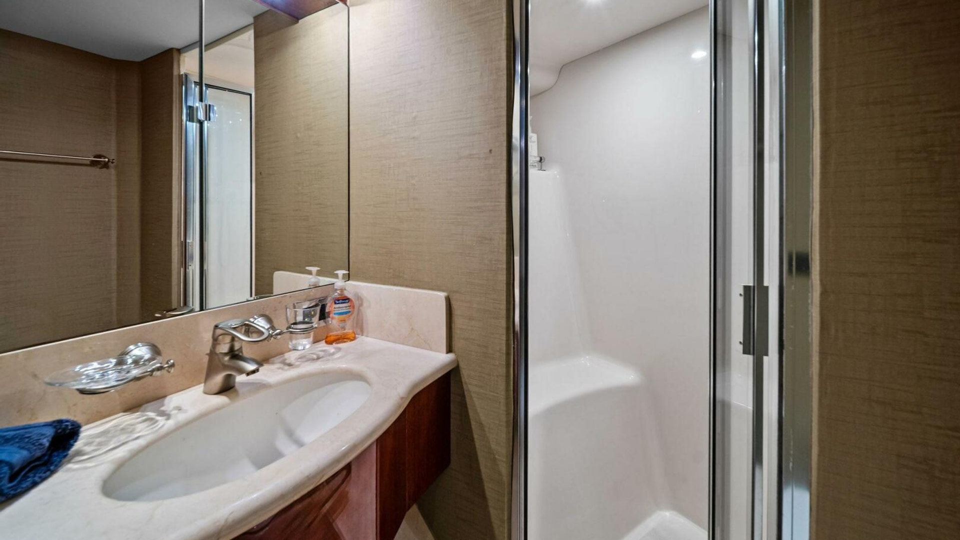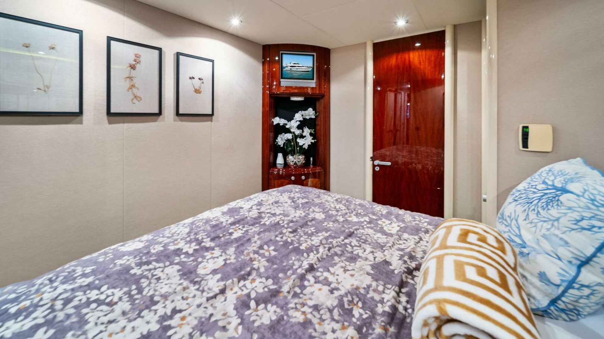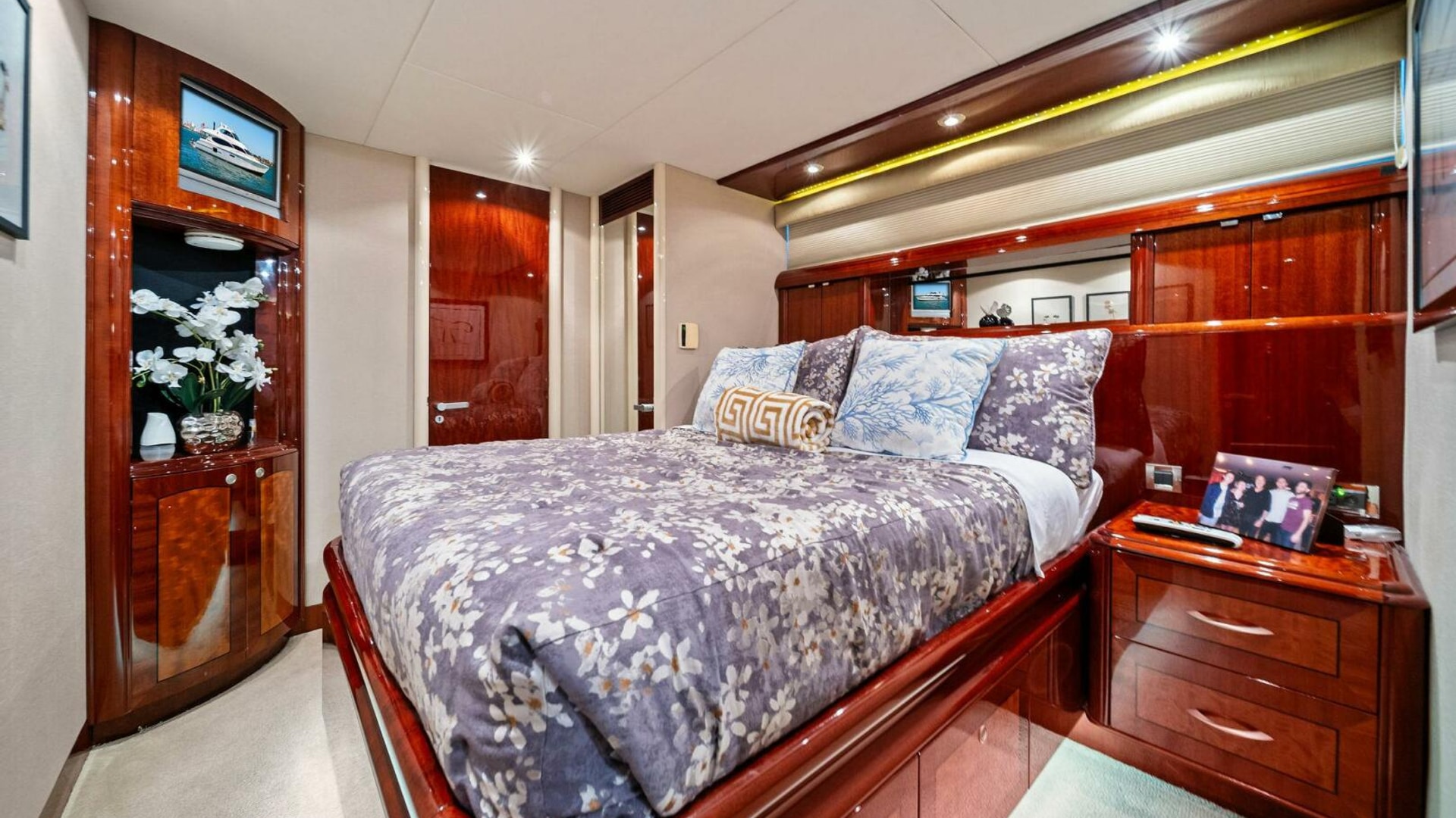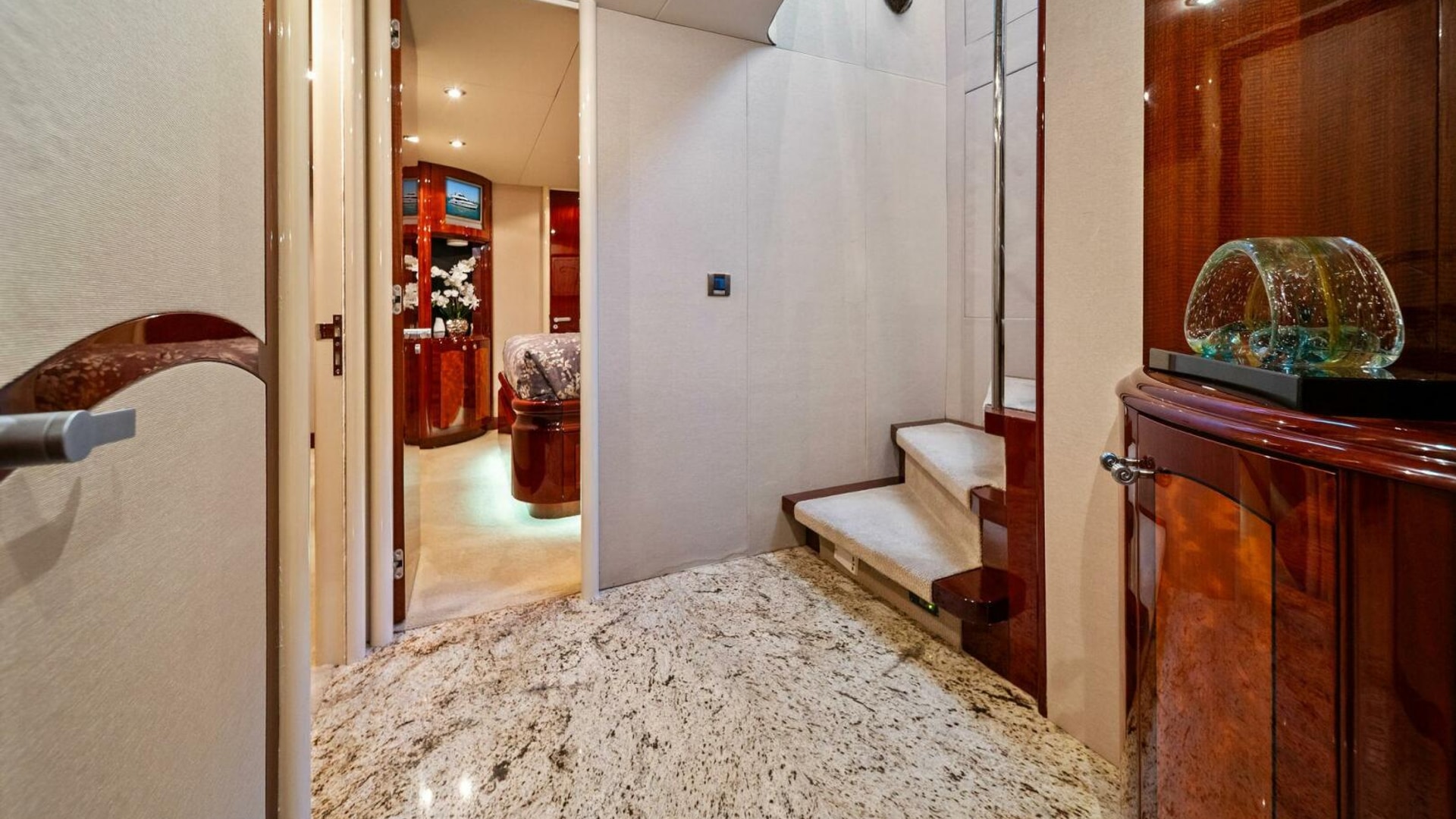 - Full-beam master stateroom with king berth, walk-in closet, dual vanities, and a spacious ensuite
