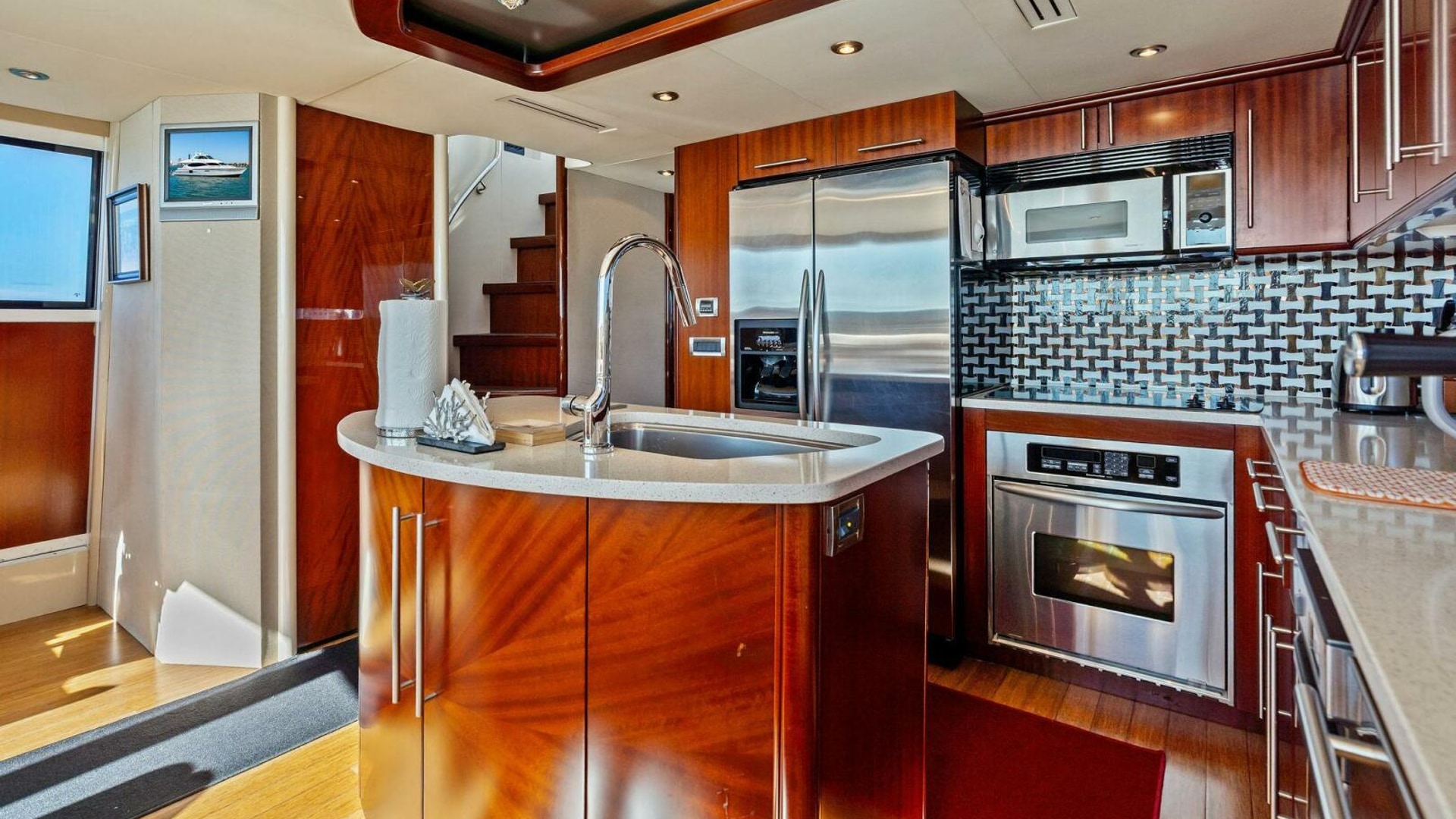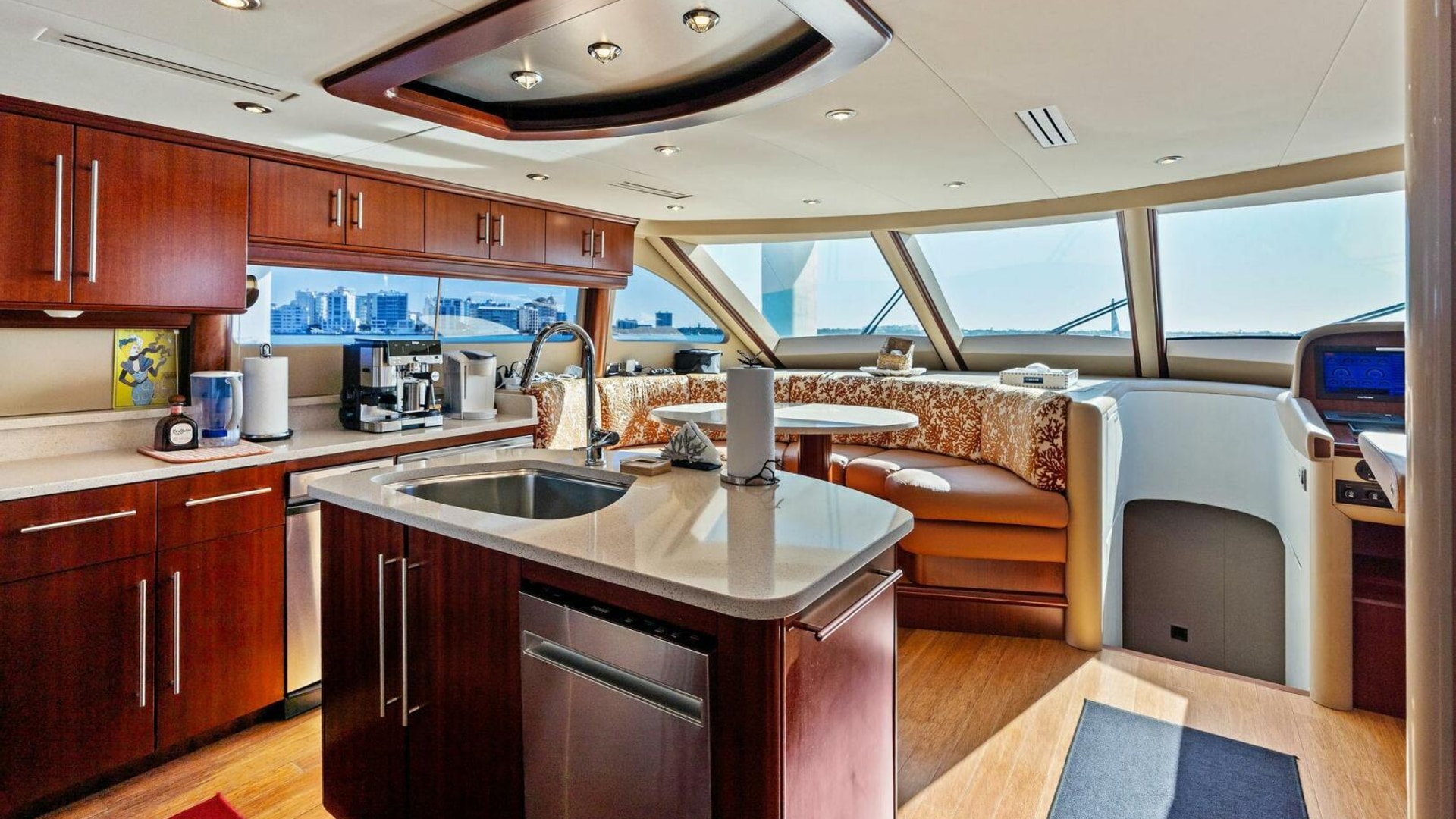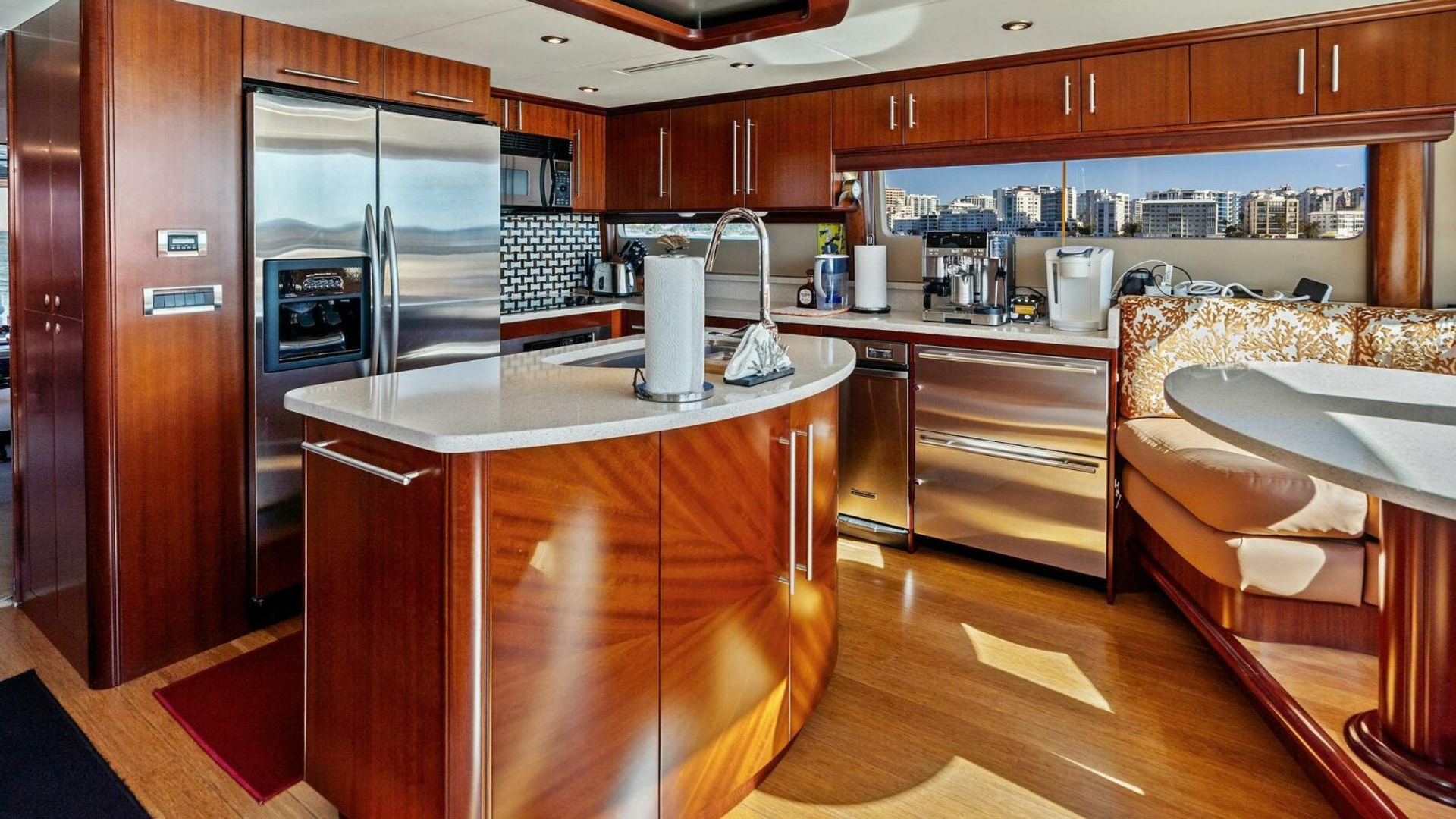 Forward, the country-kitchen-style galley is exceptionally well equipped with premium appliances, bamboo flooring, a large island, and casual dinette seating—ideal for owner-operators and crew alike.
