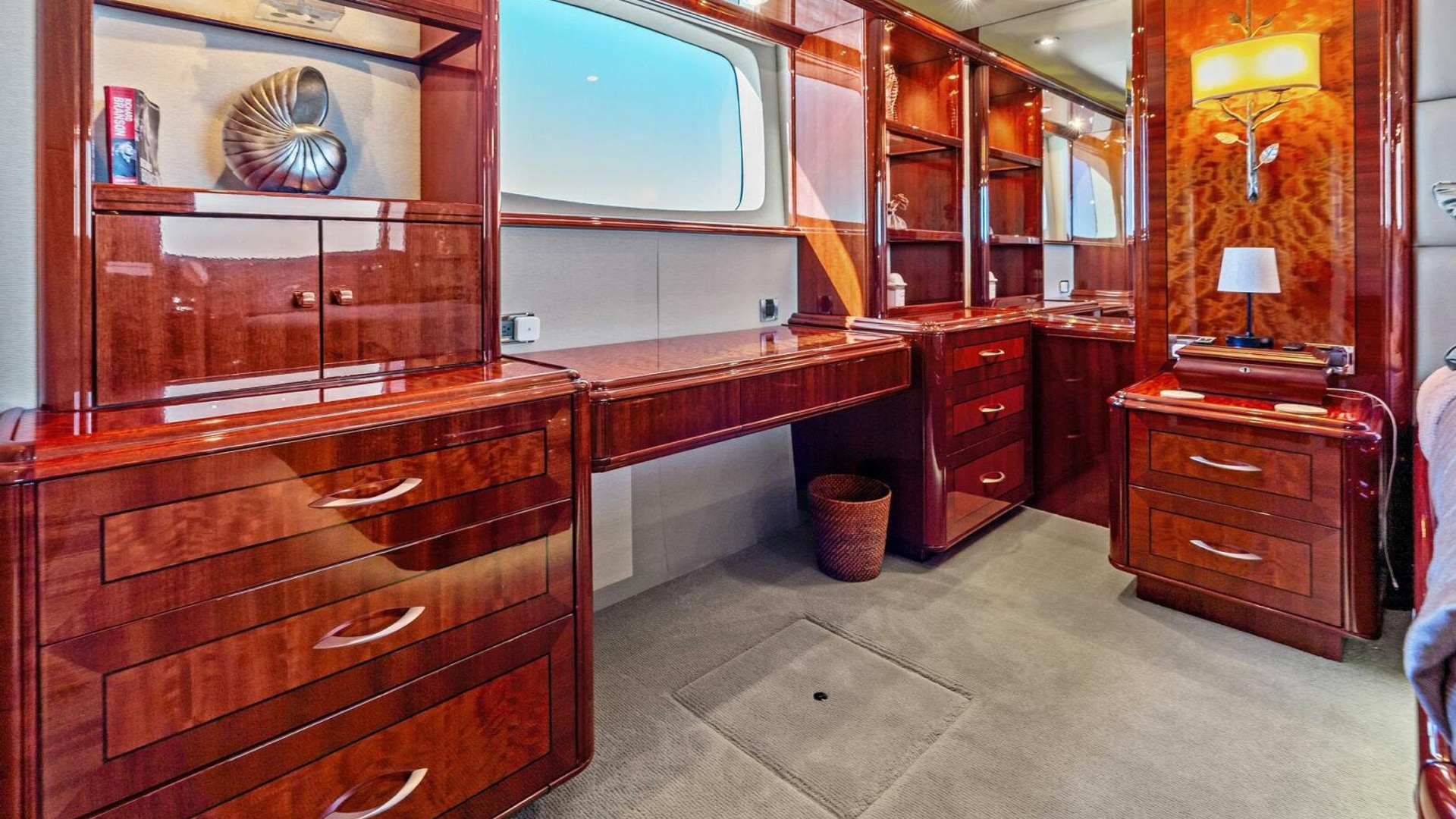- Large walk-in closet on Starboard side w/ 3 hanging rods and custom build wood shelves