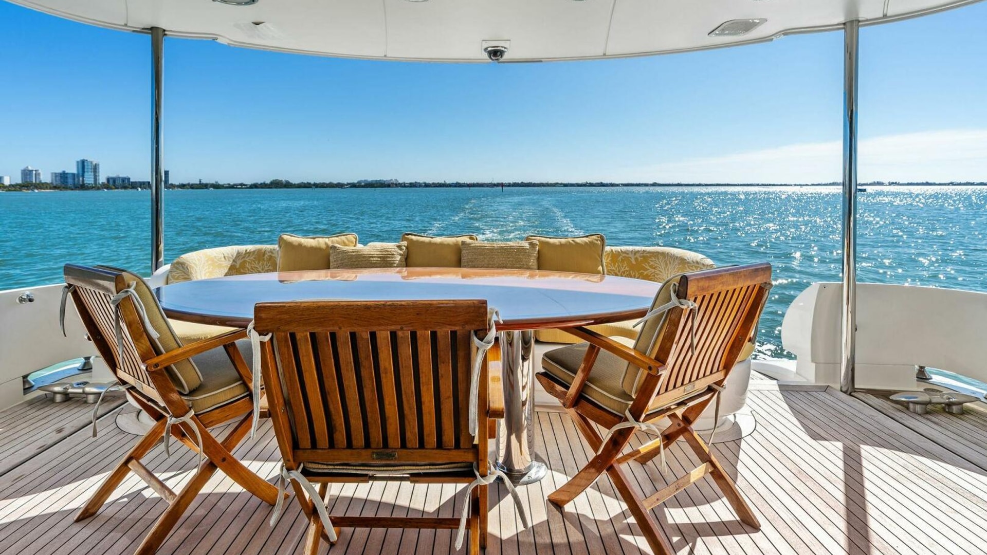 - Aft dining table with Bench seating, 3 teak chairs, and Epoxy Wood Table