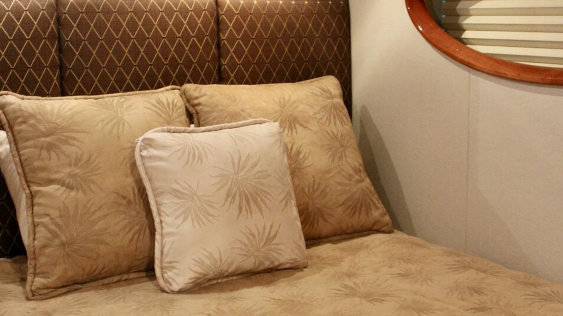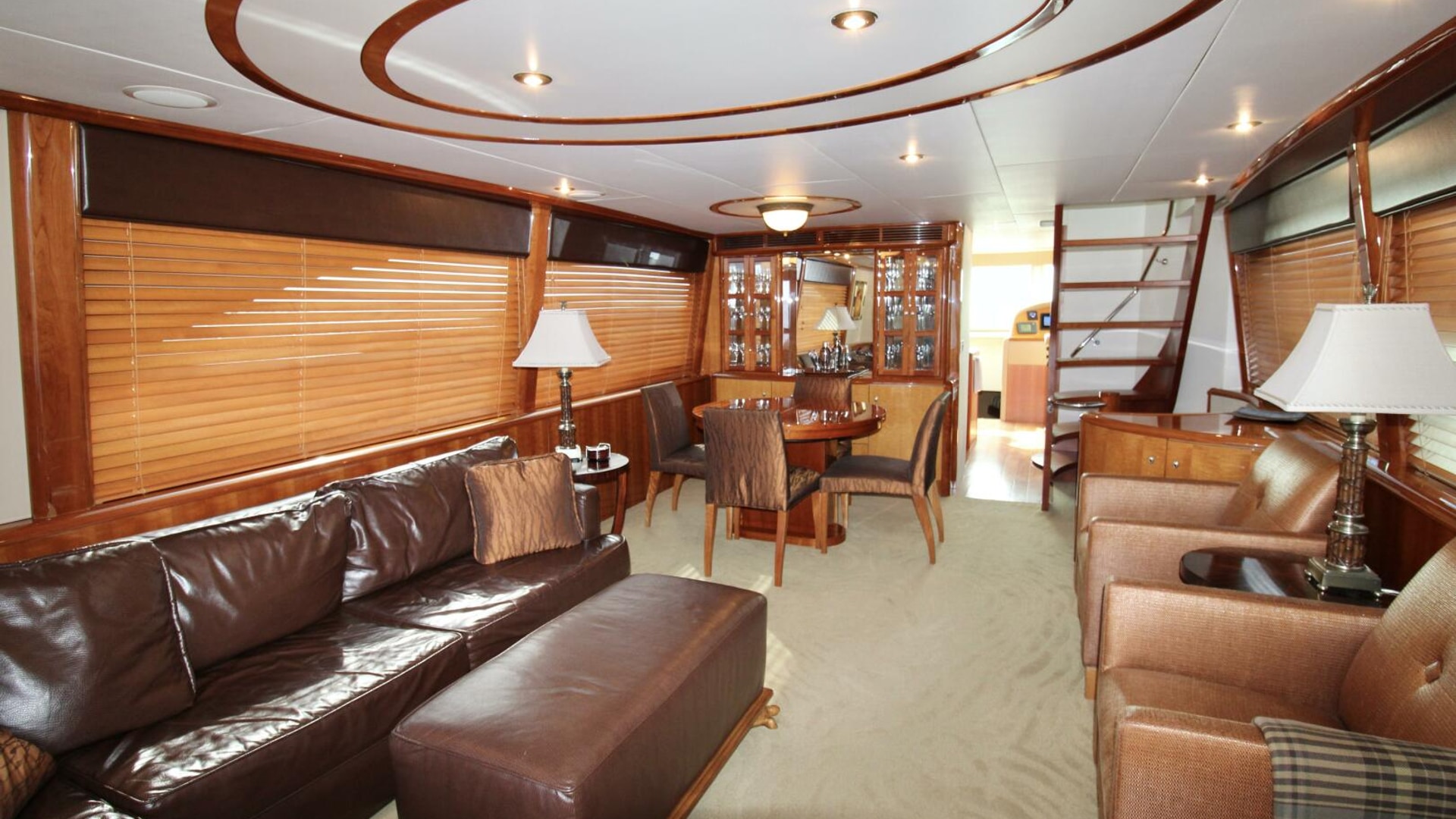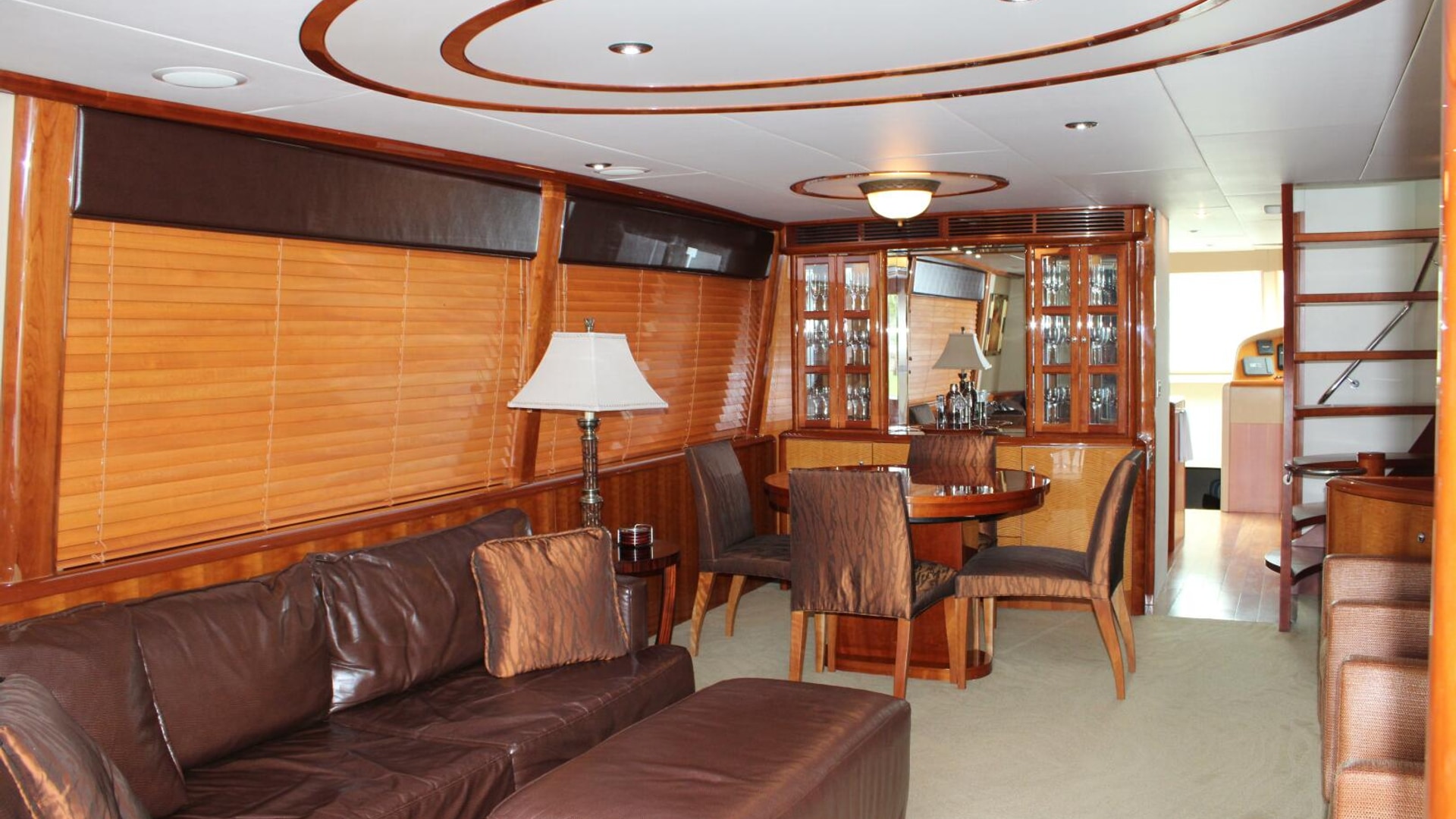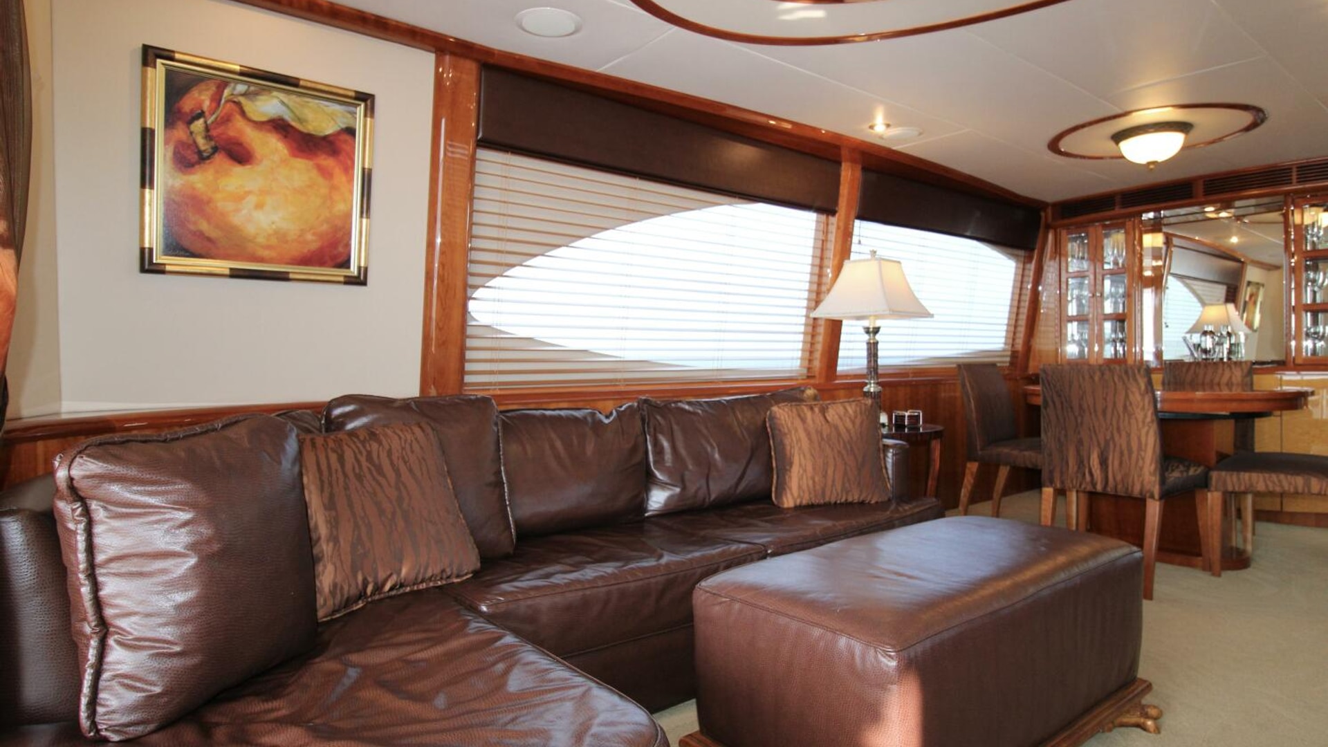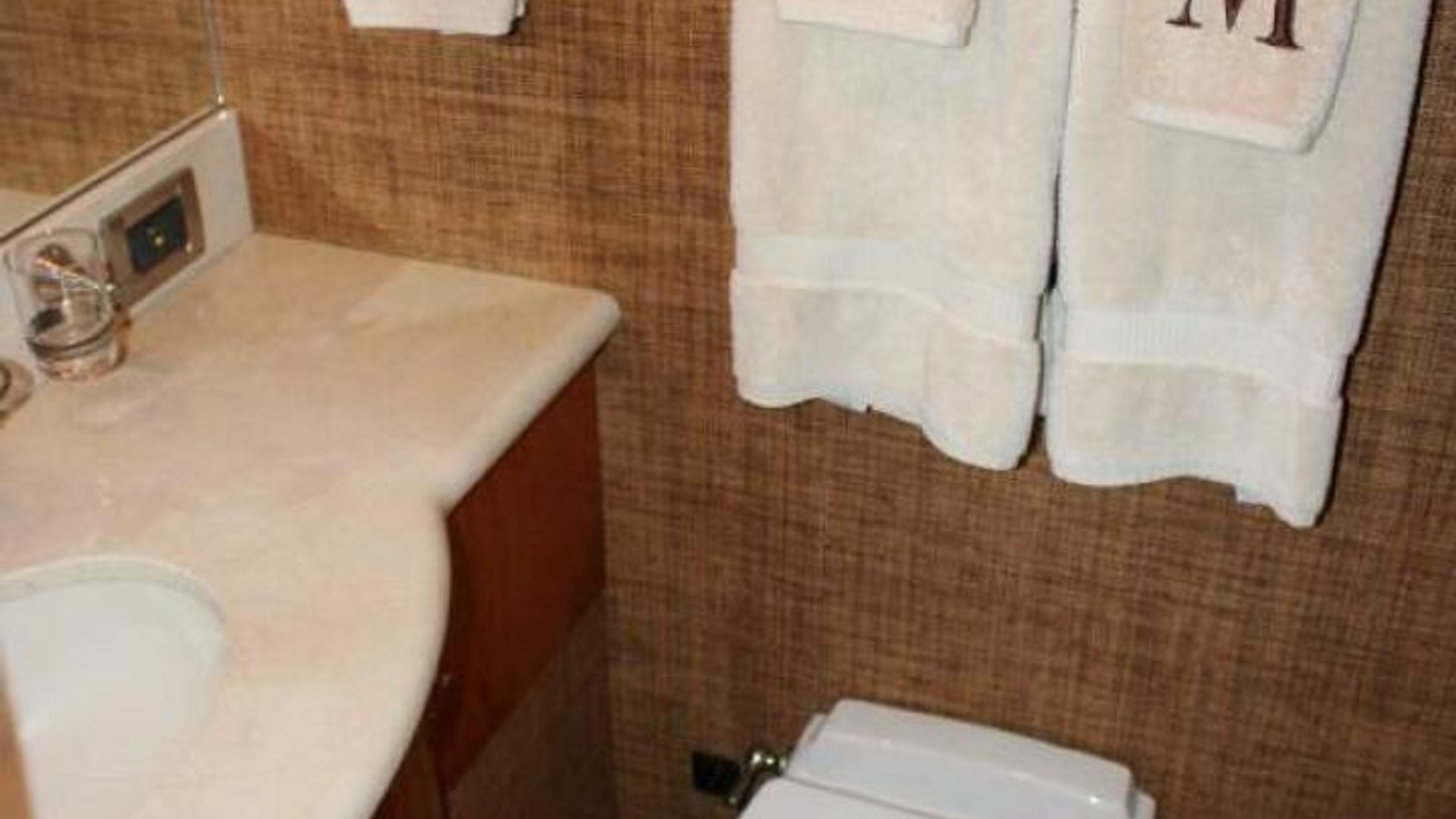 The exterior areas of this vessel are designed for fun and entertainment. On the forward deck is a large sun lounge. Aft is a submersible swim platform that makes launching of the 11’ Boston Whaler Dinghy a simple task. On the main aft deck is a full lounge and table, ideal for alfresco dinning or watching the TV. .Up on the flybridge is a large lounge with table as well as a full service bar with three bar stools, Icemaker, Grill and refrigerator. The luxurious interior is observed as you enter the salon door, with a full sofa to port. Forward of the sofa is the formal dining table with chairs. To starboard are two occasional chairs and entry to the day head. Forward is the “Country Kitchen styled galley with every appliance needed to prepare a gourmet meal with dinette. Forward is a crew lounge and stateroom. Below decks, accessed via a salon stairwell, are the full beam master stateroom and two matching guest staterooms with double sized berths. There is no space throughout the entire interior of this yacht that feels crowded.