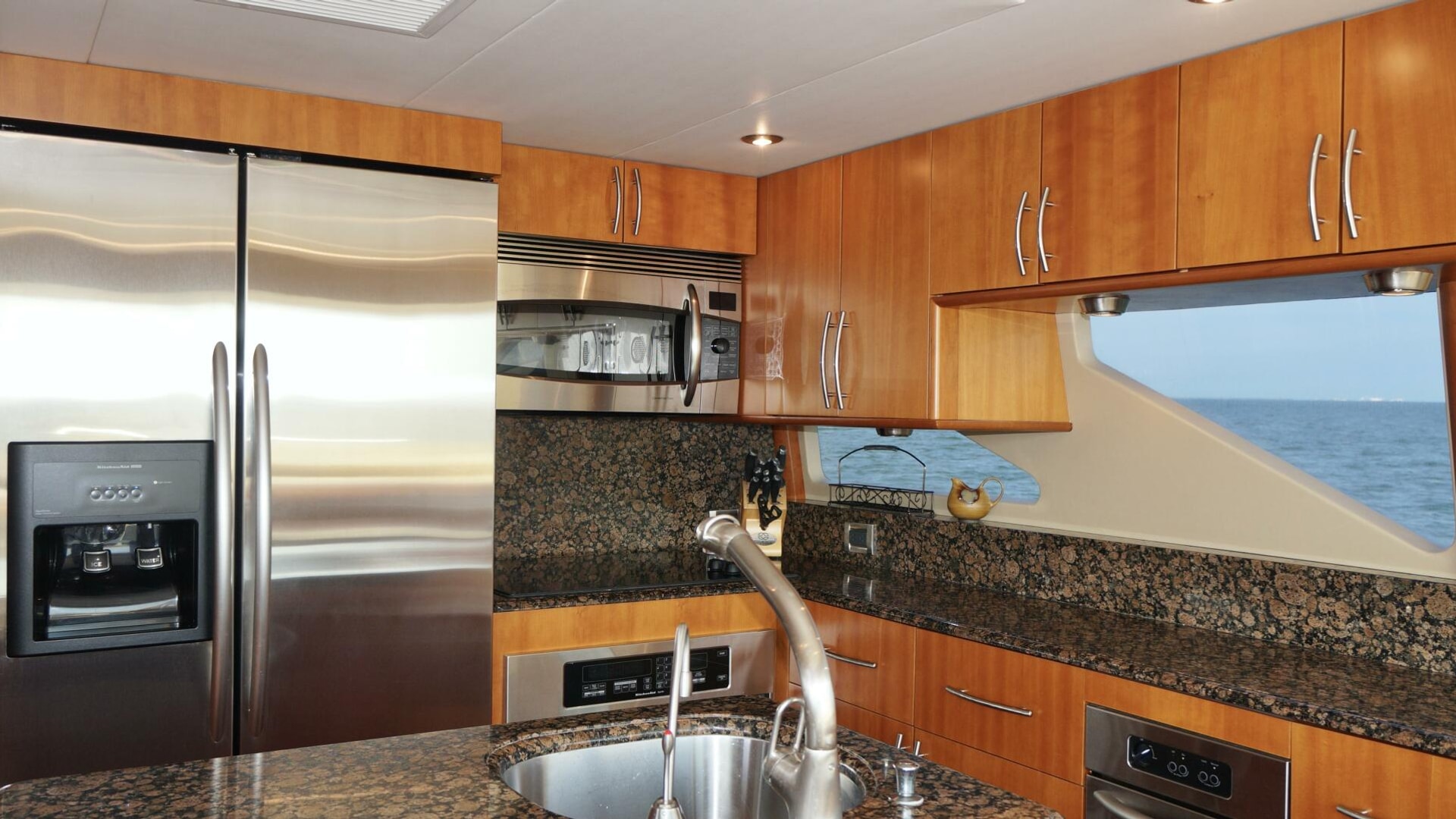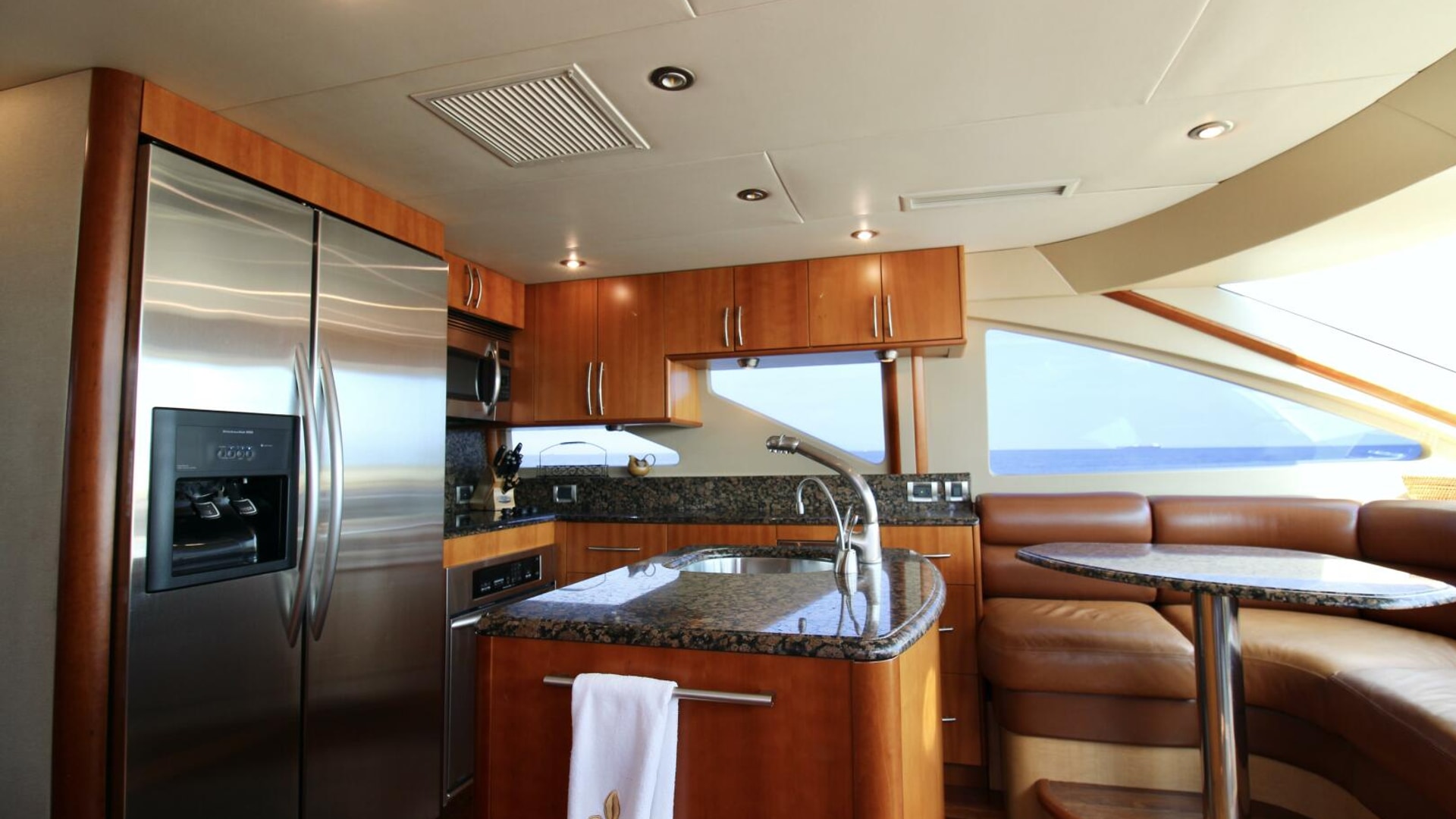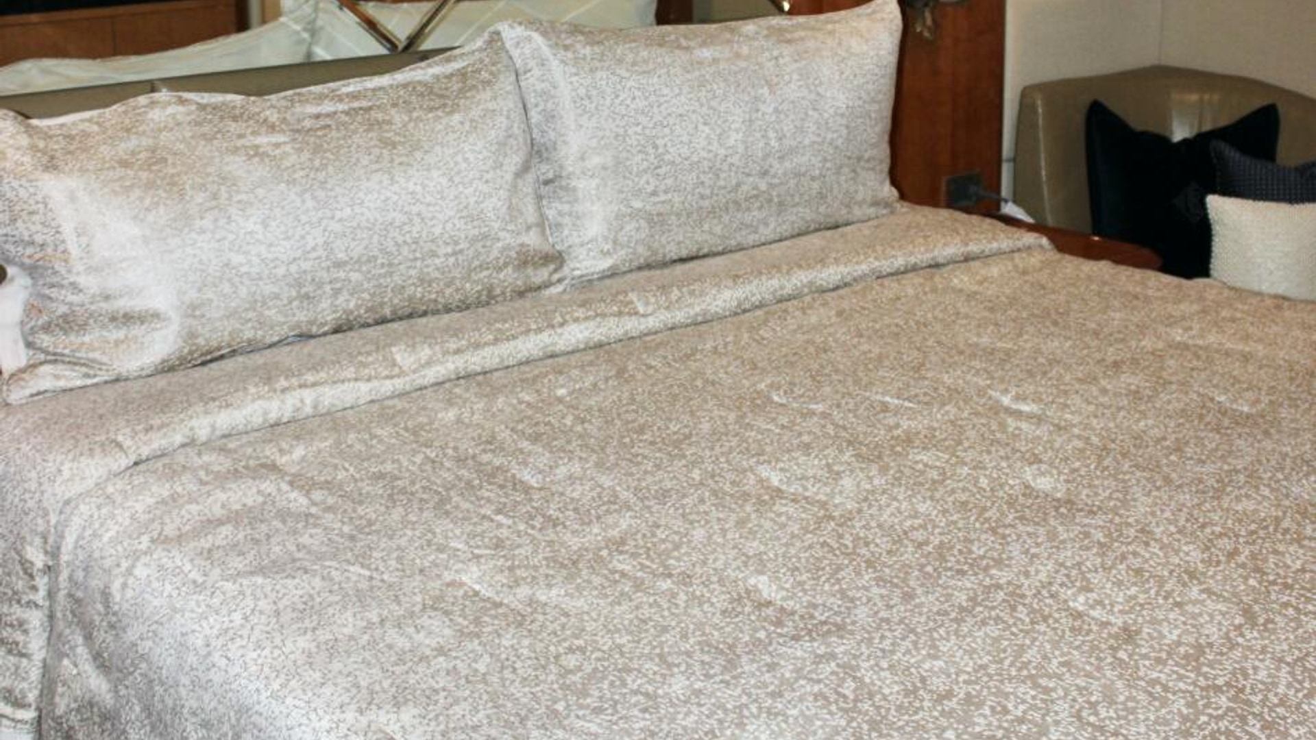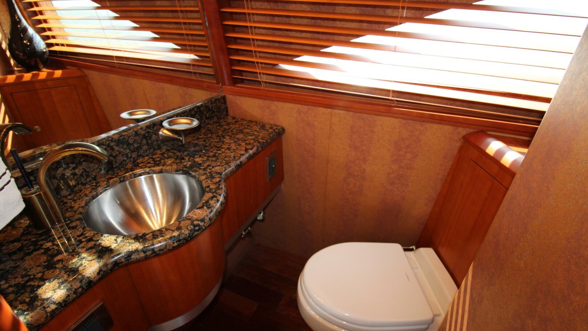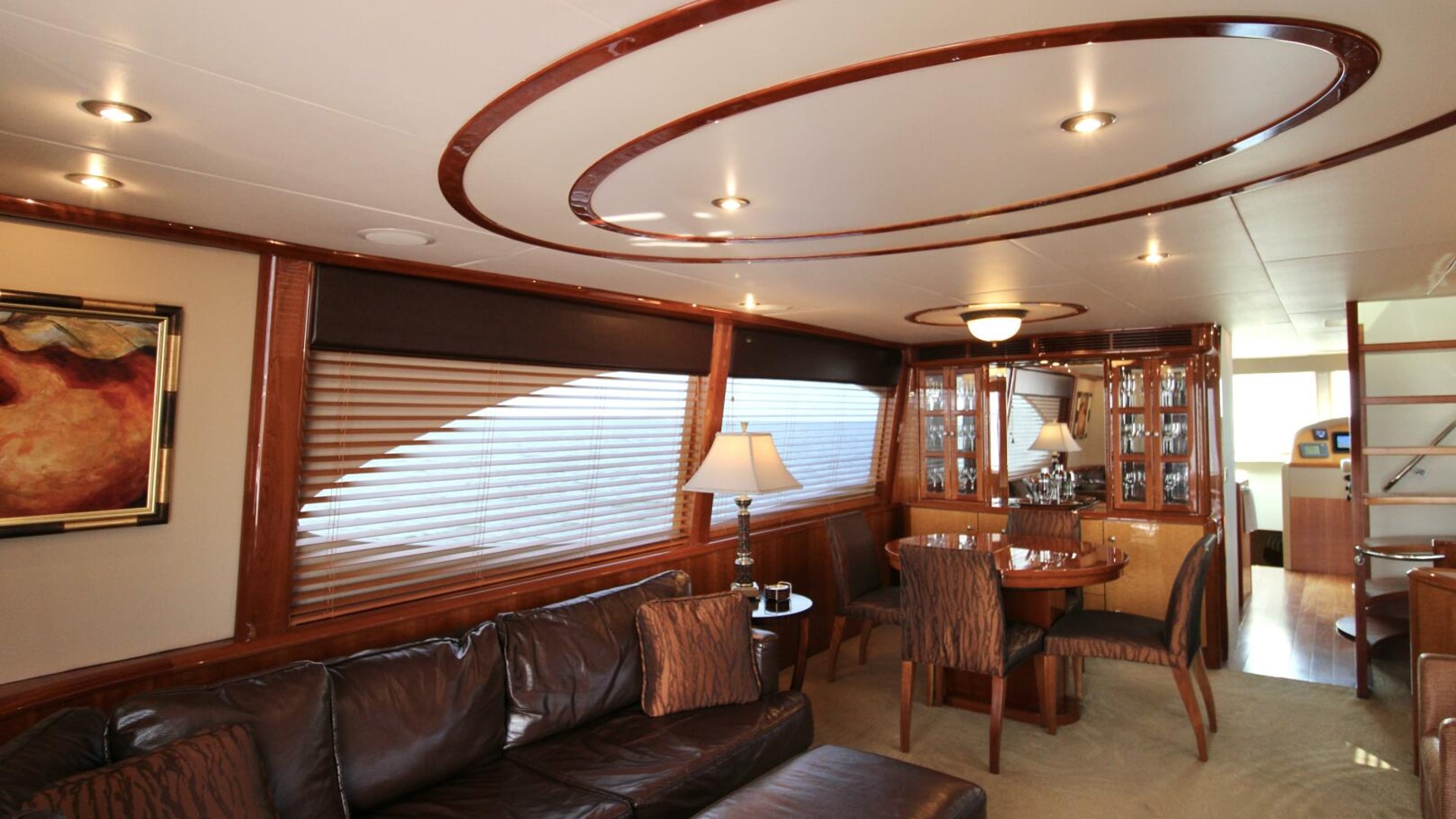 The exterior areas of this vessel are designed for fun and entertainment. On the forward deck is a large sun lounge. Aft is a submersible swim platform that makes launching of the 11’ Boston Whaler Dinghy a simple task. On the main aft deck is a full lounge and table, ideal for alfresco dinning or watching the TV. .Up on the flybridge is a large lounge with table as well as a full service bar with three bar stools, Icemaker, Grill and refrigerator. The luxurious interior is observed as you enter the salon door, with a full sofa to port. Forward of the sofa is the formal dining table with chairs. To starboard are two occasional chairs and entry to the day head. Forward is the “Country Kitchen styled galley with every appliance needed to prepare a gourmet meal with dinette. Forward is a crew lounge and stateroom. Below decks, accessed via a salon stairwell, are the full beam master stateroom and two matching guest staterooms with double sized berths. There is no space throughout the entire interior of this yacht that feels crowded.