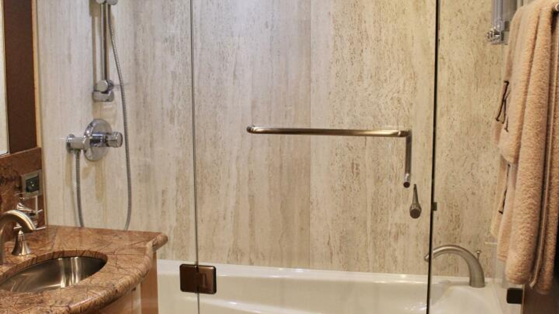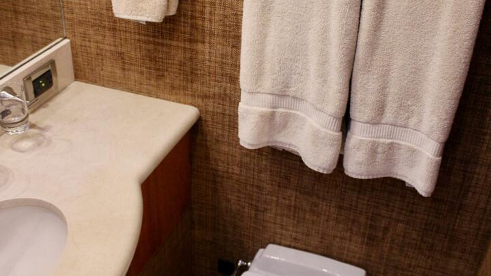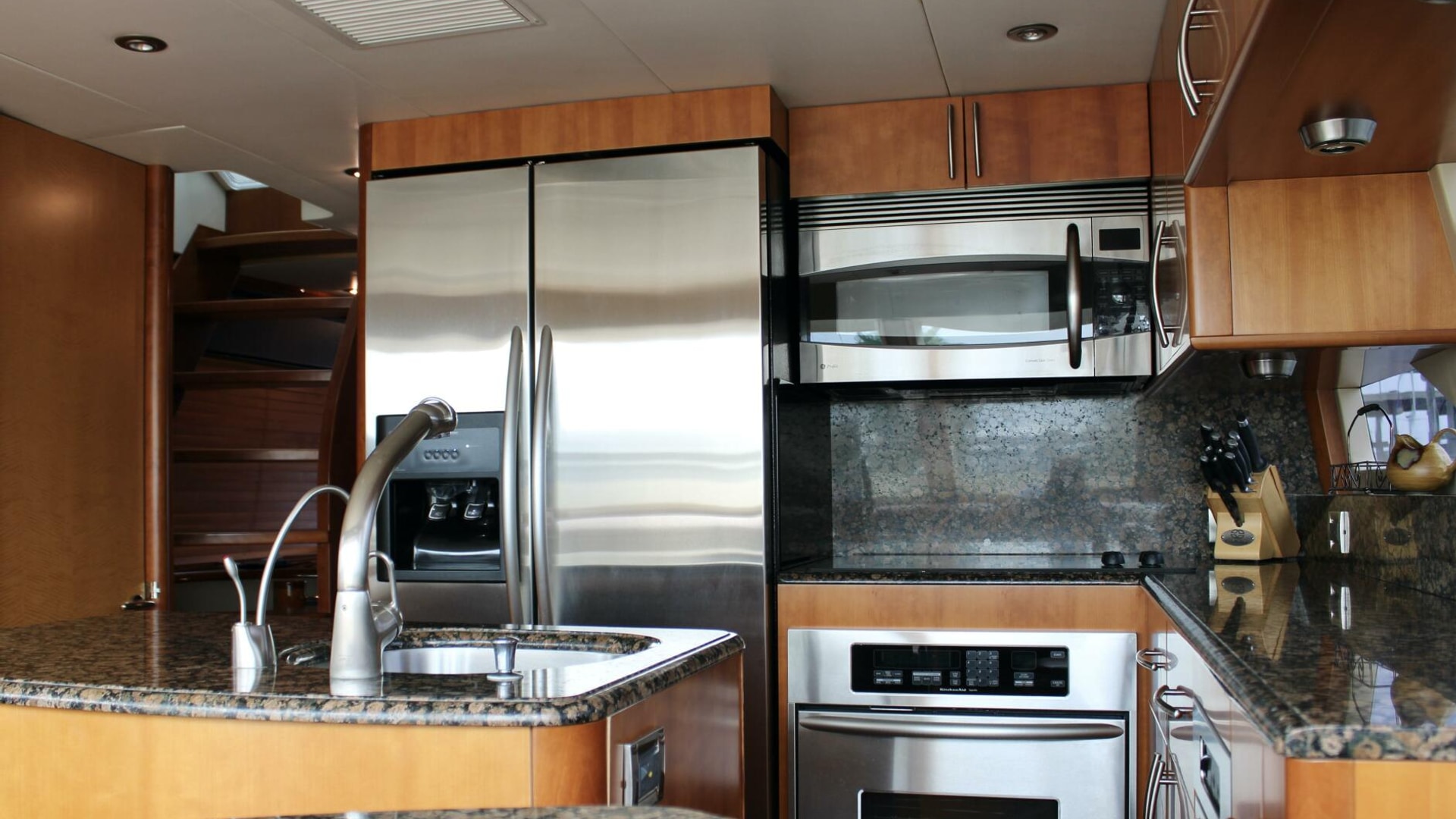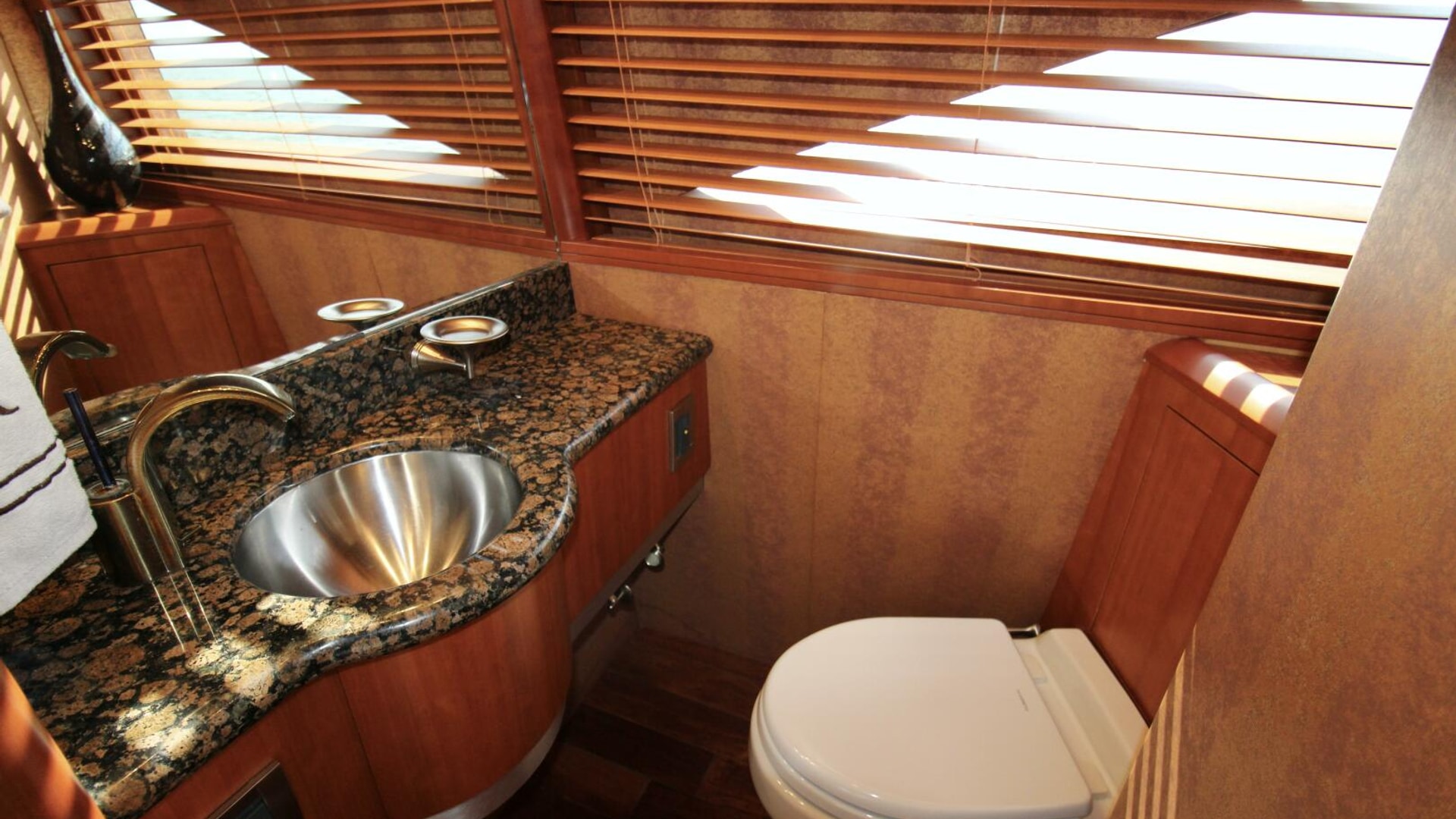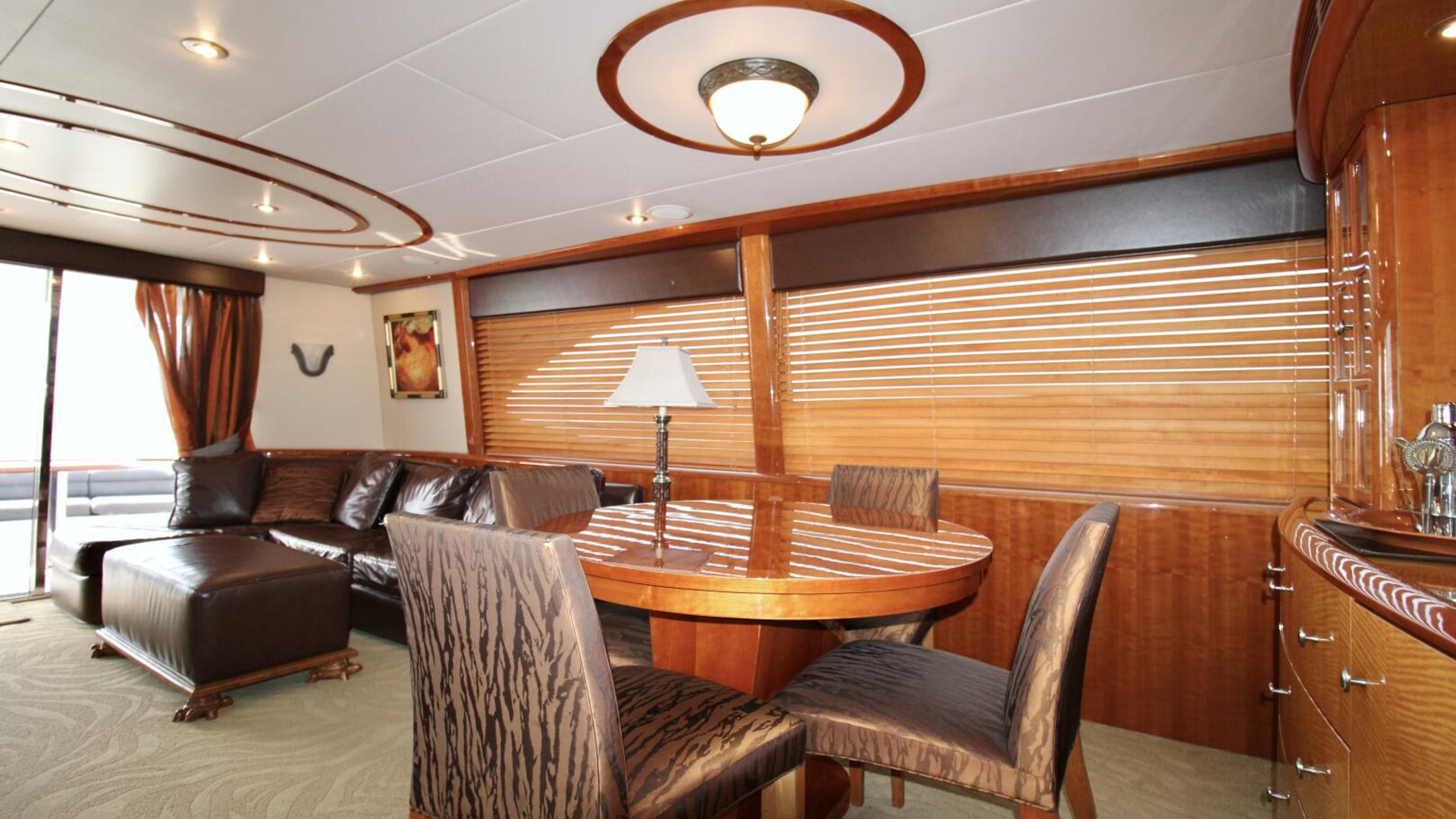 The exterior areas of this vessel are designed for fun and entertainment. On the forward deck is a large sun lounge. Aft is a submersible swim platform that makes launching of the 11’ Boston Whaler Dinghy a simple task. On the main aft deck is a full lounge and table, ideal for alfresco dinning or watching the TV. .Up on the flybridge is a large lounge with table as well as a full service bar with three bar stools, Icemaker, Grill and refrigerator. The luxurious interior is observed as you enter the salon door, with a full sofa to port. Forward of the sofa is the formal dining table with chairs. To starboard are two occasional chairs and entry to the day head. Forward is the “Country Kitchen styled galley with every appliance needed to prepare a gourmet meal with dinette. Forward is a crew lounge and stateroom. Below decks, accessed via a salon stairwell, are the full beam master stateroom and two matching guest staterooms with double sized berths. There is no space throughout the entire interior of this yacht that feels crowded.
