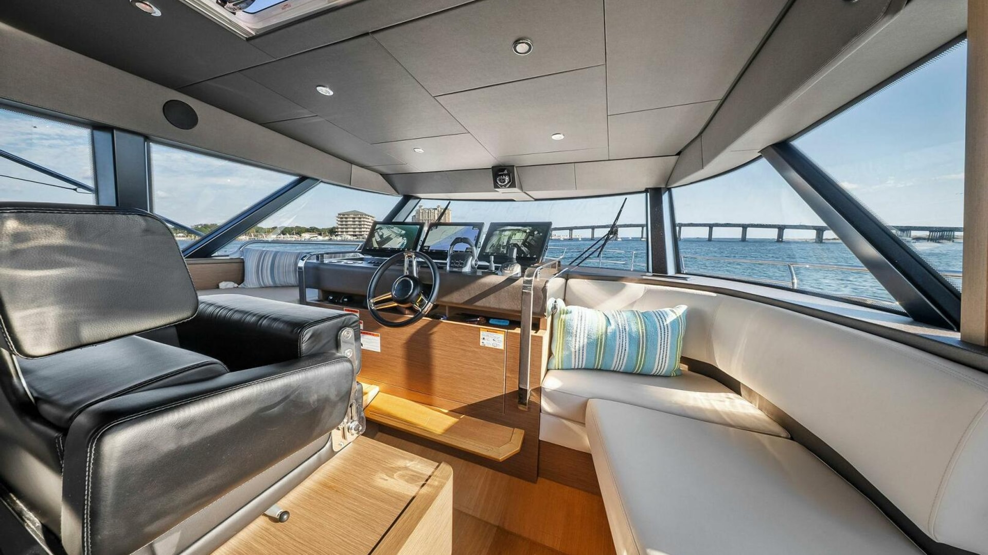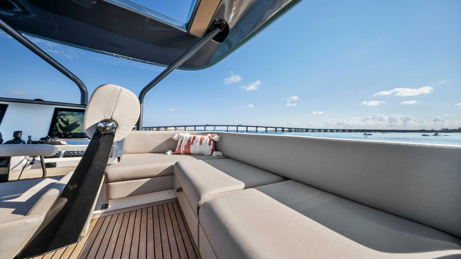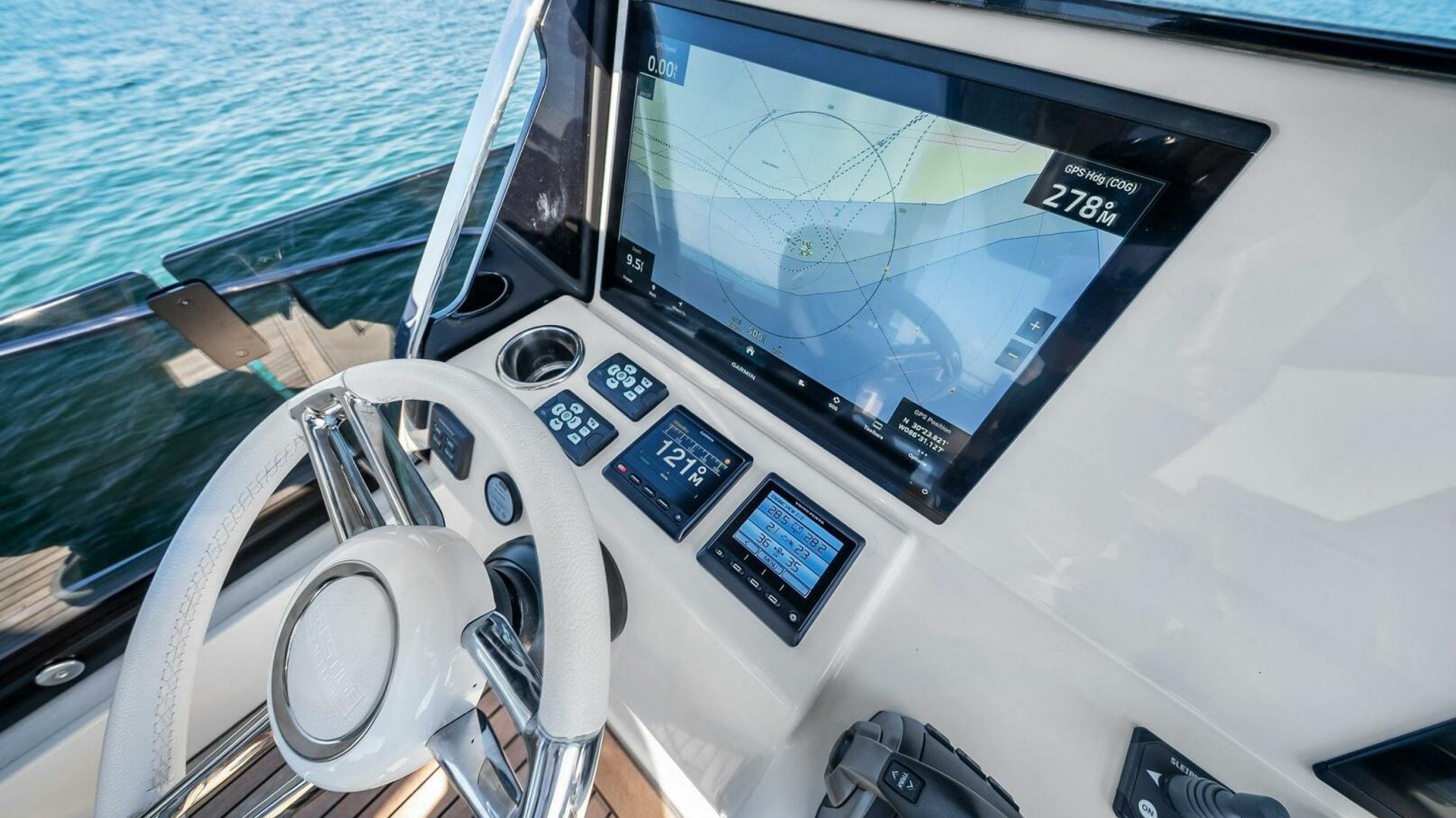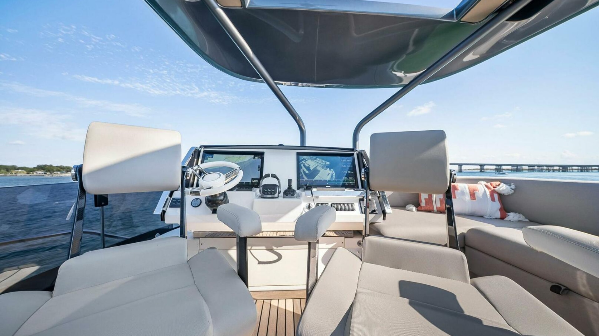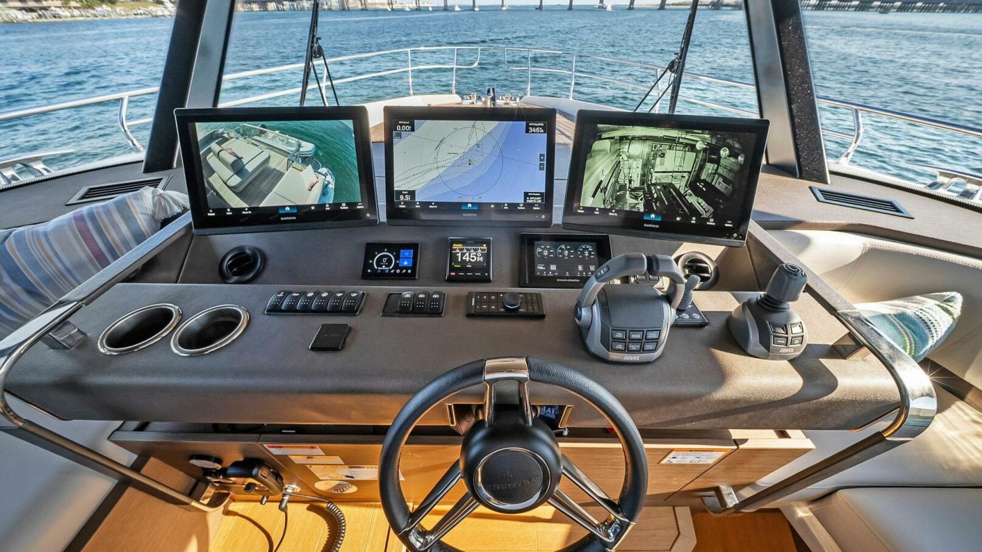 - Helm with Garmin Chartplotters, Volvo IPS Joystick, VHF, Compass, Sounder, Radar, Seakeeper Controls