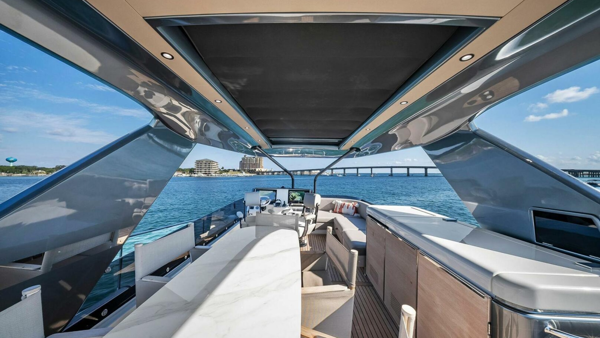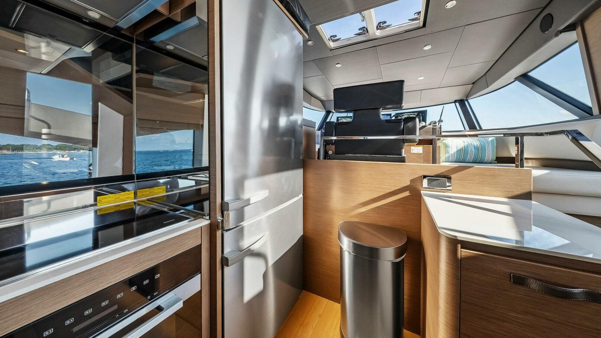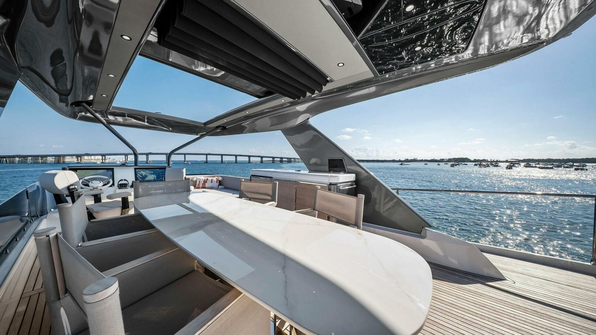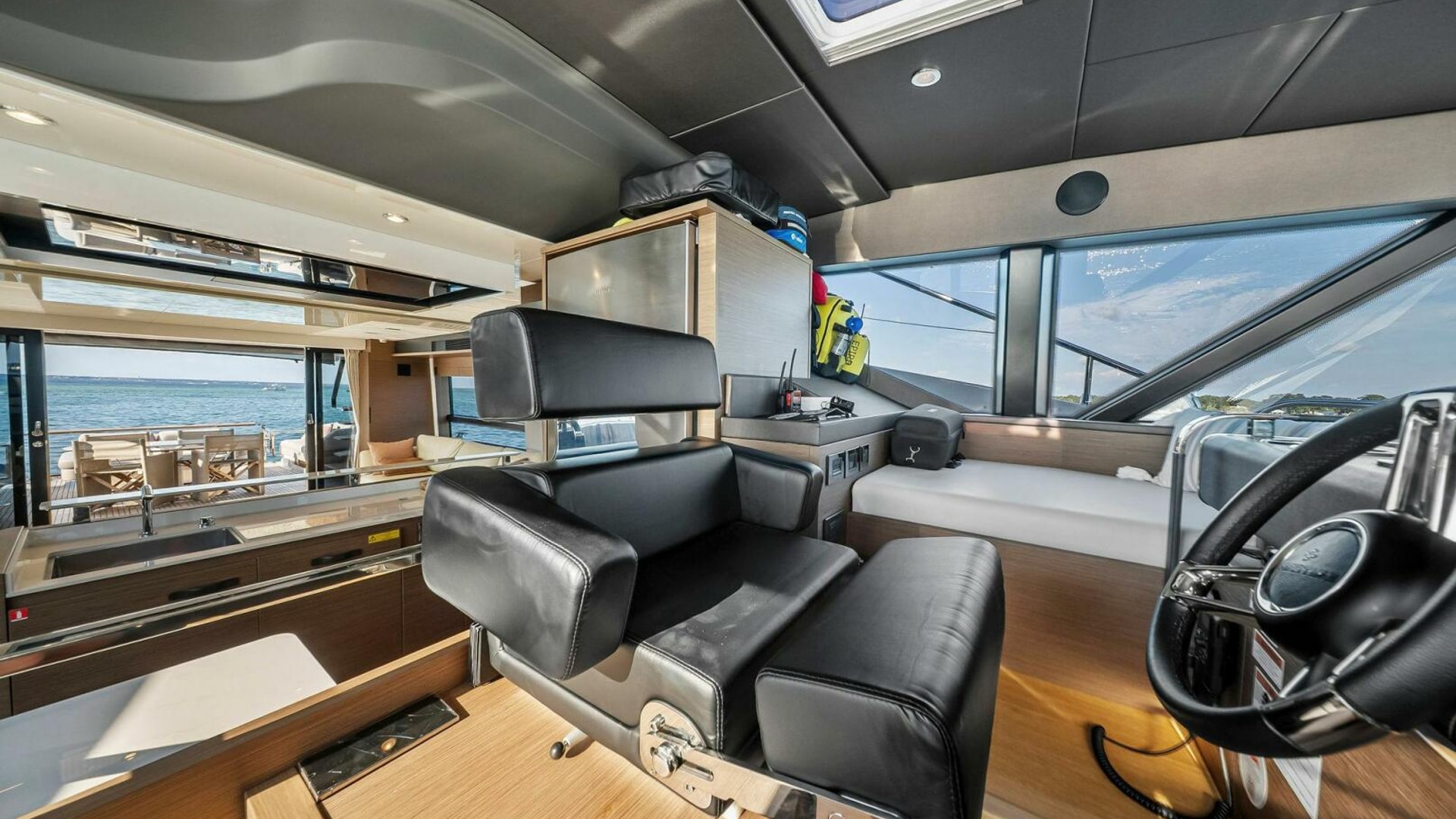 - Helm with Garmin Chartplotters, Volvo IPS Joystick, VHF, Compass, Sounder, Radar, Seakeeper Controls