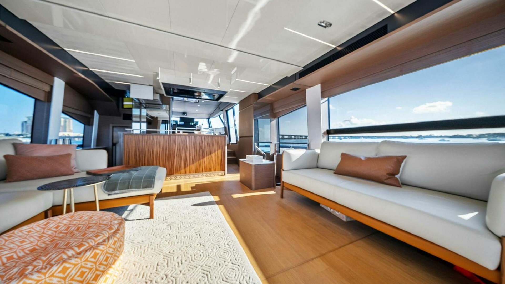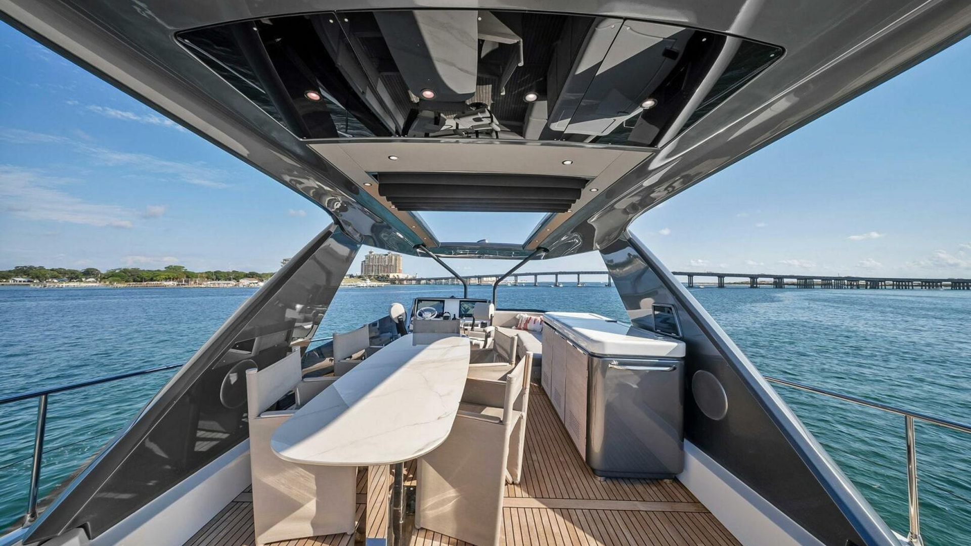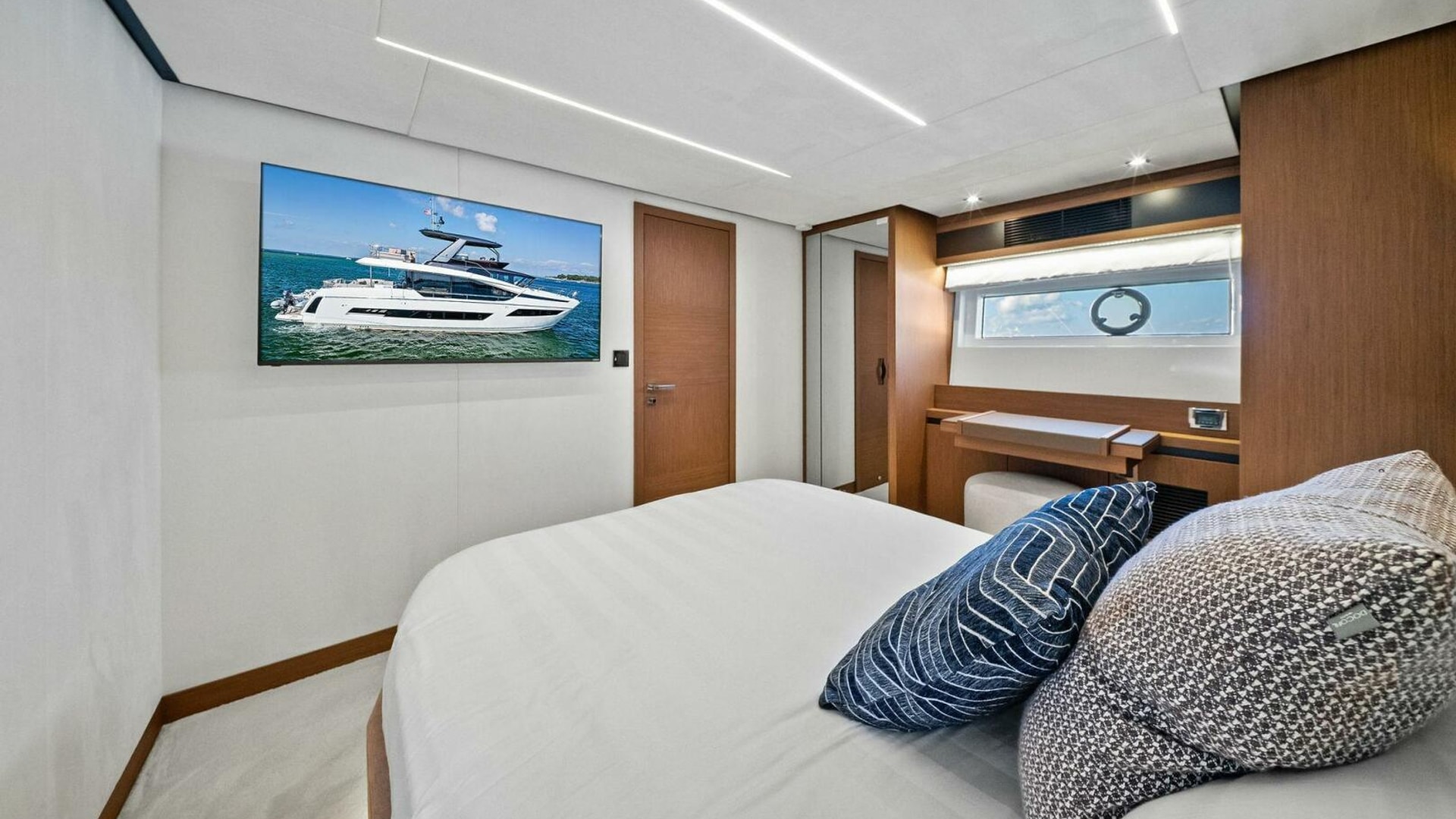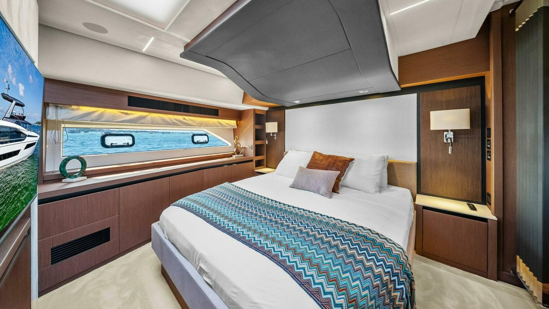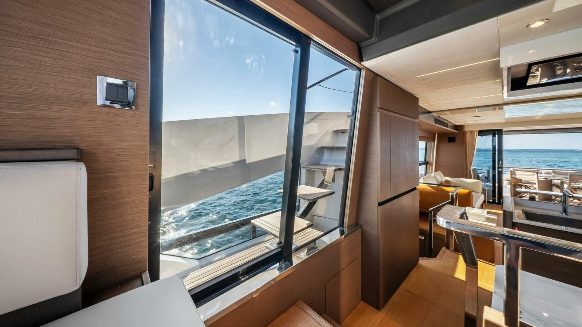 - Helm with Garmin Chartplotters, Volvo IPS Joystick, VHF, Compass, Sounder, Radar, Seakeeper Controls