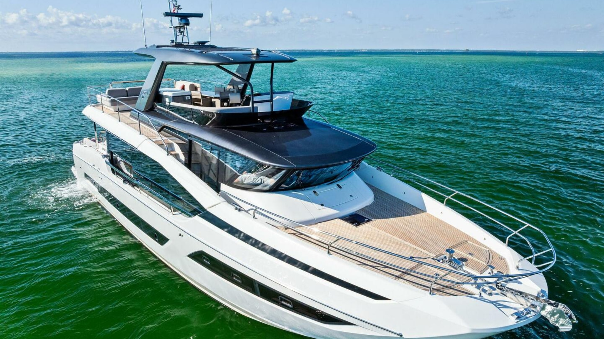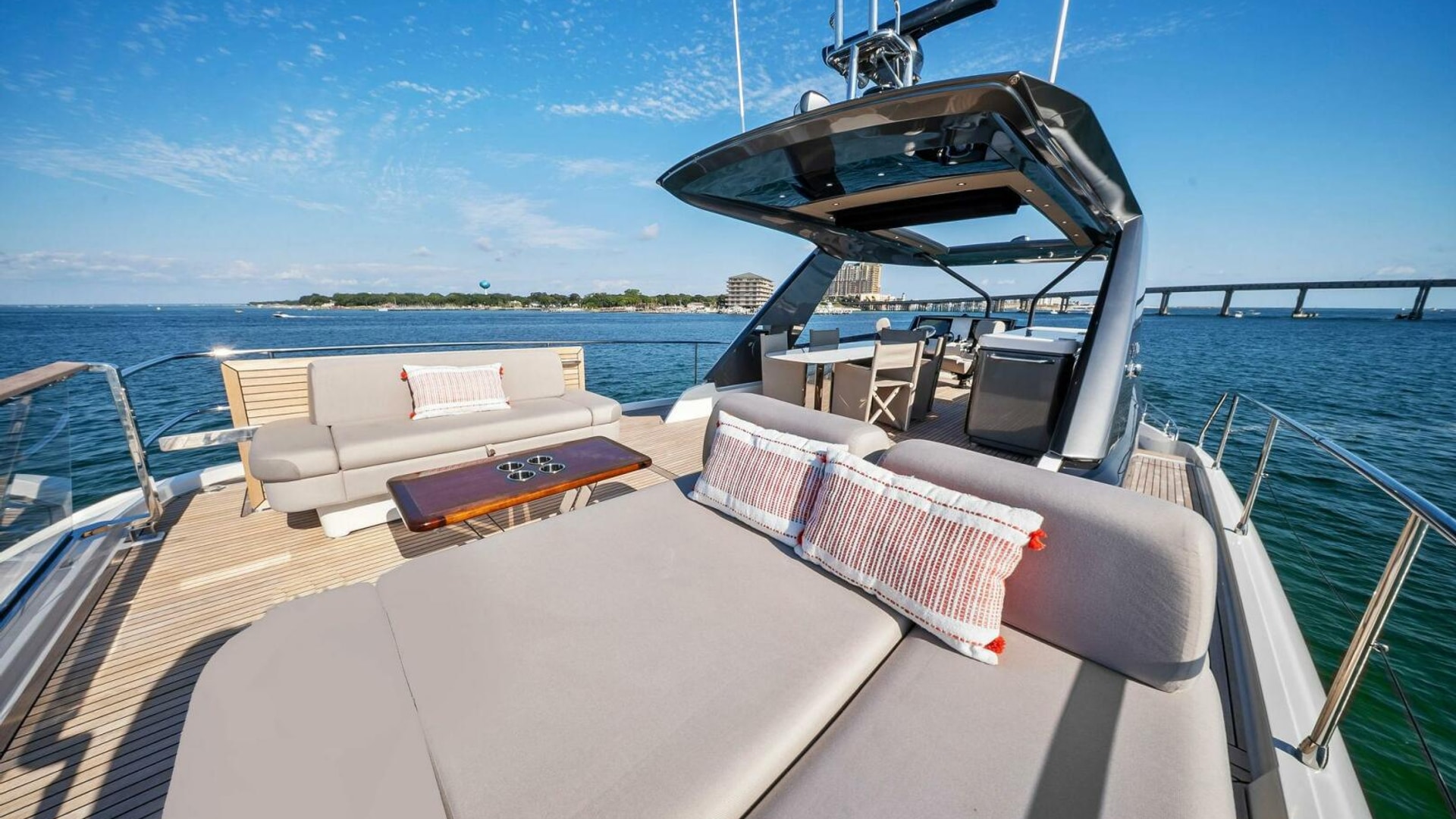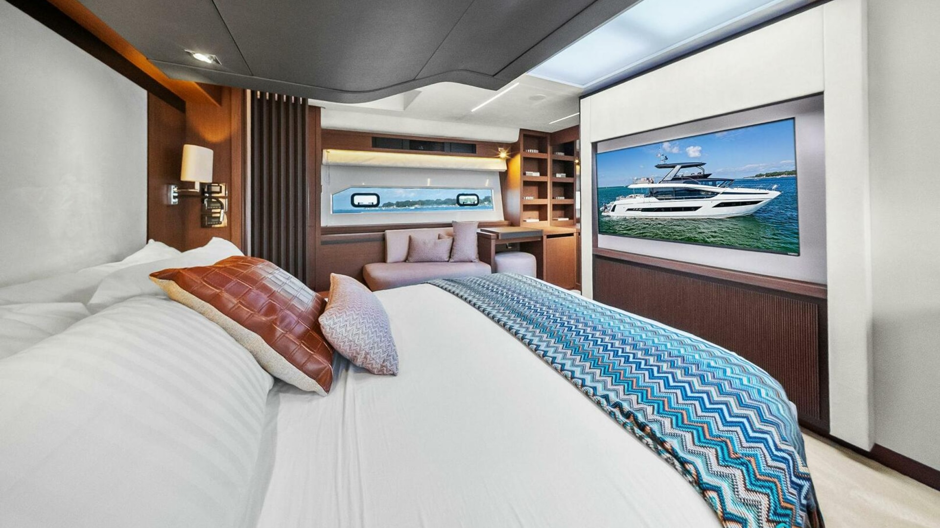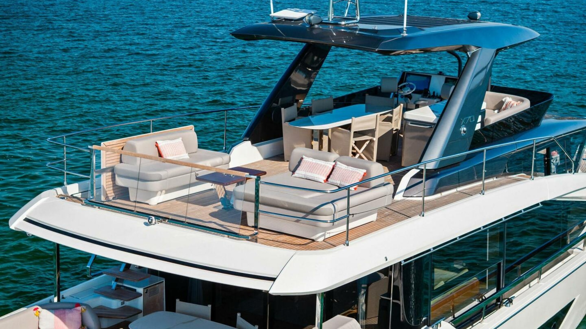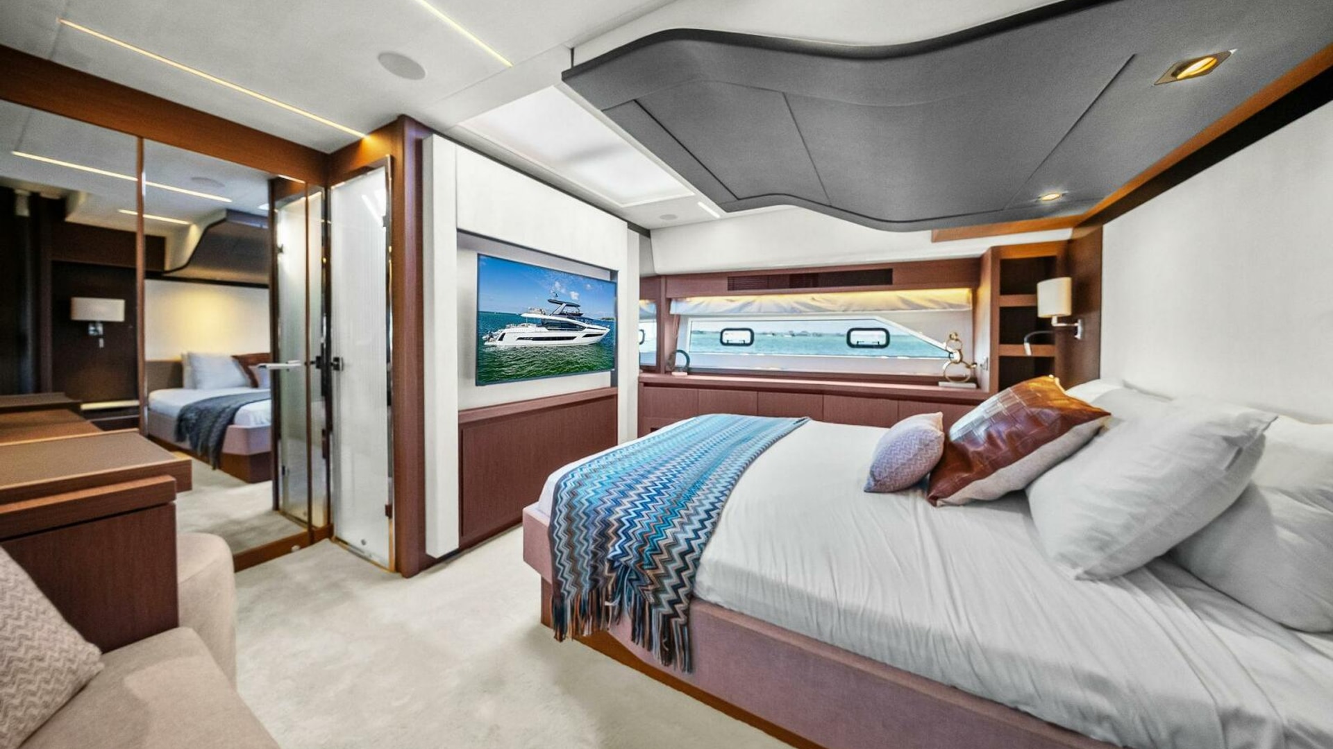 - Helm with Garmin Chartplotters, Volvo IPS Joystick, VHF, Compass, Sounder, Radar, Seakeeper Controls