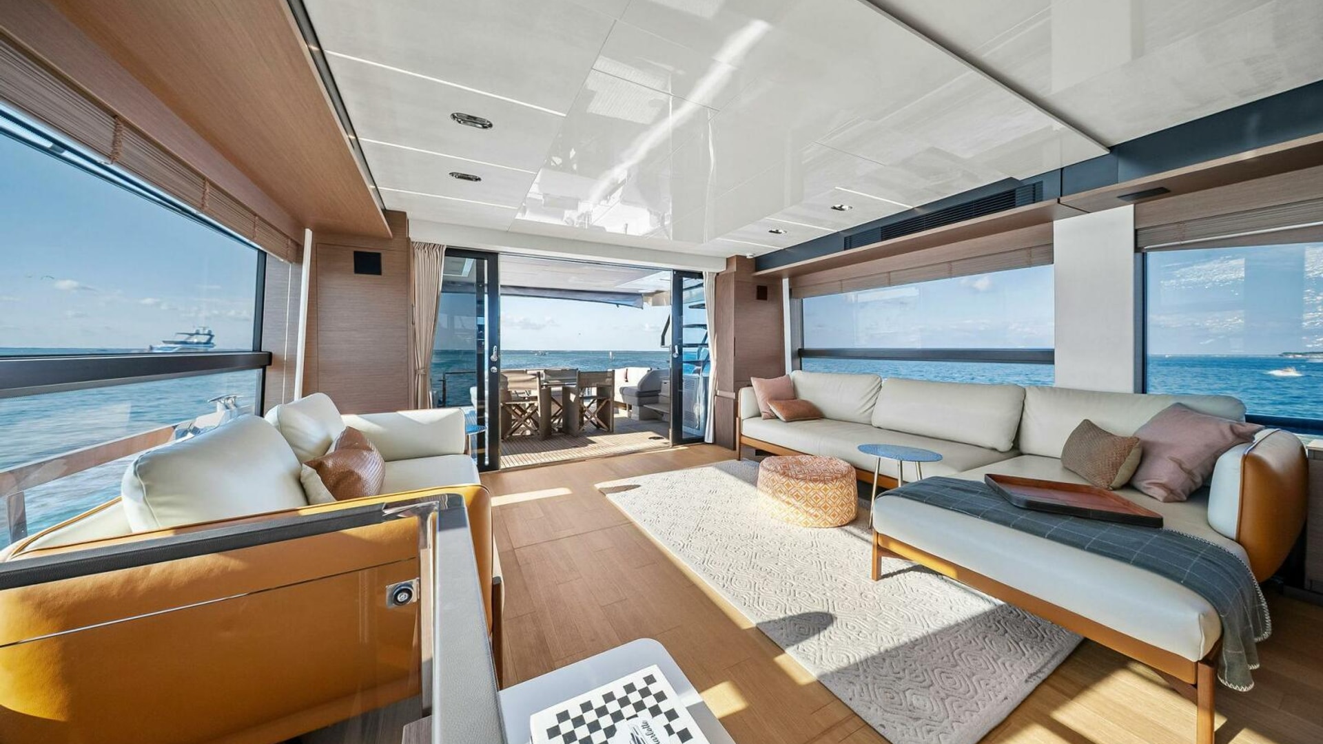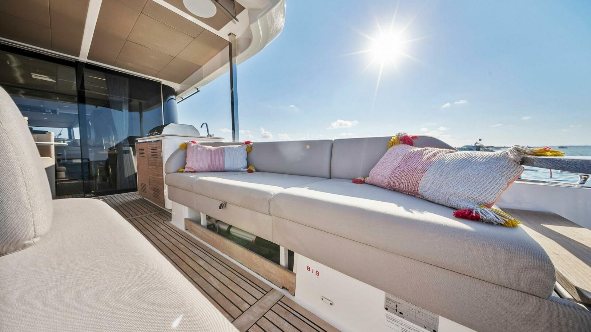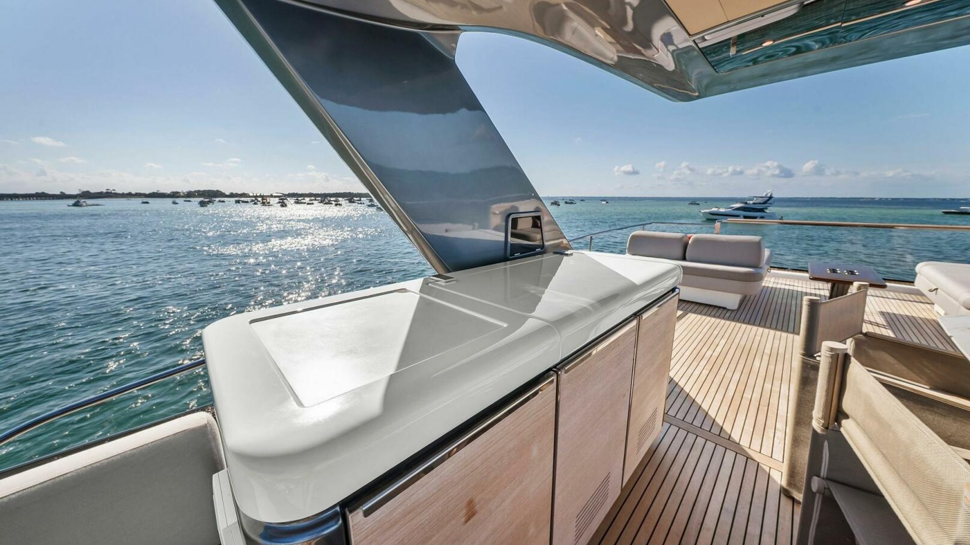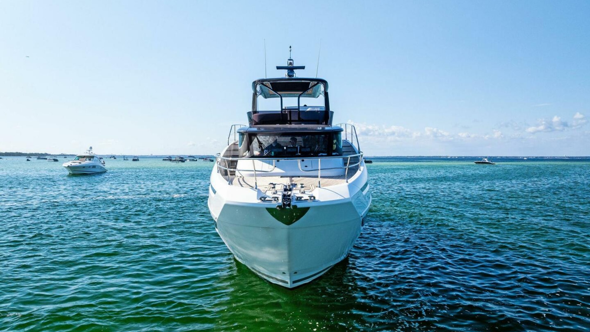 - Helm with Garmin Chartplotters, Volvo IPS Joystick, VHF, Compass, Sounder, Radar, Seakeeper Controls