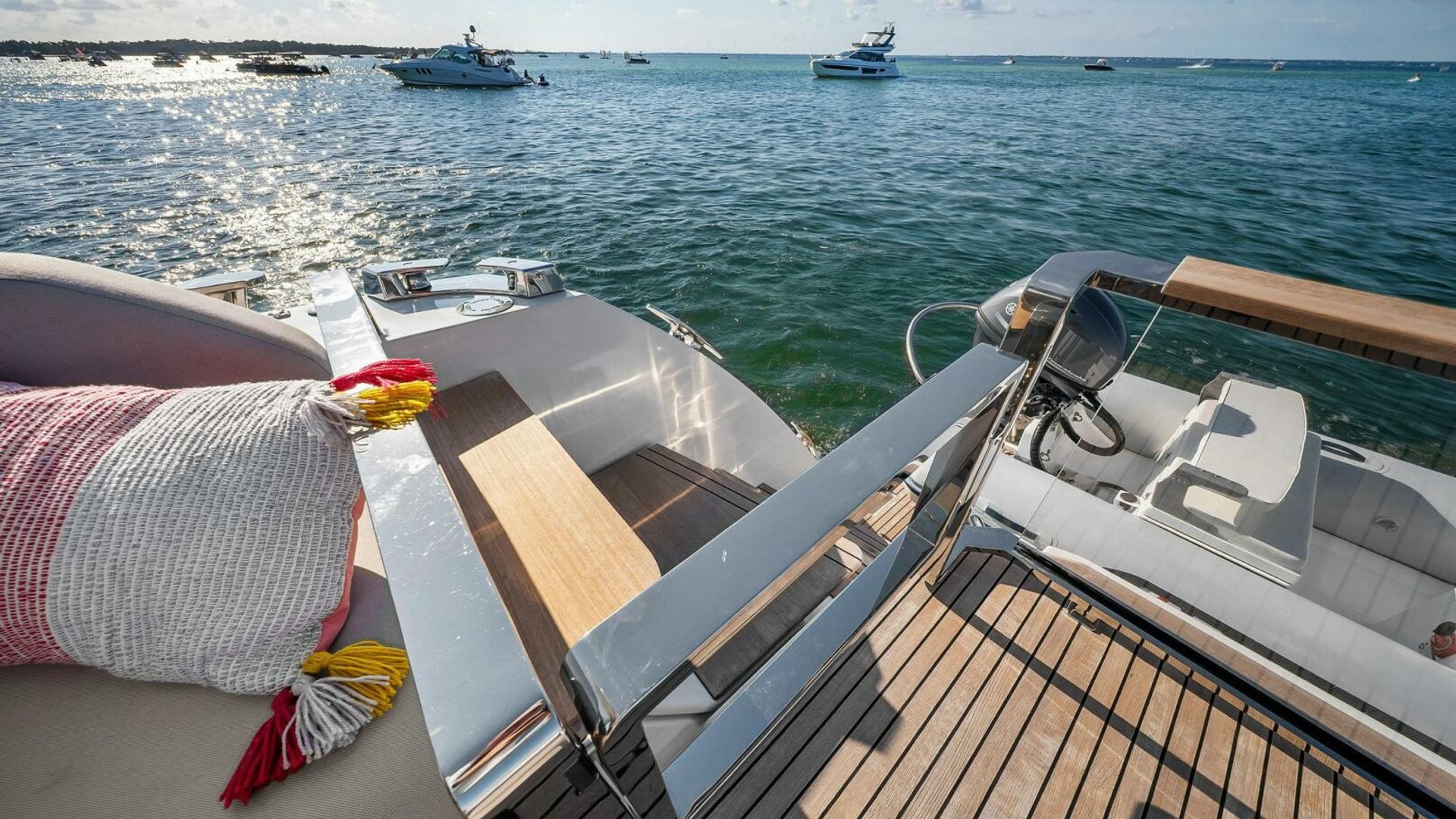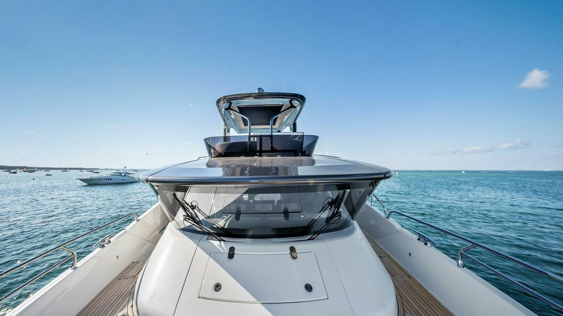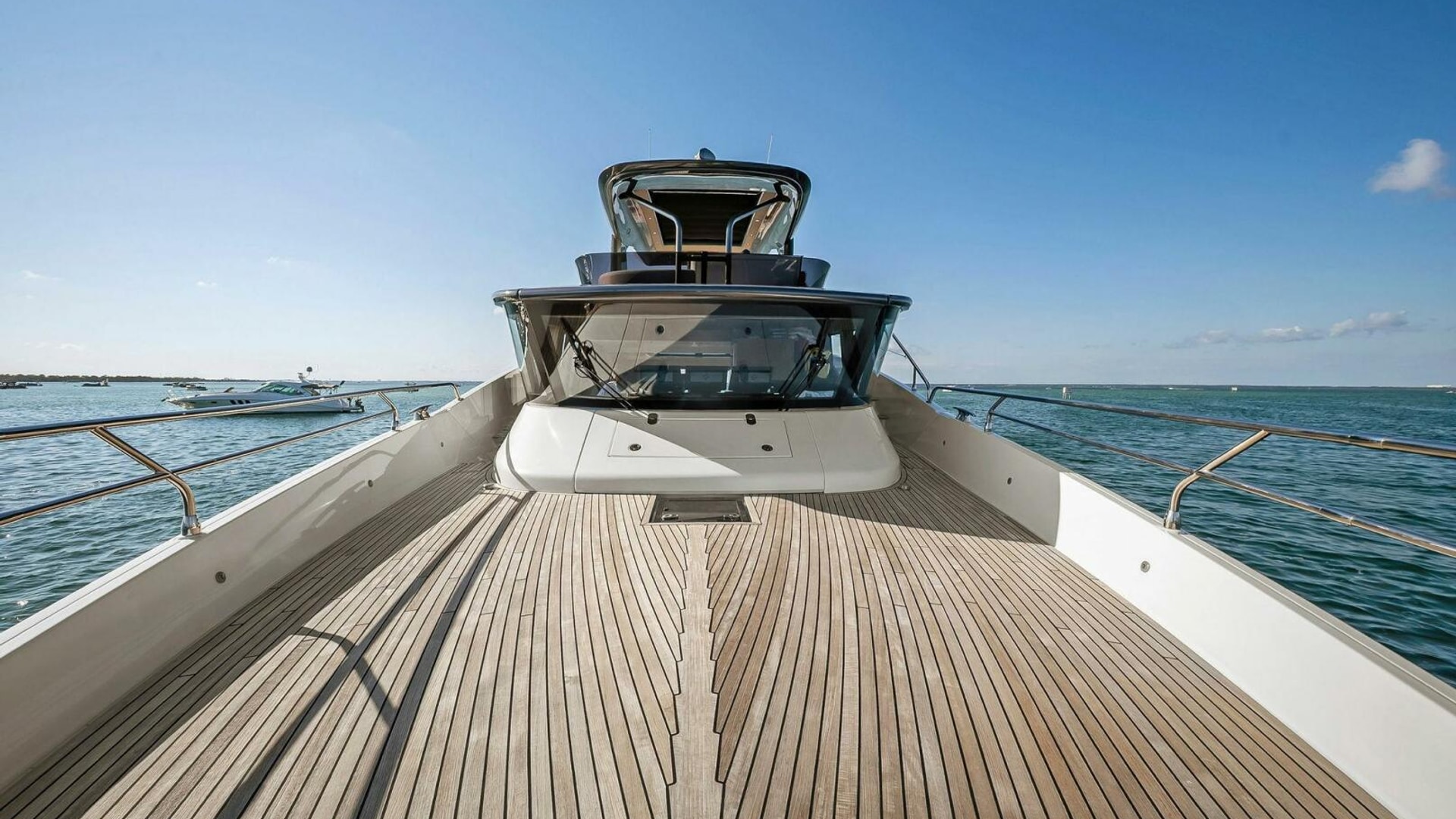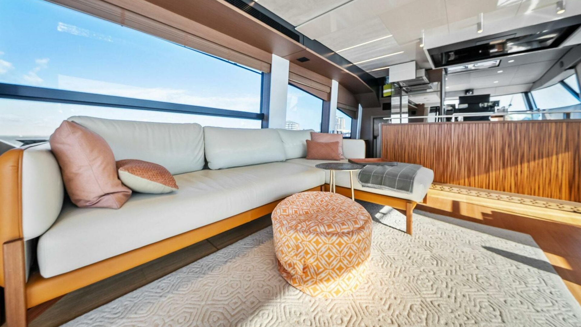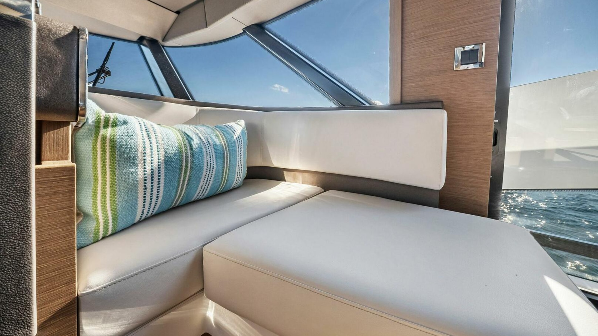- Helm with Garmin Chartplotters, Volvo IPS Joystick, VHF, Compass, Sounder, Radar, Seakeeper Controls