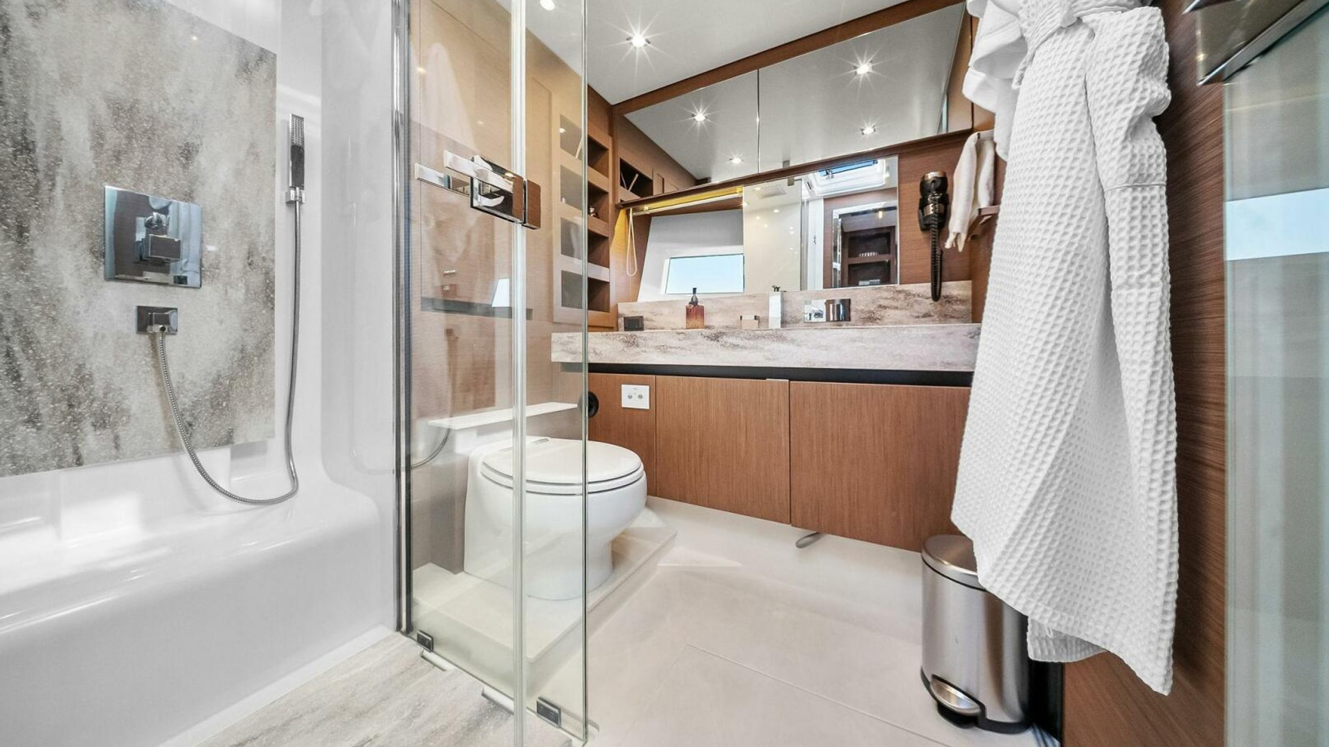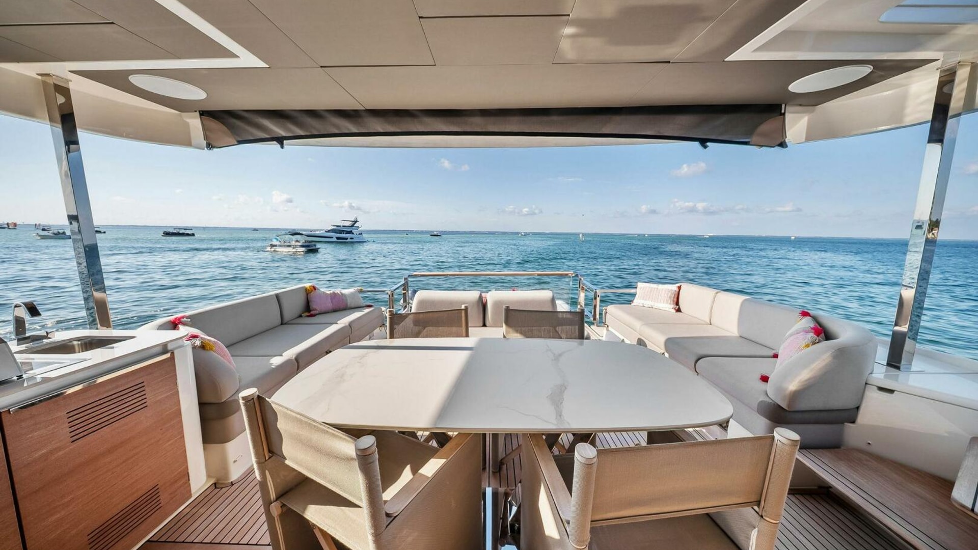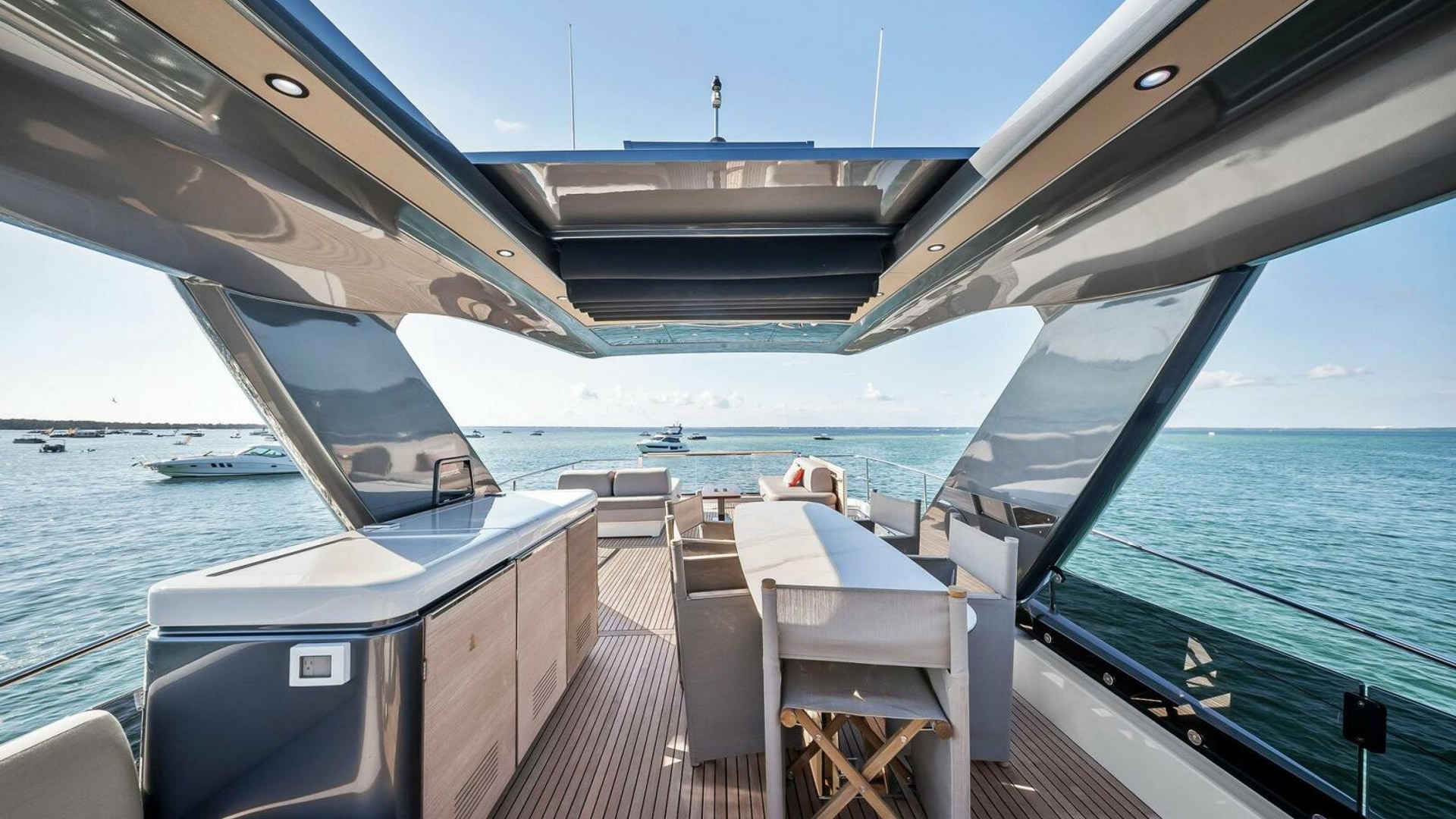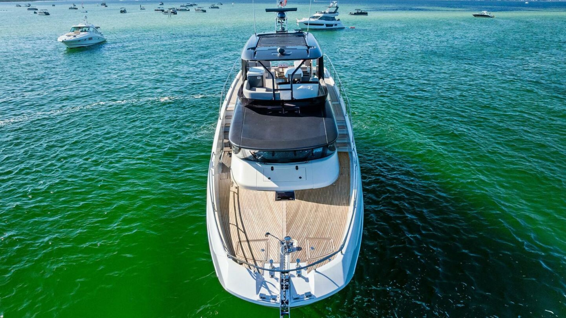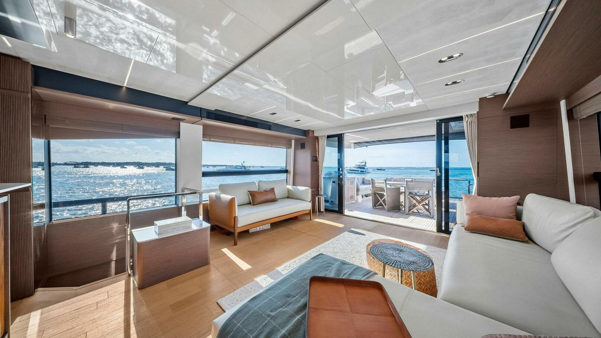 - Helm with Garmin Chartplotters, Volvo IPS Joystick, VHF, Compass, Sounder, Radar, Seakeeper Controls
