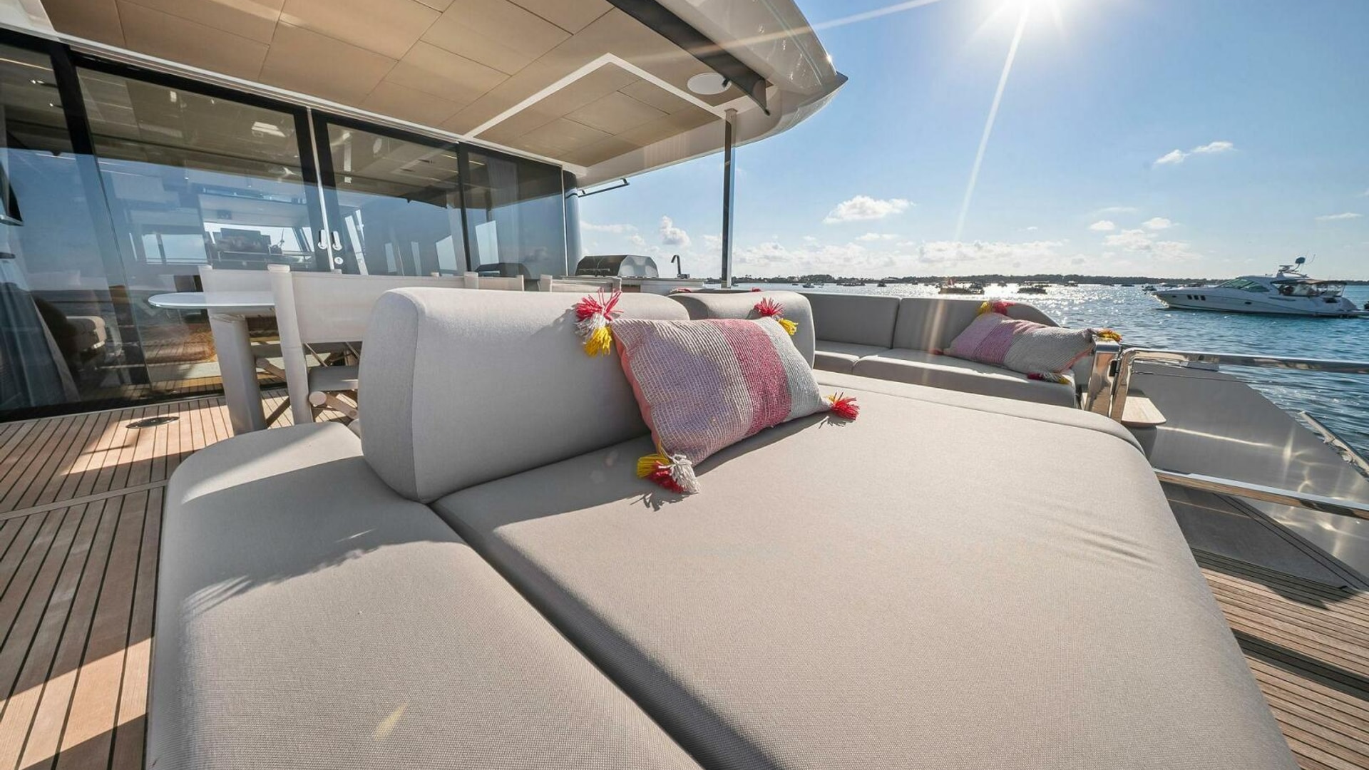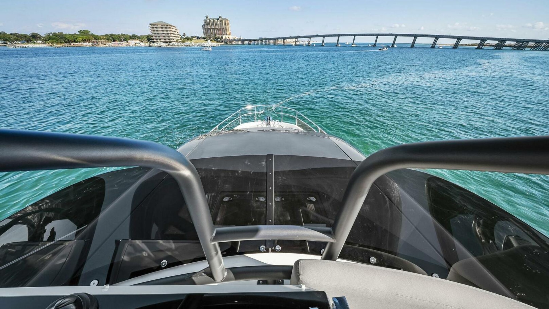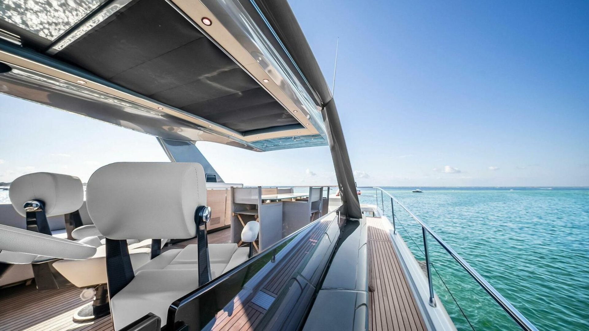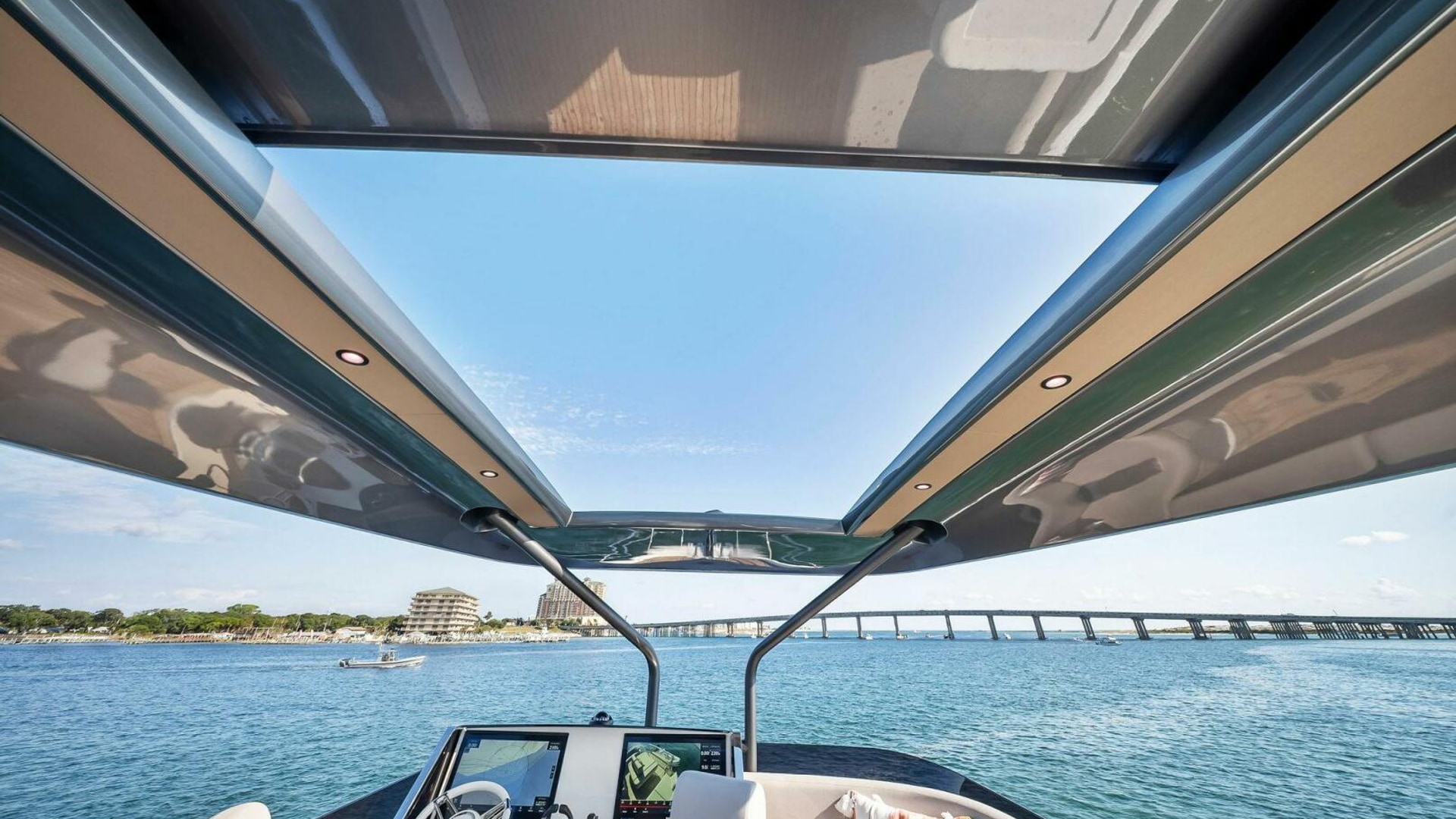 - Helm with Garmin Chartplotters, Volvo IPS Joystick, VHF, Compass, Sounder, Radar, Seakeeper Controls
