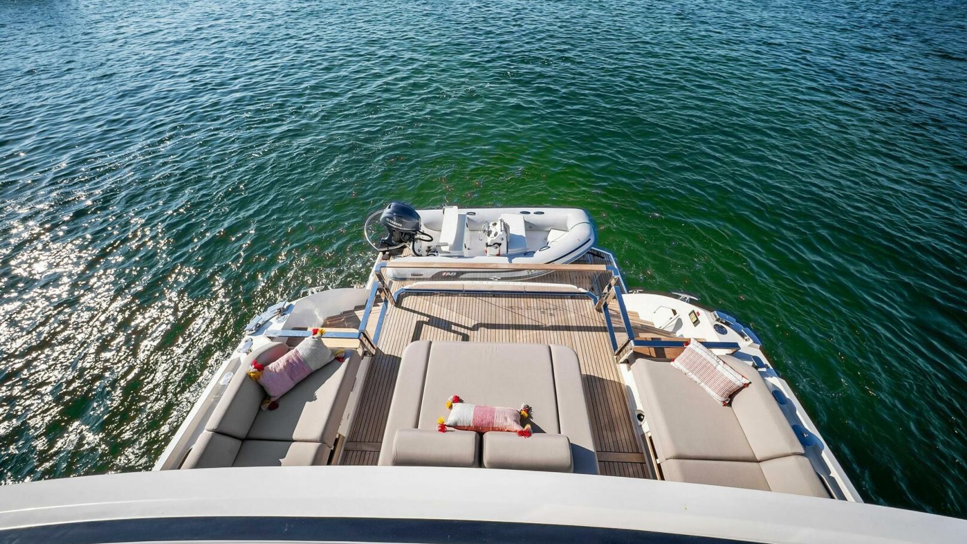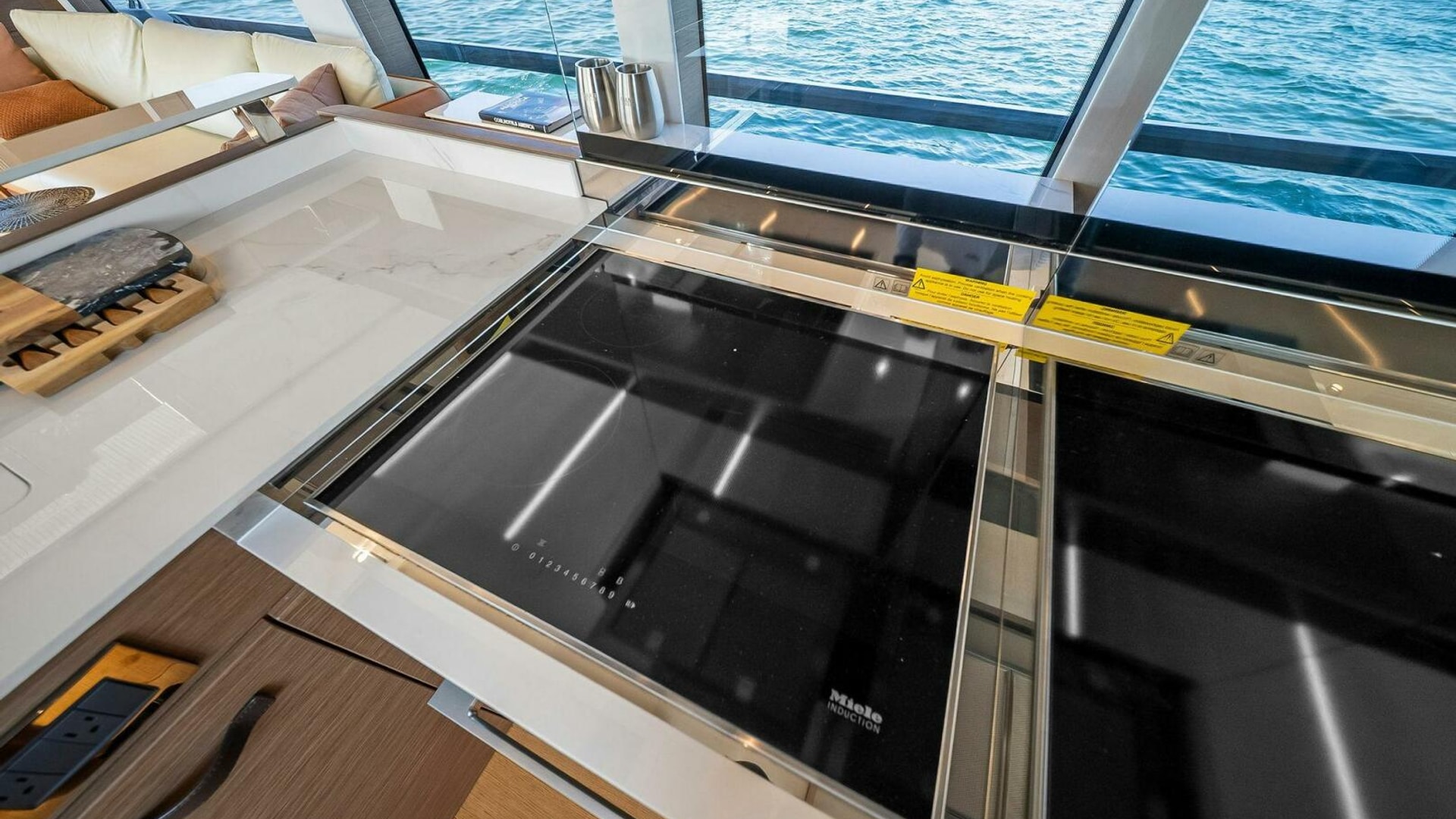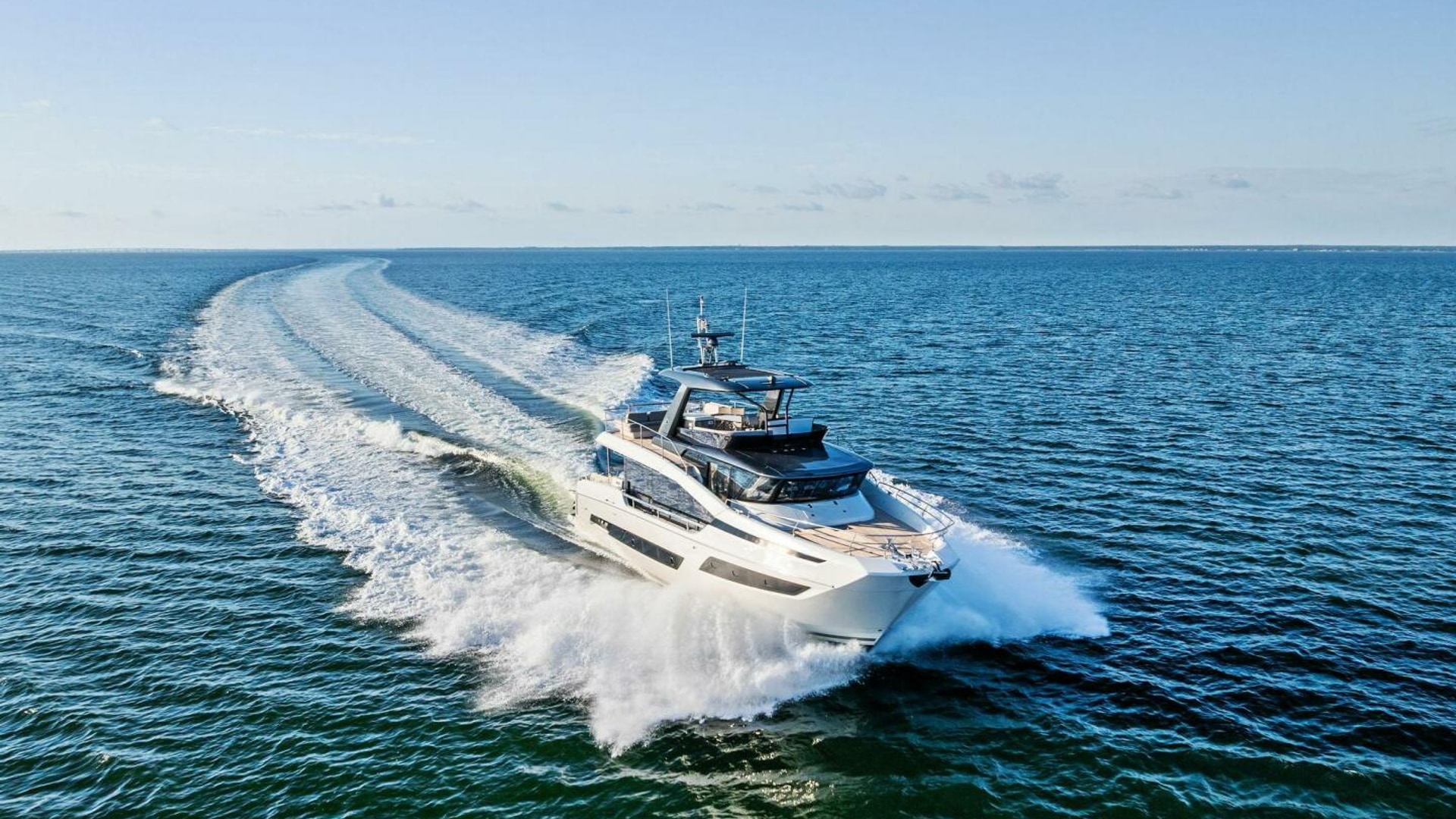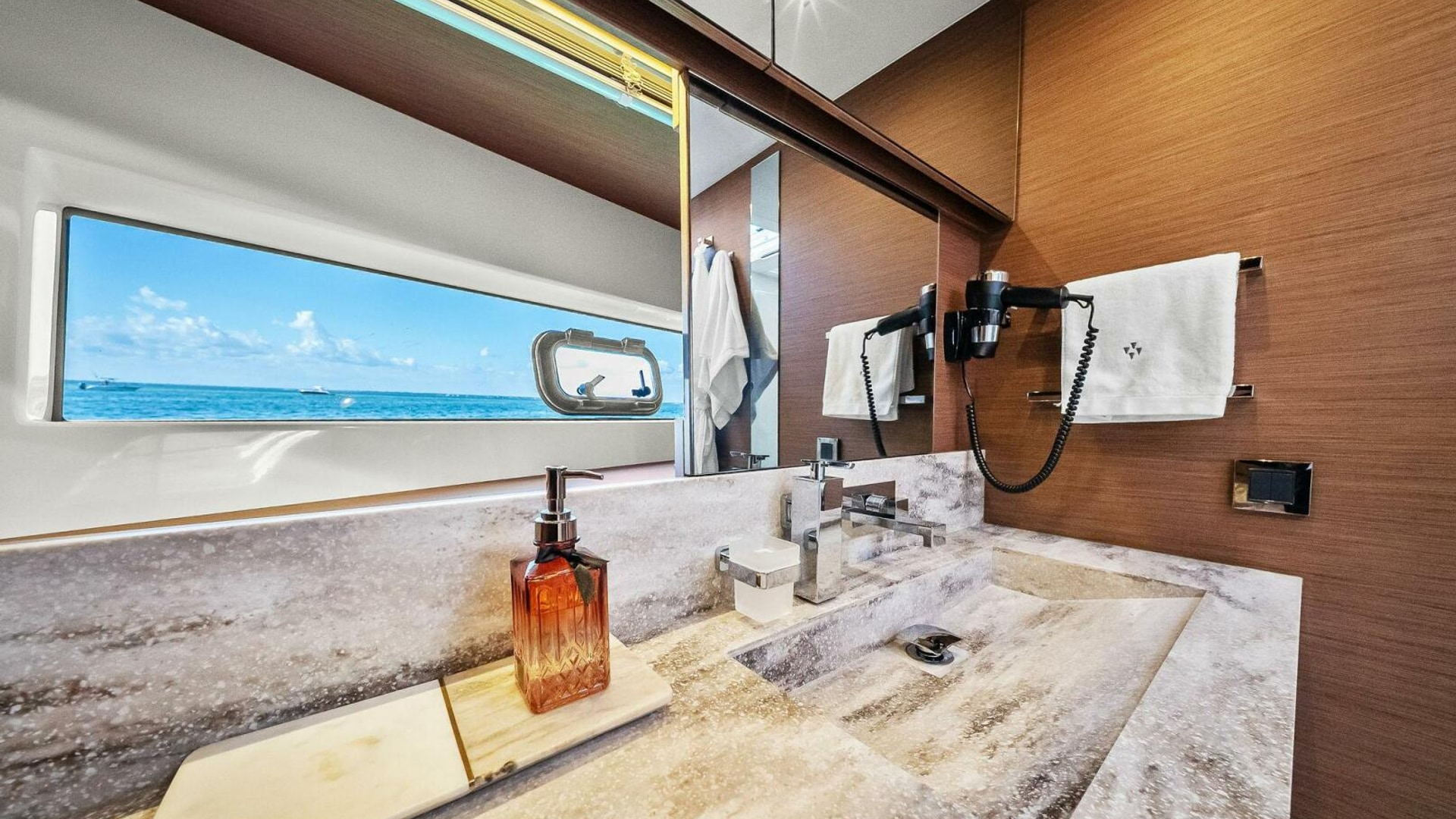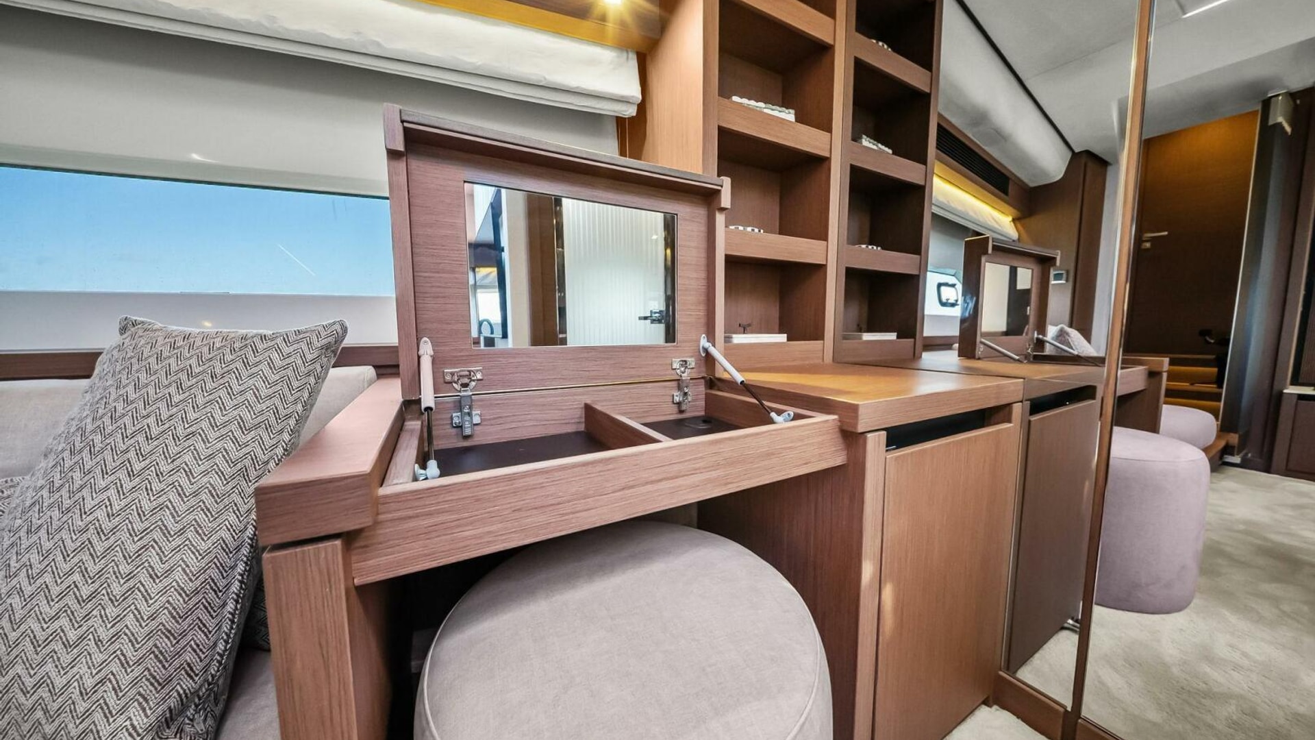 - Helm with Garmin Chartplotters, Volvo IPS Joystick, VHF, Compass, Sounder, Radar, Seakeeper Controls